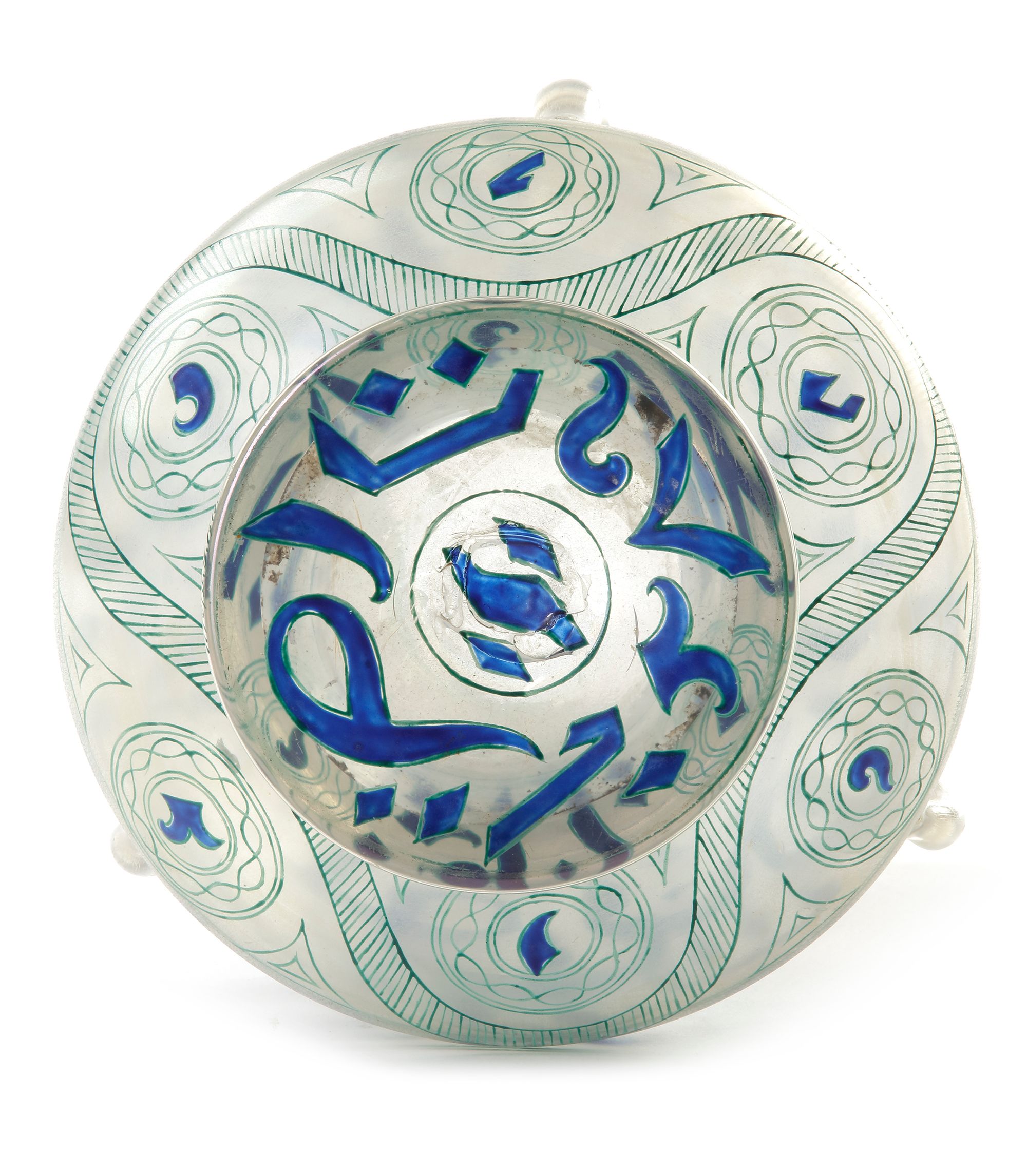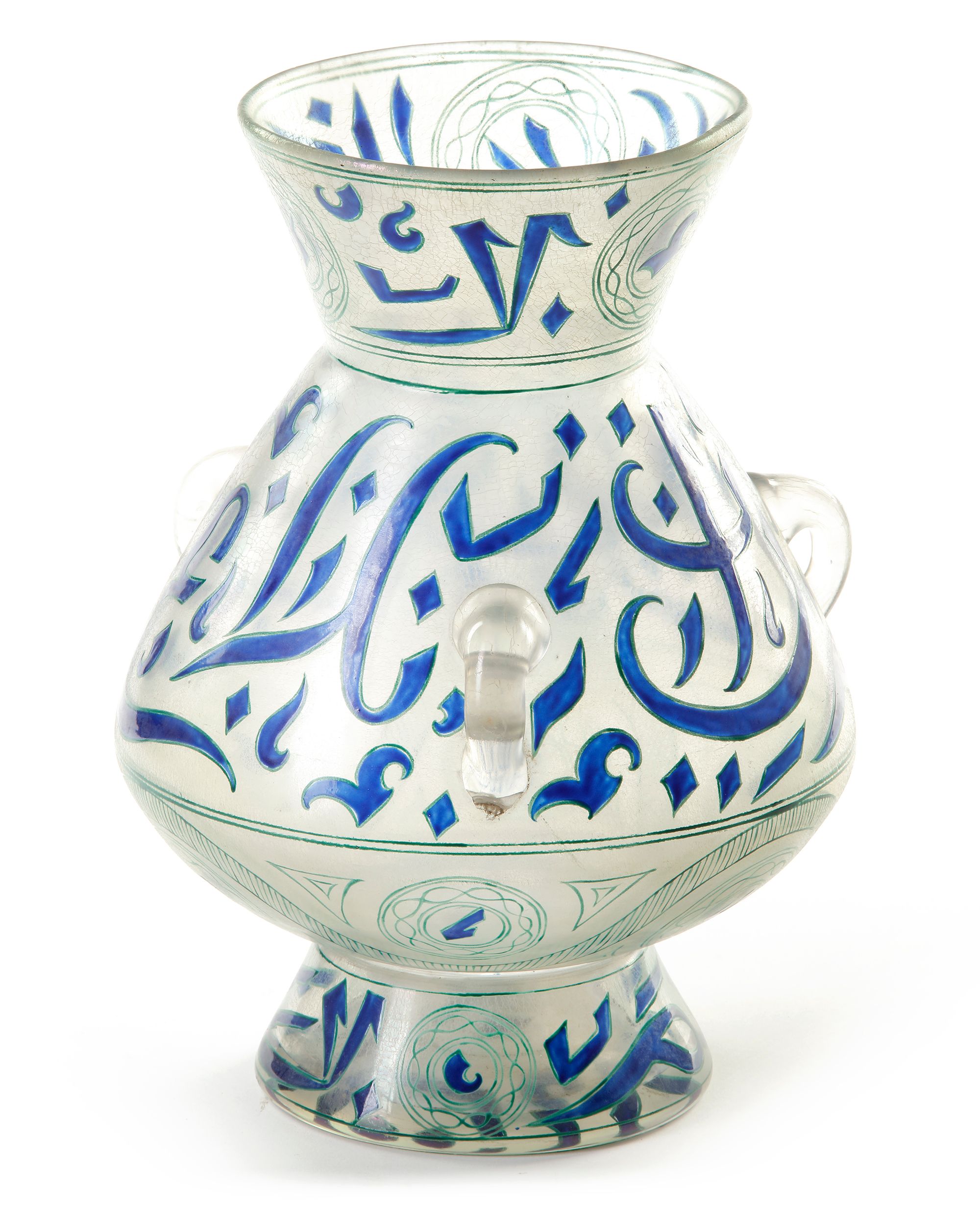 An Islamic Mamluk style Mosque oil Lamp, with a large round bulbous body rising to a narrower waist, above which the top section is flared. Standing a foot so it can be placed on a surface, but suspended by chains that went through three of loops on the outside of the body. it was made in France following the style of the lamps that were made during the Mamluk dynasty in Egypt and Syria.Decorated and gilt with panels enclosing an Arabic inscription and interspersed by foliage sprigs and flowers.