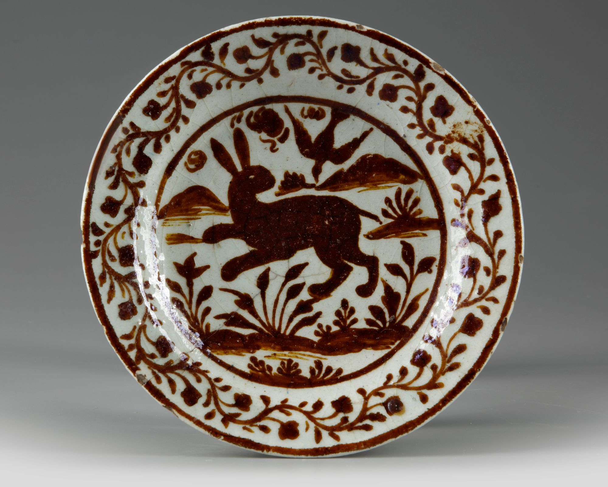 Standing on a small foot with a sloping rim, decorated on a crackle glaze in brown with a central medallion enclosing a predatory bird chasing a rabbit in a landscape, the sides with a continous foliage scroll.