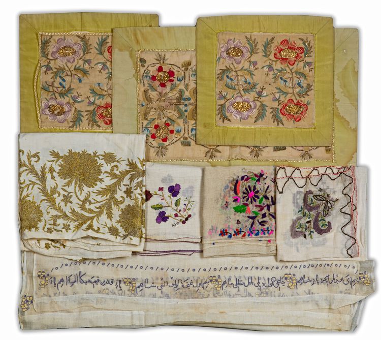 A group of nine brocades embroidered in gilt and silver threads with flower heads, colorful flower sprays and Ottoman Turkish inscriptions.