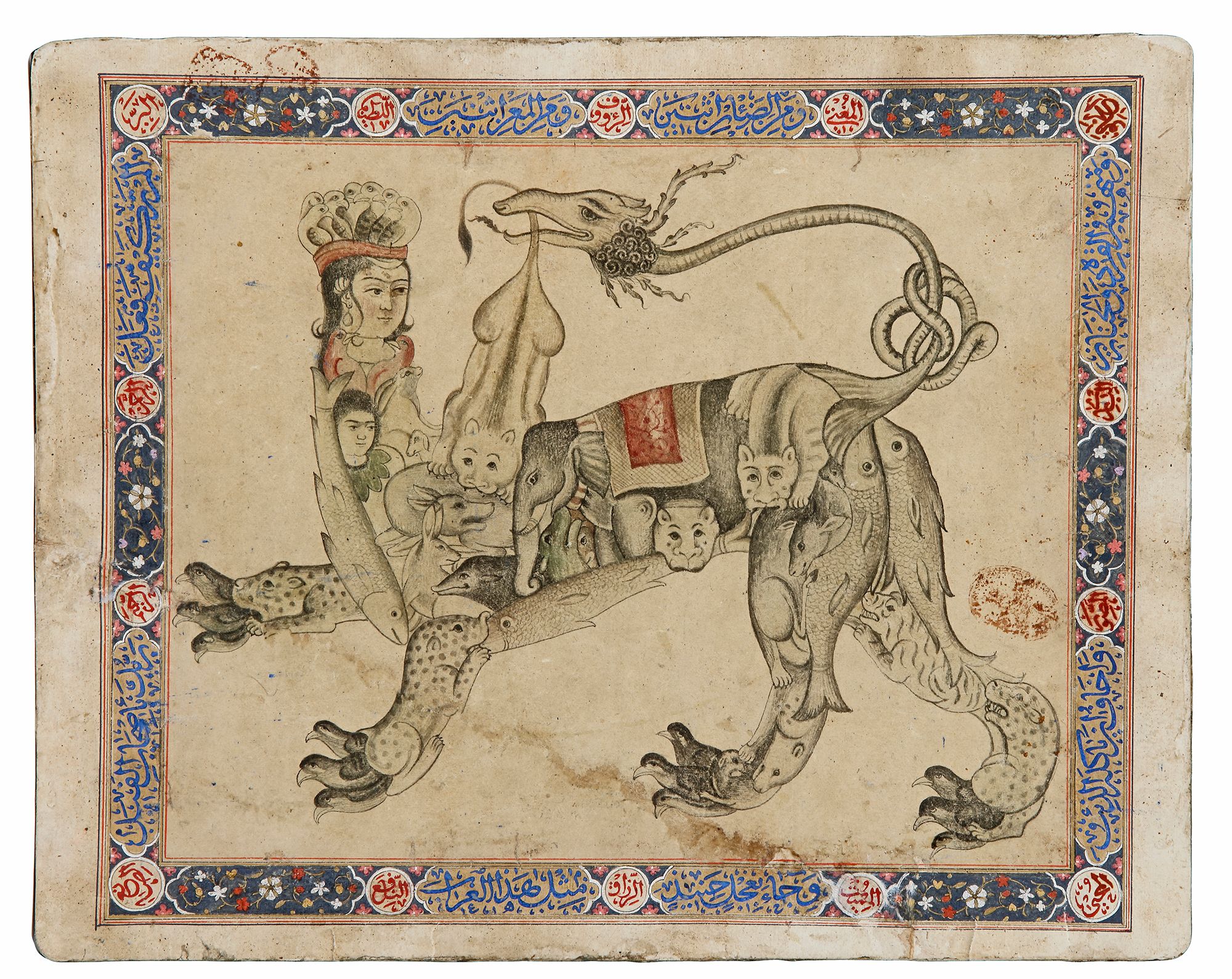This buraq is emblematic of the Deccan’s cosmopolitanism. many visaul tradition are interwined in this image cousing through Central Asia, Turkey and Iran but at the centre, most prominently placed, is the elephant that is native to India, tenderly sheltering a frightened deer. Painting : 22 by 26 cm.