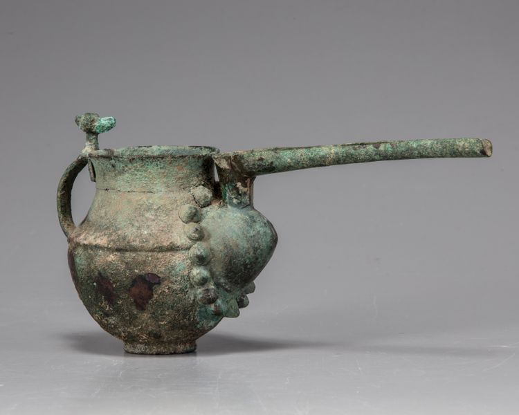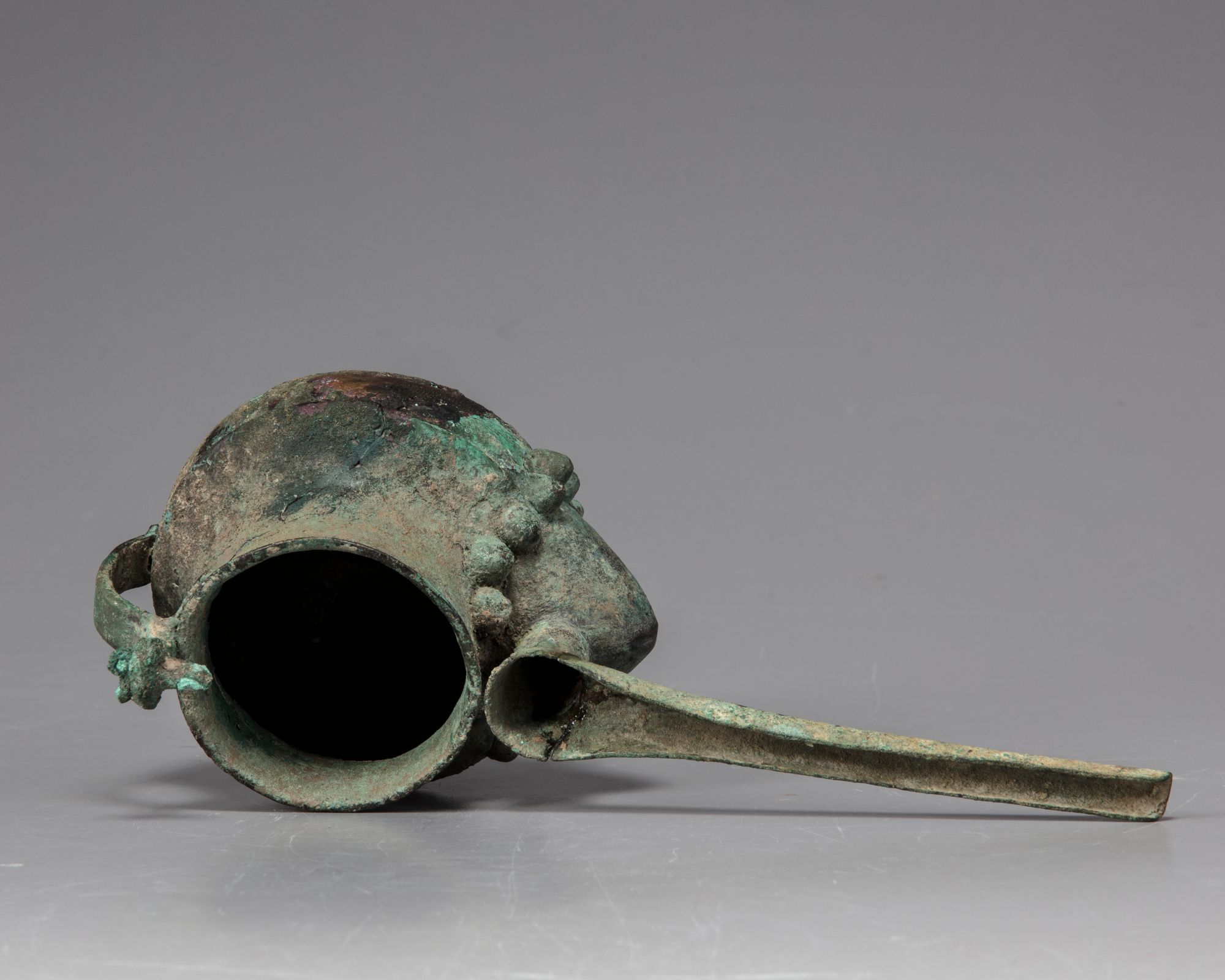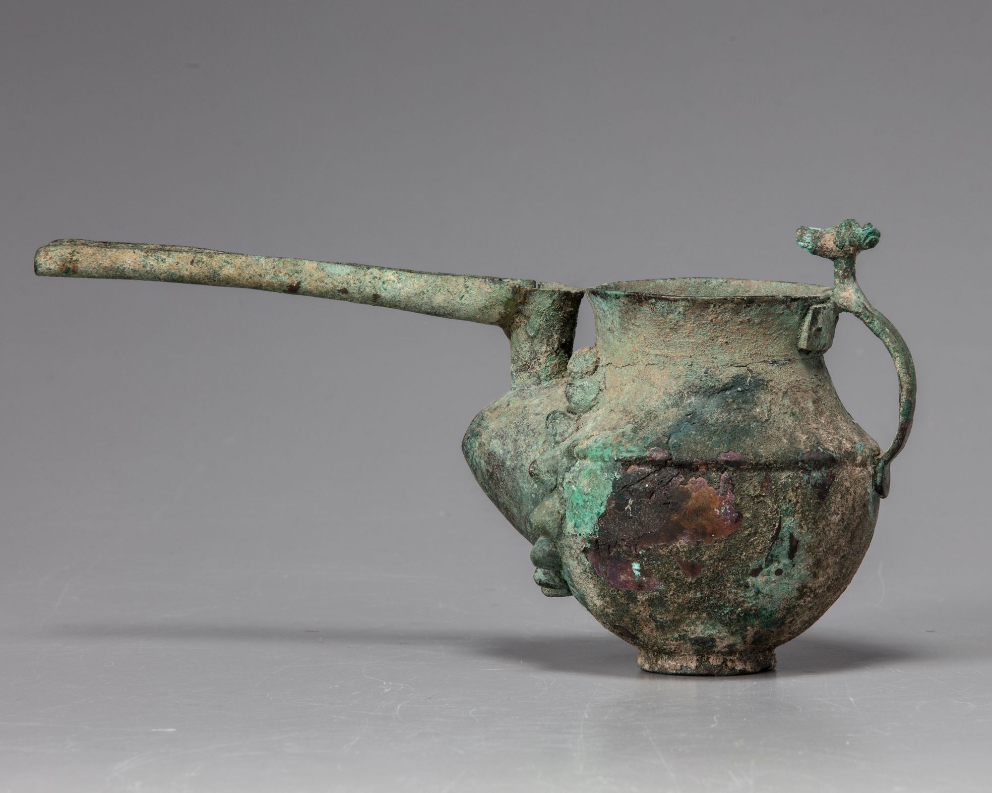 Persian luristan bronze spouted vessel. The vessel is made of thin sheets of bronze, giving it a thin walled body. There is a pinched or channeled spout, the base of which was decorated with raised lines and surrounded by pellets.Vessels such as these were perhaps used for filling lamps or for pouring ritual oils in religious ceremonies. In profile, it resembles a graceful abstract bird, with a long beak and curving neck, circa 600 B.C. - 1200 B.C.