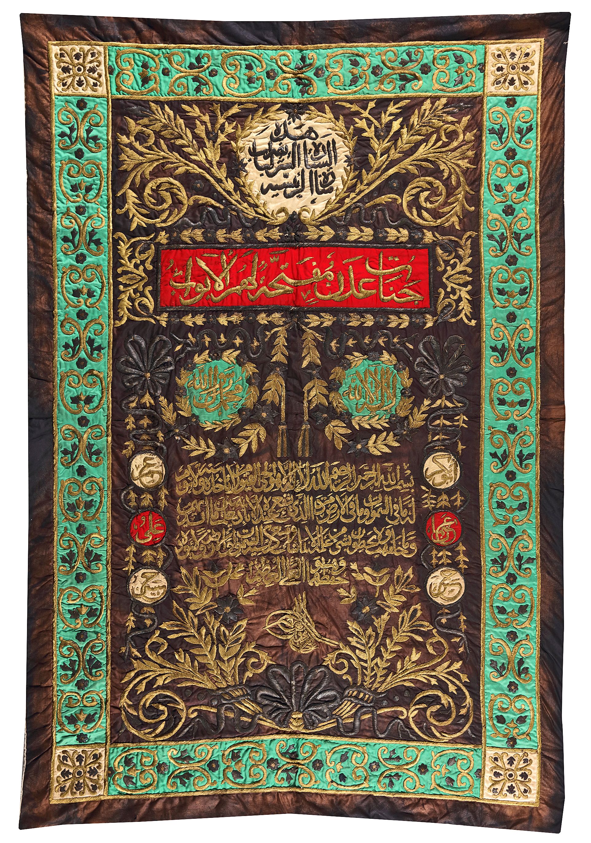 A special textile was made for the internal door of the Kaaba beginning in the 18th century. It is made of black silk with red green silk appliqués, embroidered in silver and silver gilt wires over cotton and sild thread padding. Embroiderd with gilt and silver inlaid wires to the centre with Ayat Al-Kursi (Arabic: آية الكرسي 'āyat ul-kursi) known as The Throne Verse is the 255th verse of the 2nd surah of the Quran, Al-Baqarah. Further decorated with quotations of Quran, names of characters in the islamic history and Arabesques amongst foliage. With the Ottoman Tughra of Abdulaziz (1830-1876)