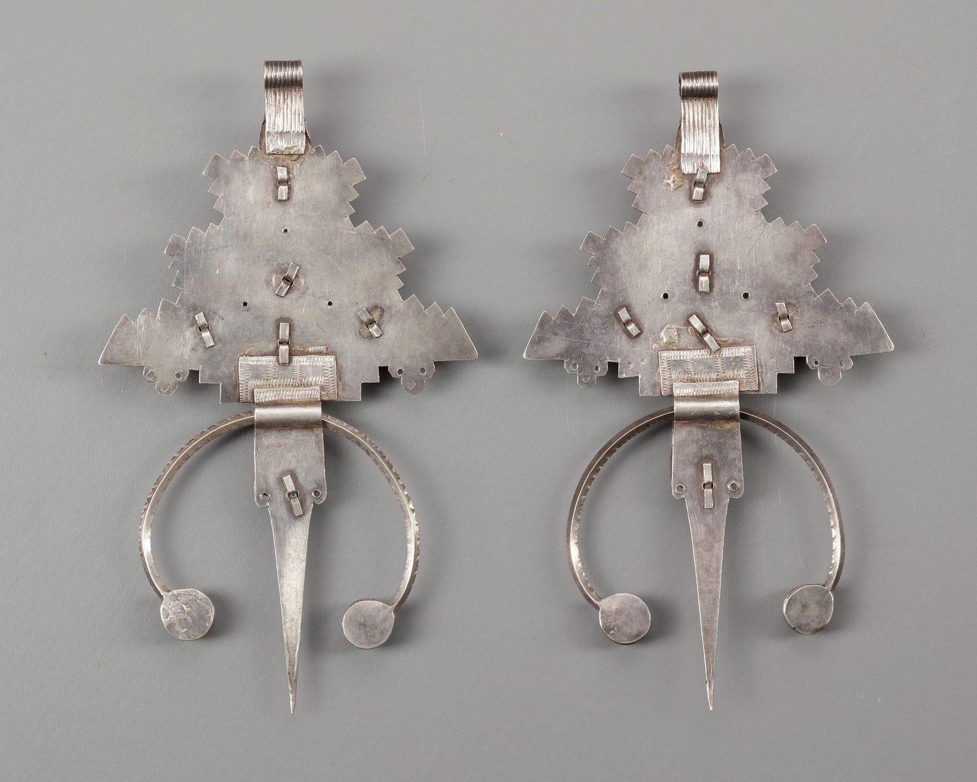 Fibulae were commonly worn by women as an everyday adornment whilst going about daily work as well as on special occasions. It is essentially a cloak fastener, comprising an ornate metal triangular, round or oval shape with detailed etchings in filigree or enamel, and a pin which serves to fasten two layers of material together. They were usually worn as a pair. These type of Fibulae are worn by Berbers, the indigenous ethnic group of North Africa.