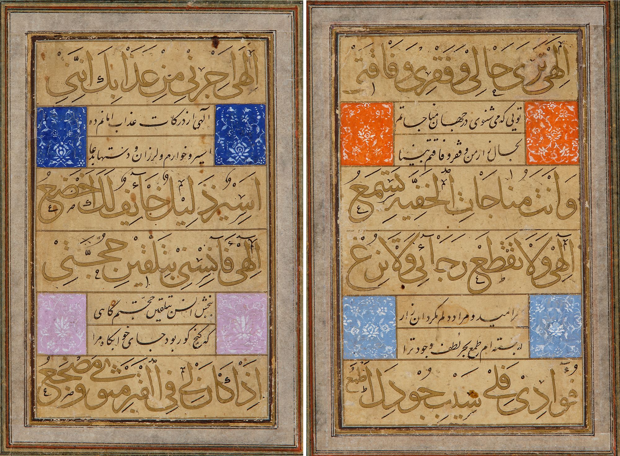 Ink, opaque pigments and gold on paper, 8 lines to each page, Arabic and Persian manuscript on paper, laid down on album page. Four lines of Arabic Du’a or invocation in large gilt thuluth script outlined in black, four lines of Persian translation in black nastaliq script, each line ruled in a gilt and black border. Four squares on both sides with white floral motifs on a polychrome ground. All ruled in gilt and polychrome borders. The outer margin with traces of gilt floral scrolls. 28 by 18 cm.