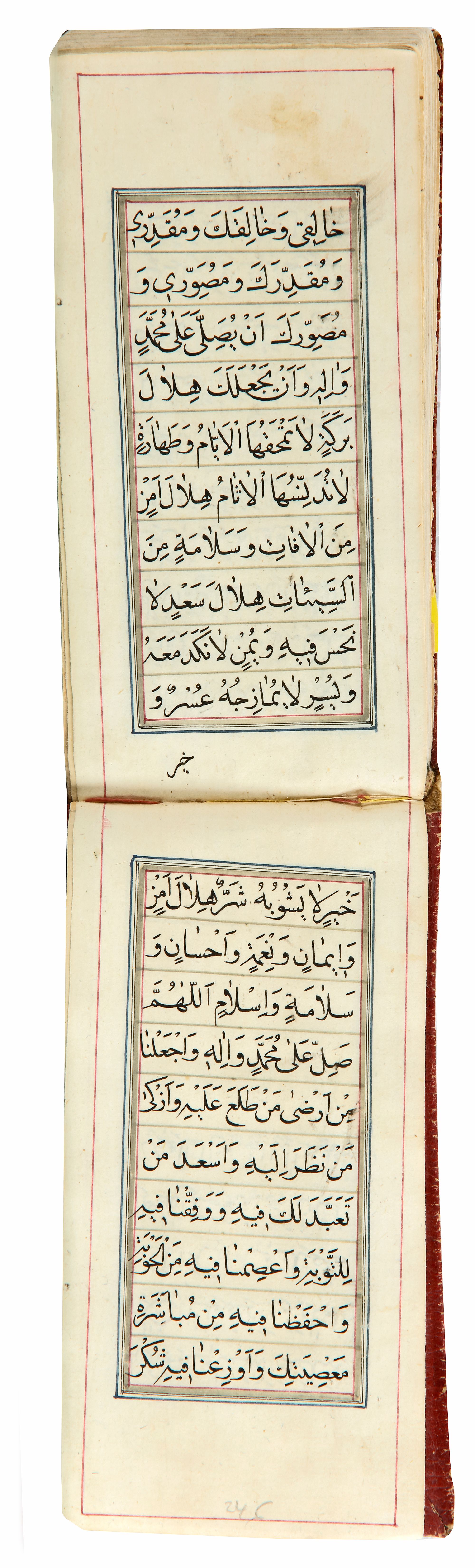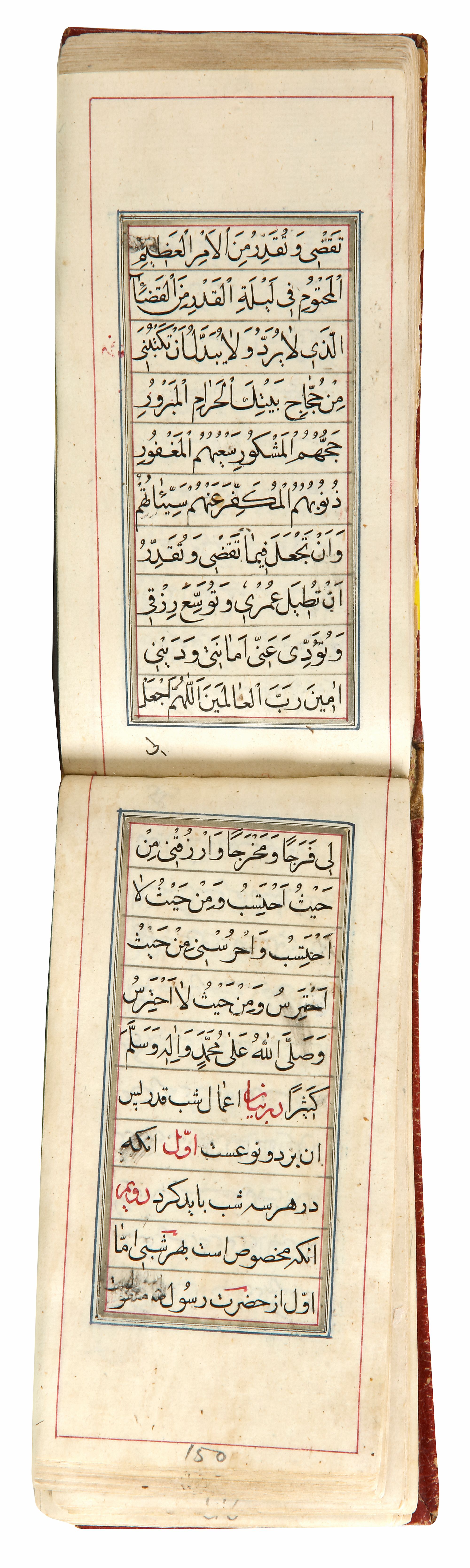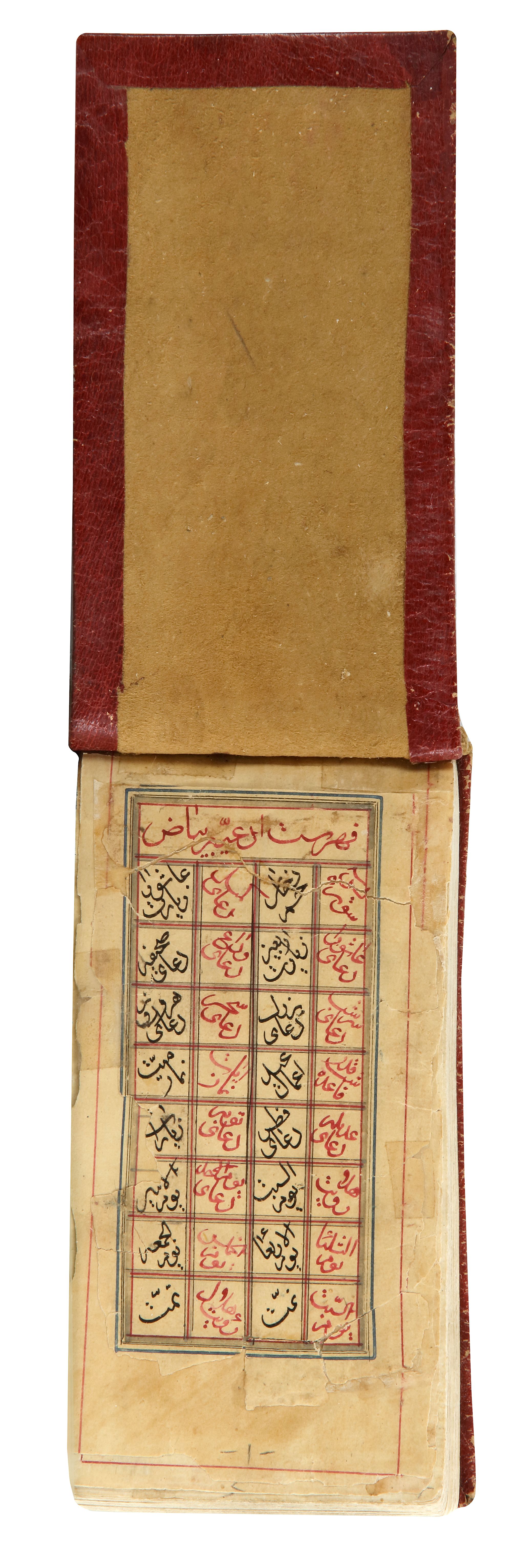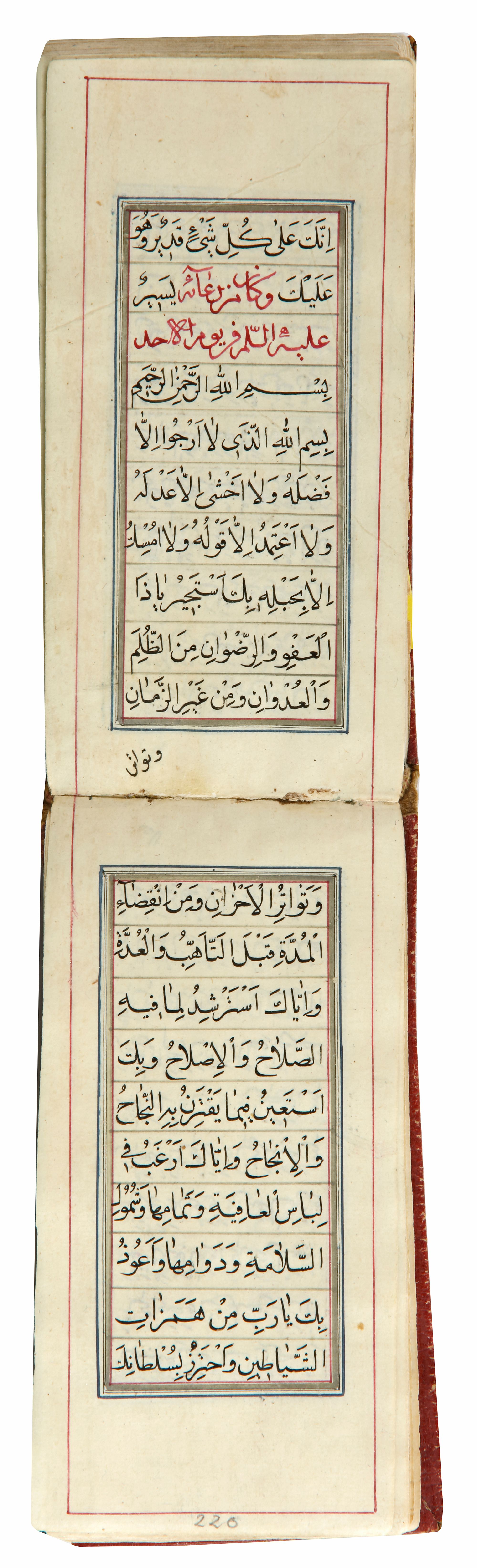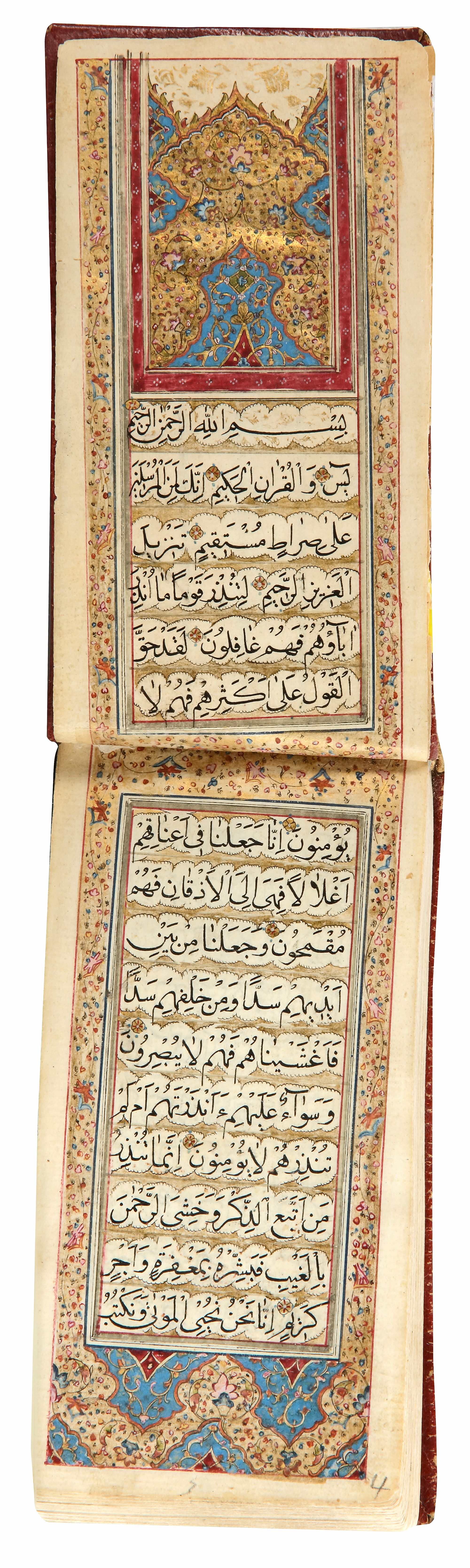 Arabic manuscript on paper, 246 leaves with 10 lines of neat black naskh per page, opening two folios with illuminated header and illuminated floral margins, soft gilt decorated red leather cover.