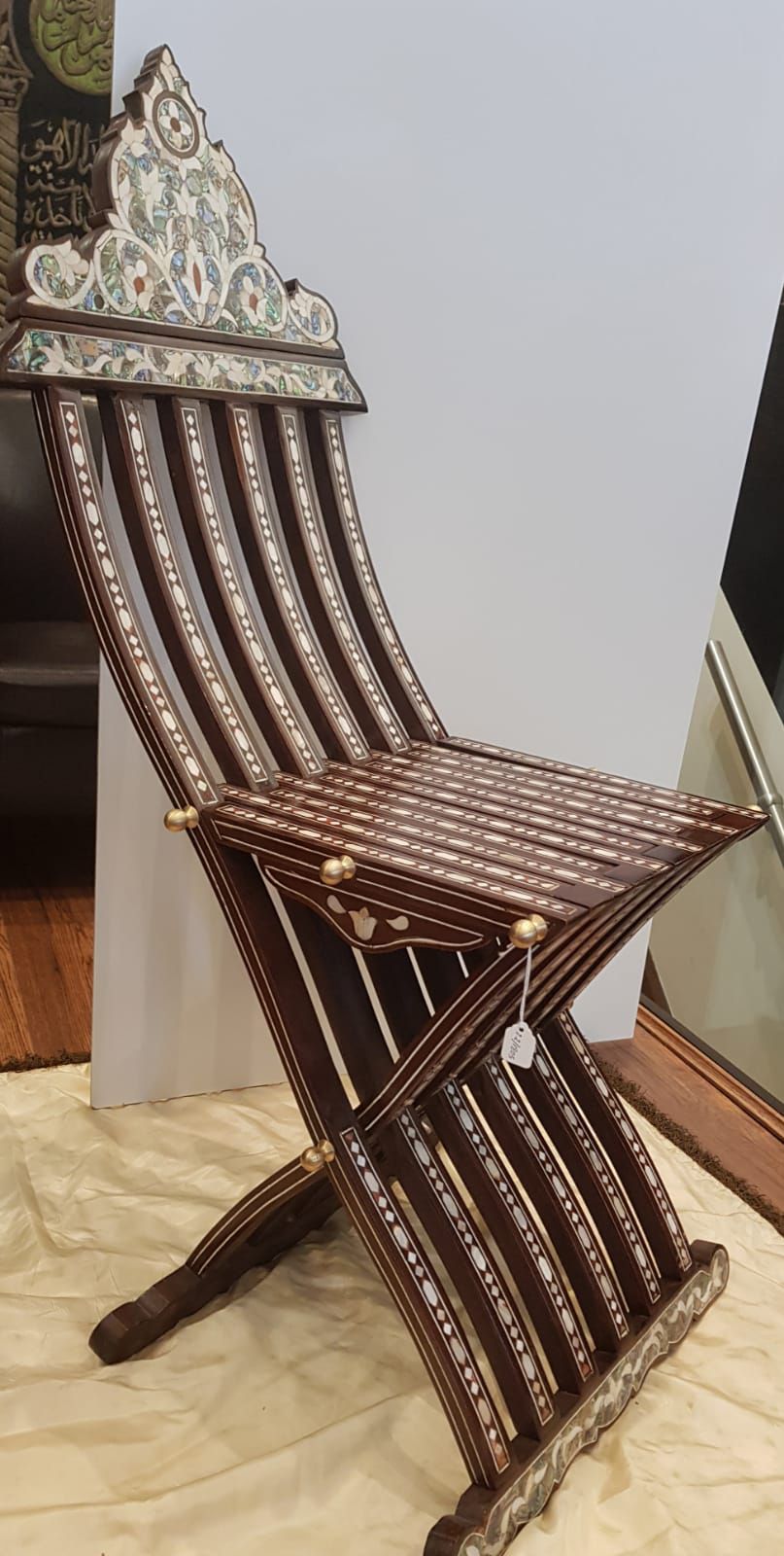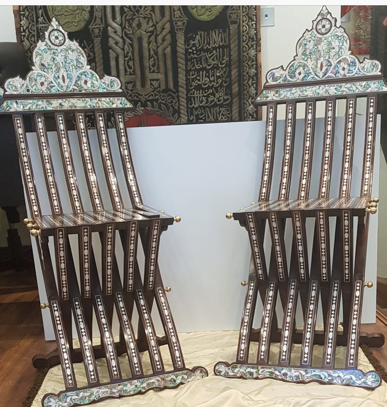Two wooden chairs, inlaid of mother of pearl of white and green color, stylised with bone fragments,