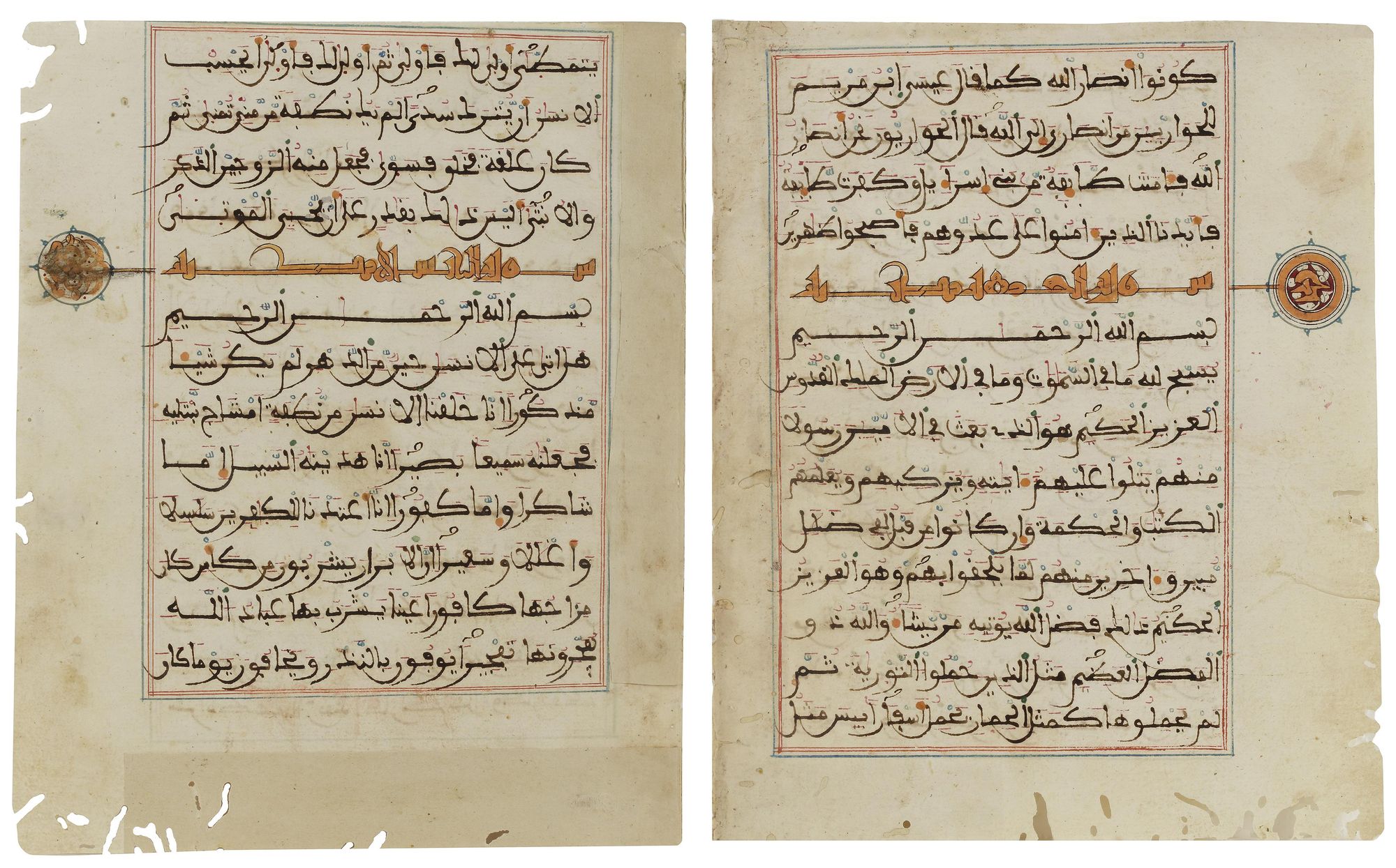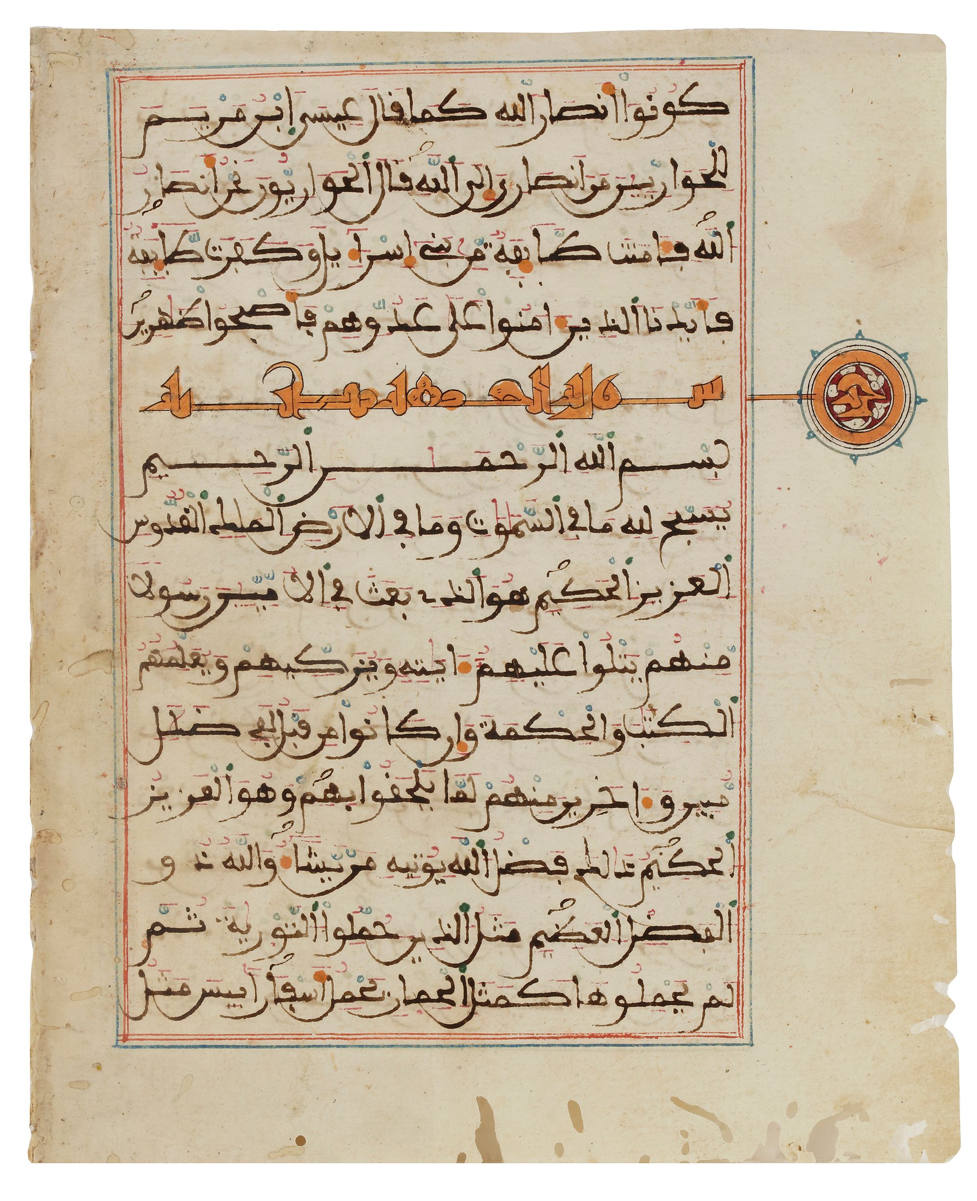 Large gold markers of various shapes decorated with alternating blue and red dots, with surah headings in orange Kufic issuing strapwork palmette in to the margins.