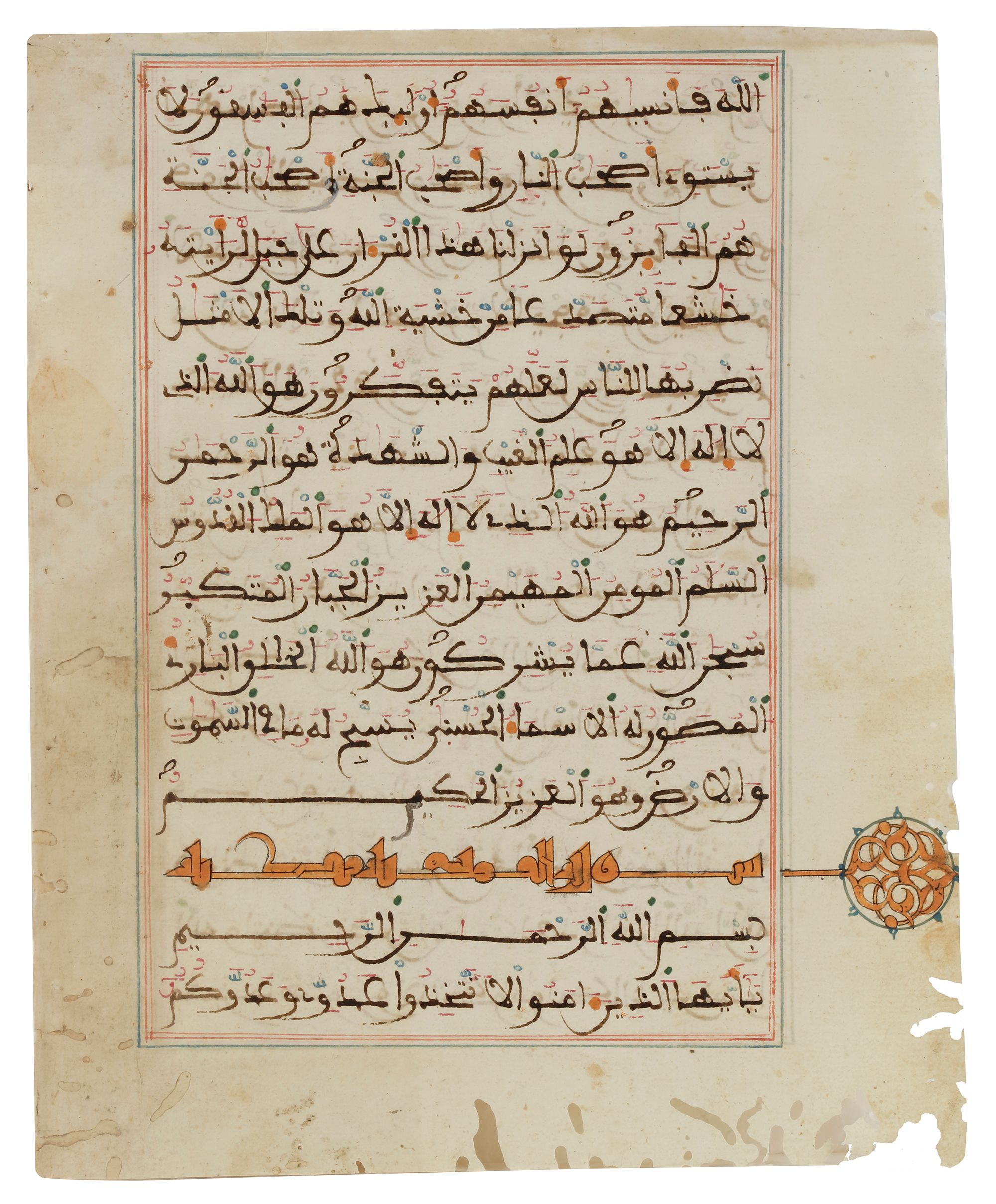 An Arabic manuscript on paper, of 8 leaves and with 14 lines to each page, written in fine Maghribi script in black ink, diacritics in blue and red, reading marks in green orange.