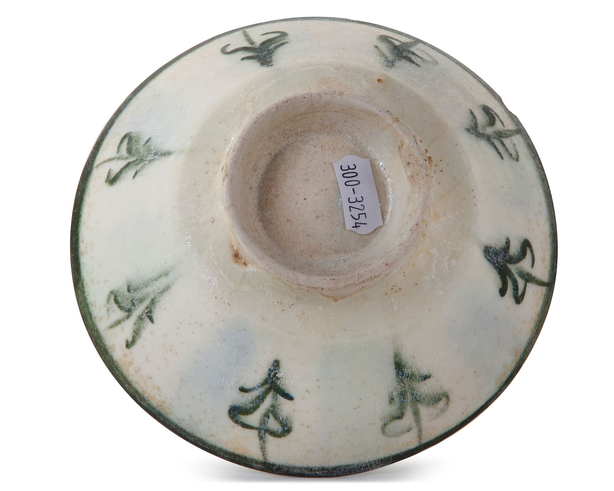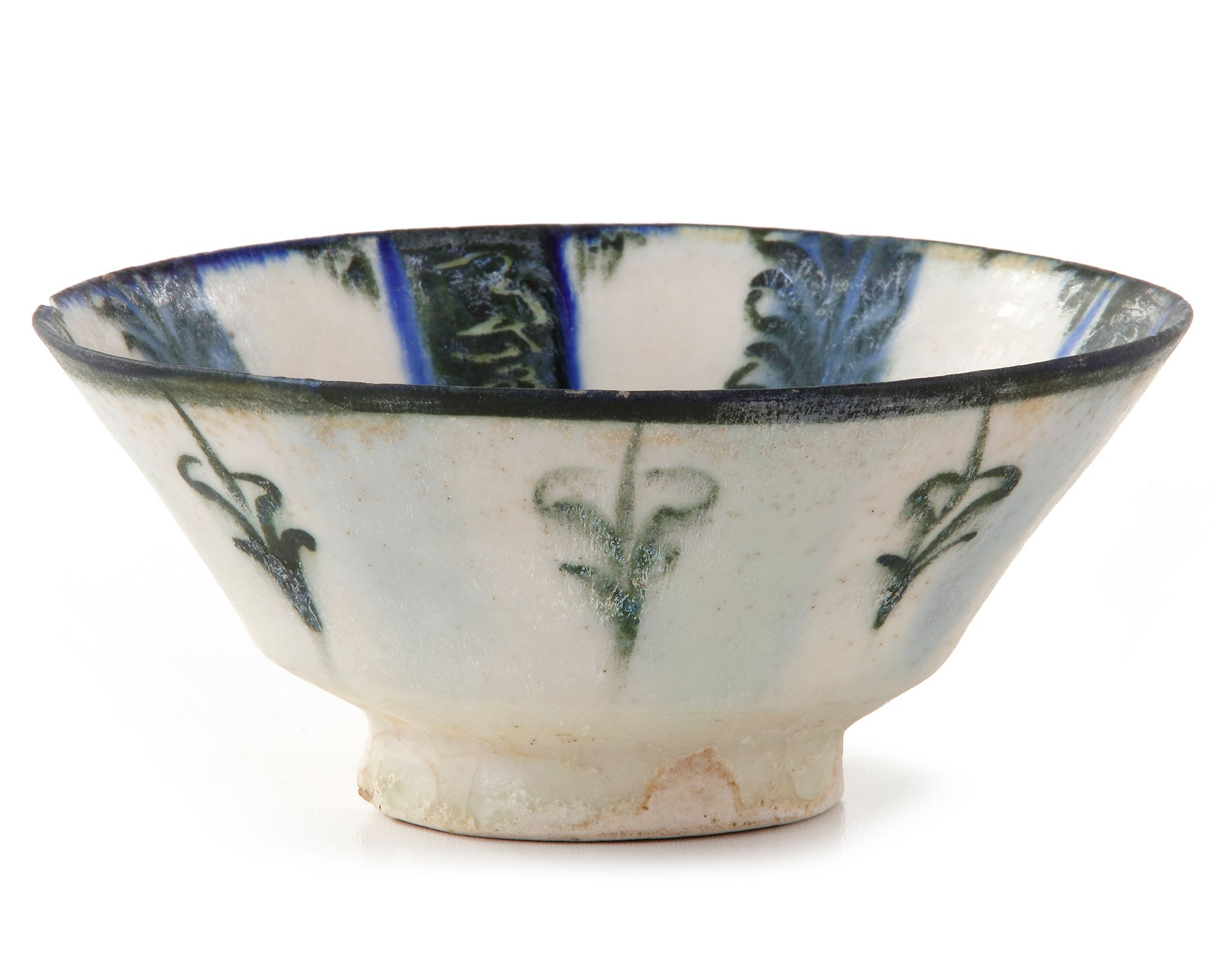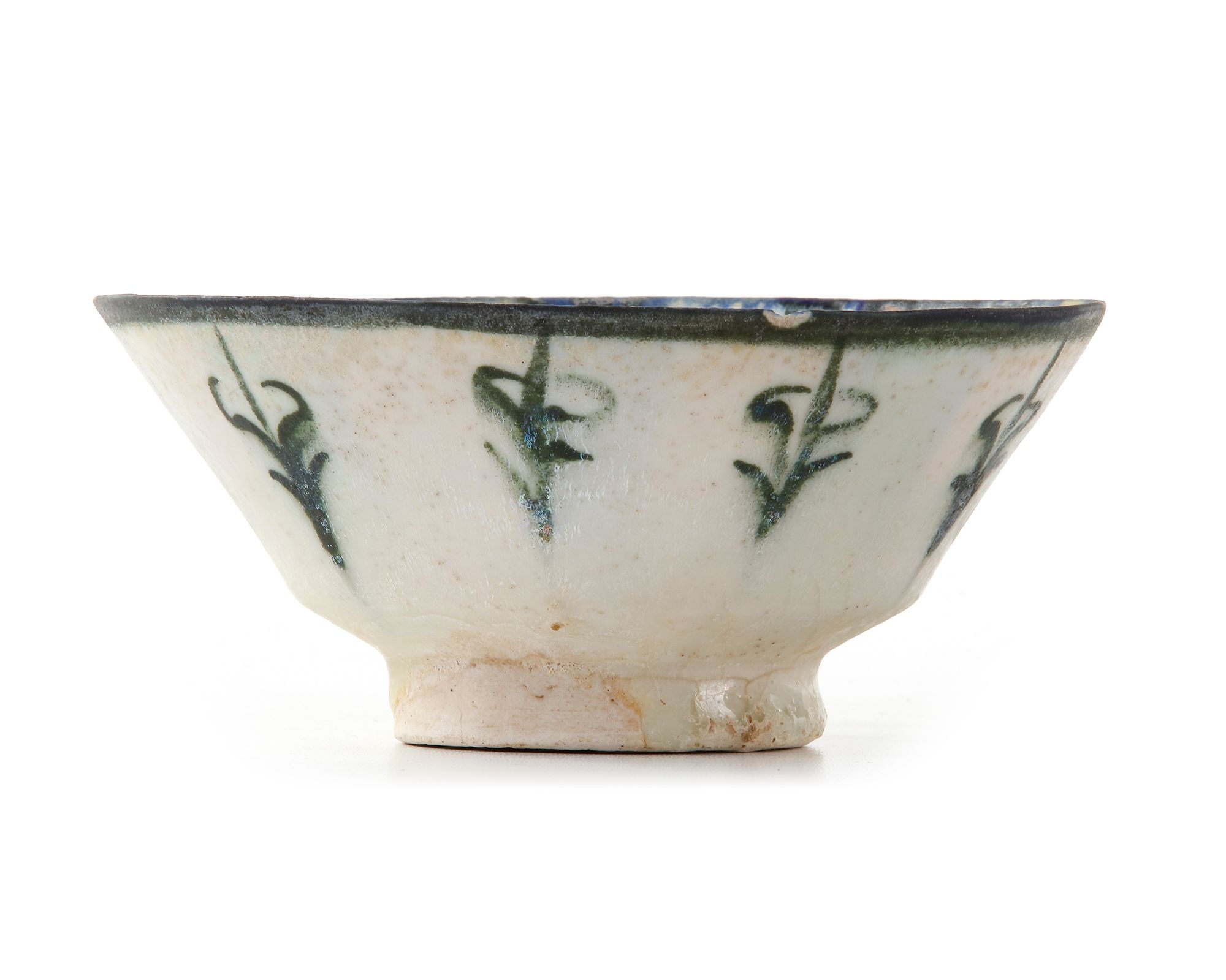 Of truncated conical form with flaring walls stepped down to a straight vertical foot, painted in cobalt blue and black under a transparent colourless glaze, the interior with four radial black bands with naskhi calligraphy scratched in reserve between blue borders, divided by six triangular panels with scrolling waterweed painted in black on a blue and white ground, the reverse with further waterweed motifs.