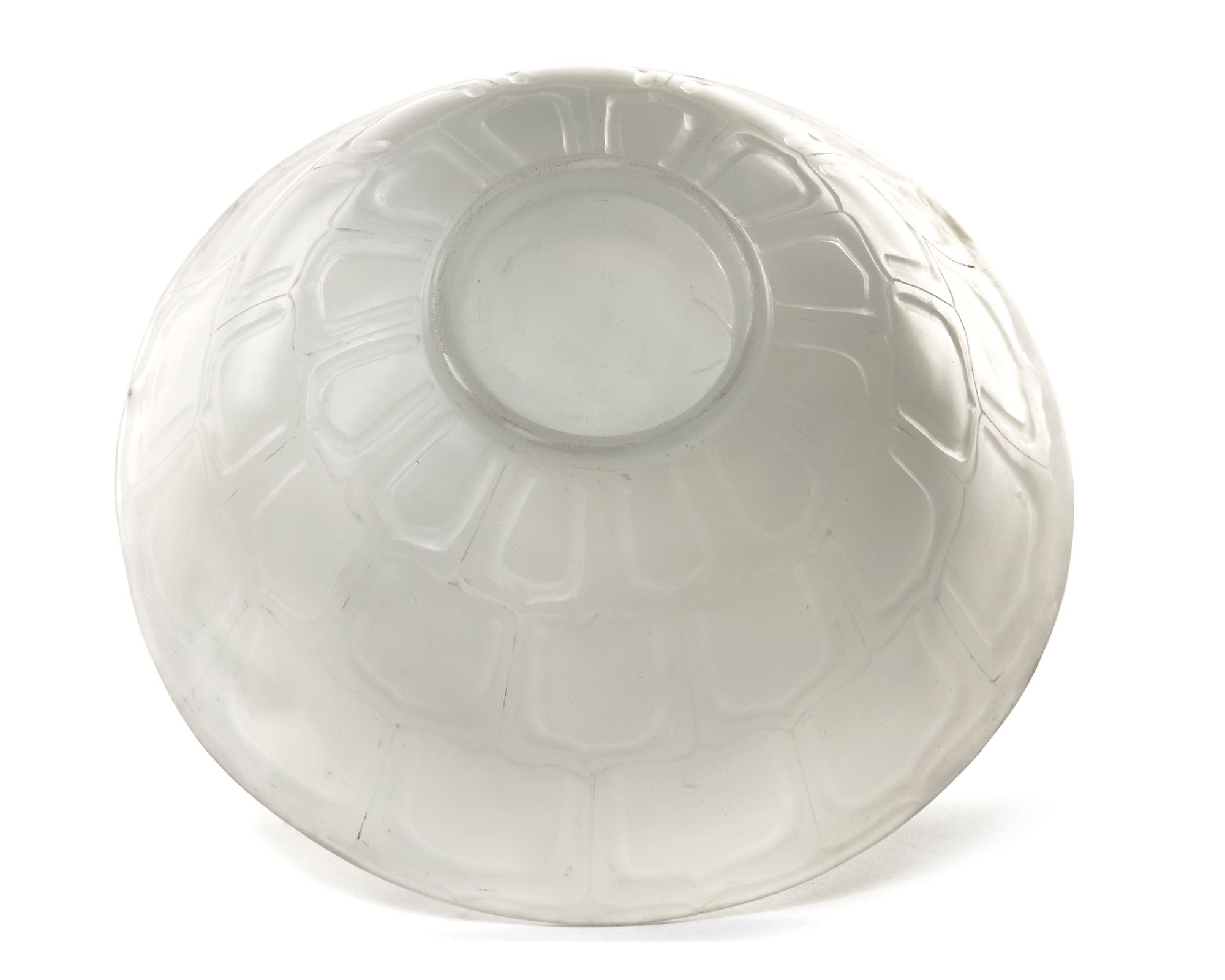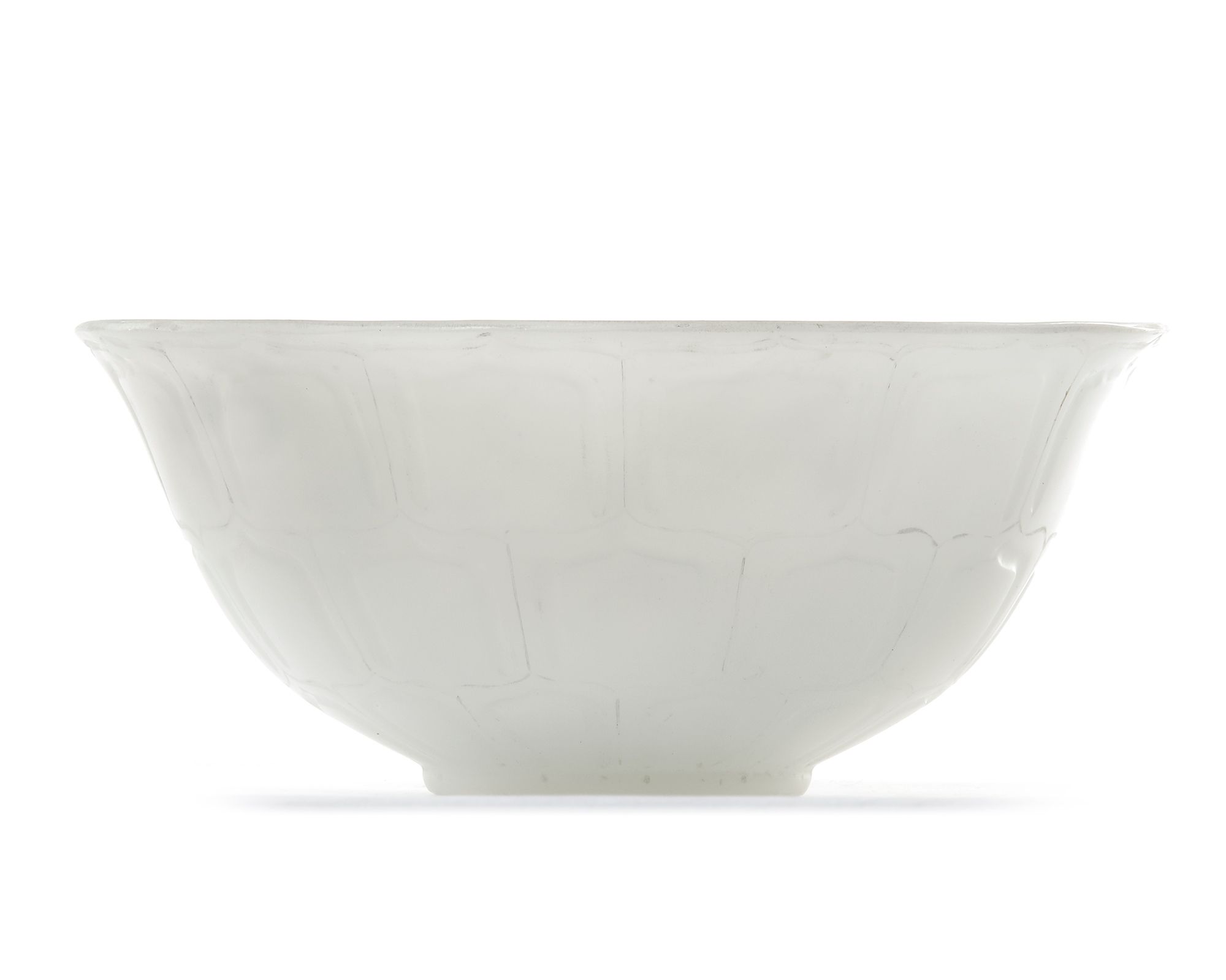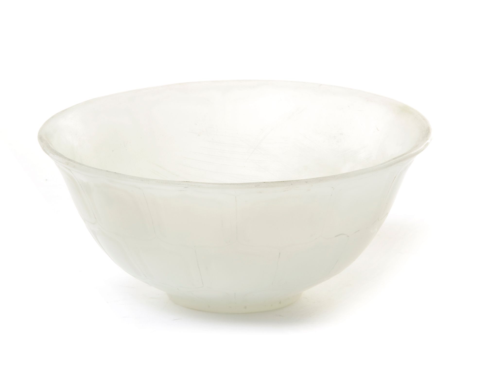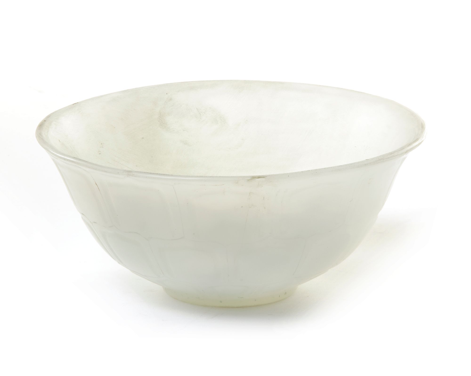 A Mughal jade bowl carved standing on a small foot rind with flaming sides, the exterior carved with three bands of plantain leaves. 7 by 17 cm.