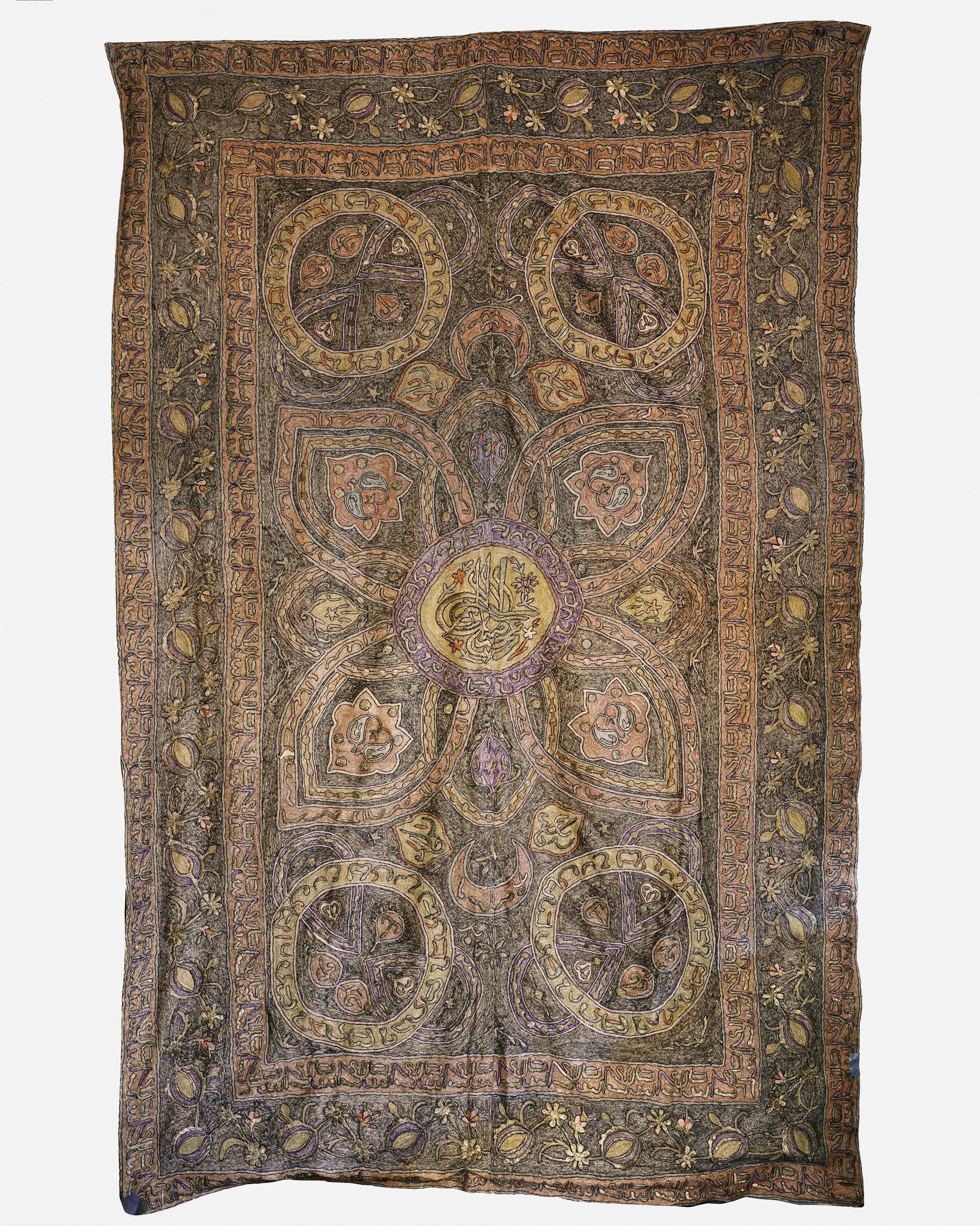 An Islamic embroidered prayer panel, stylised with panels containing "mihrab arches" filled with scrolling vine and flower sprays.
