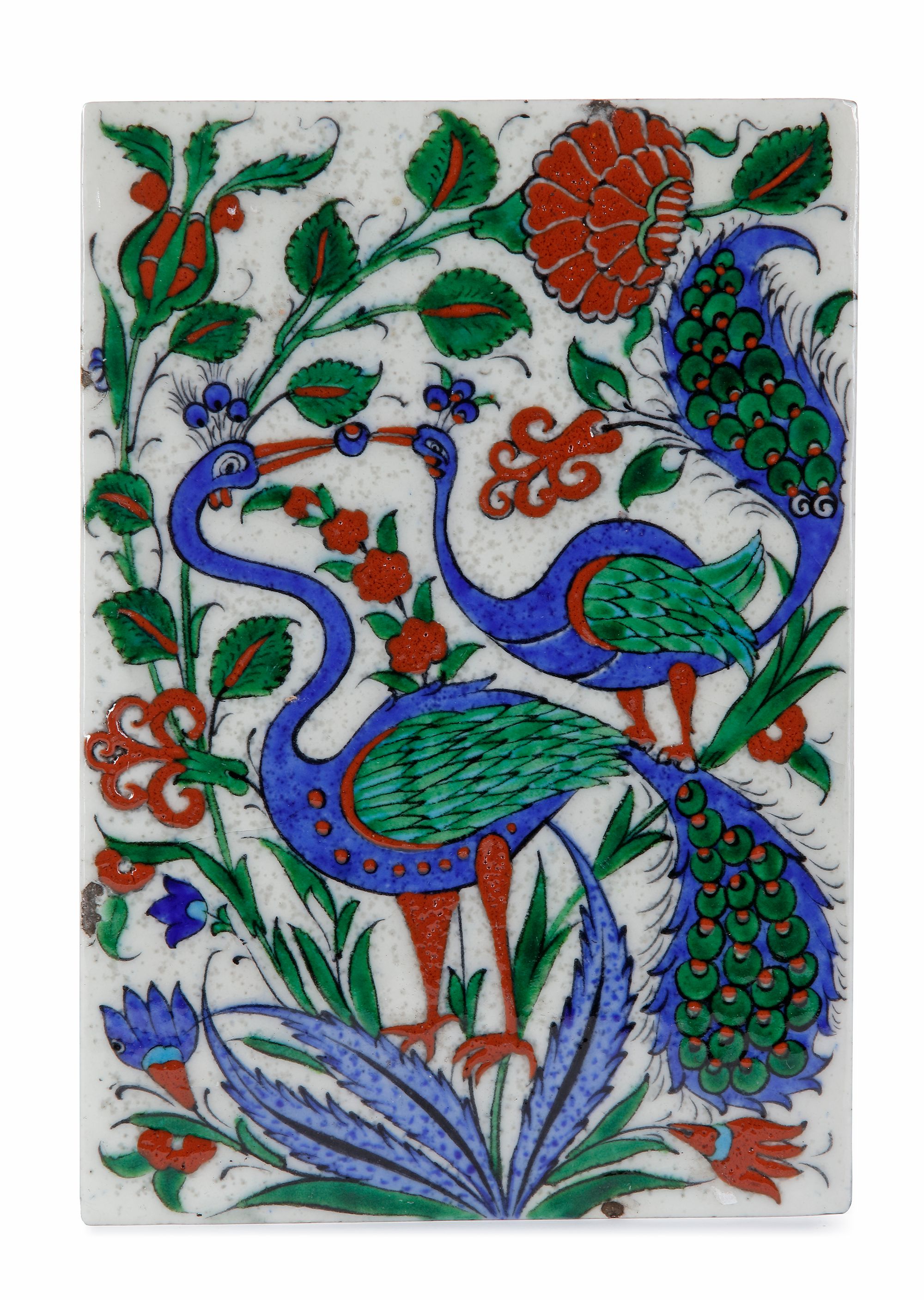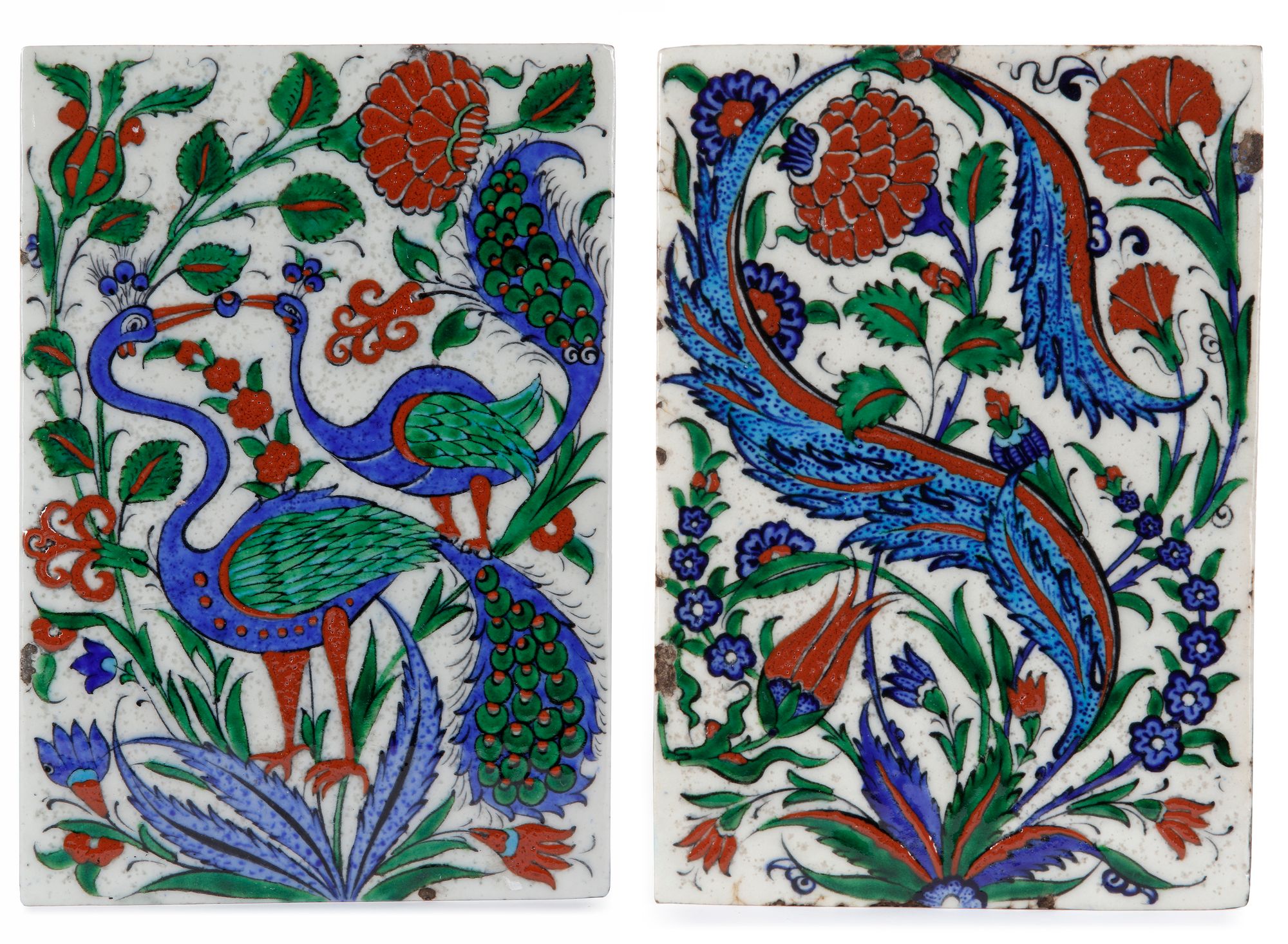 One decorated with tulips, carnations, saz leafs. The other decorated with tulips, carnations, saz leafs and peacocks. 22 x 16.5 cm