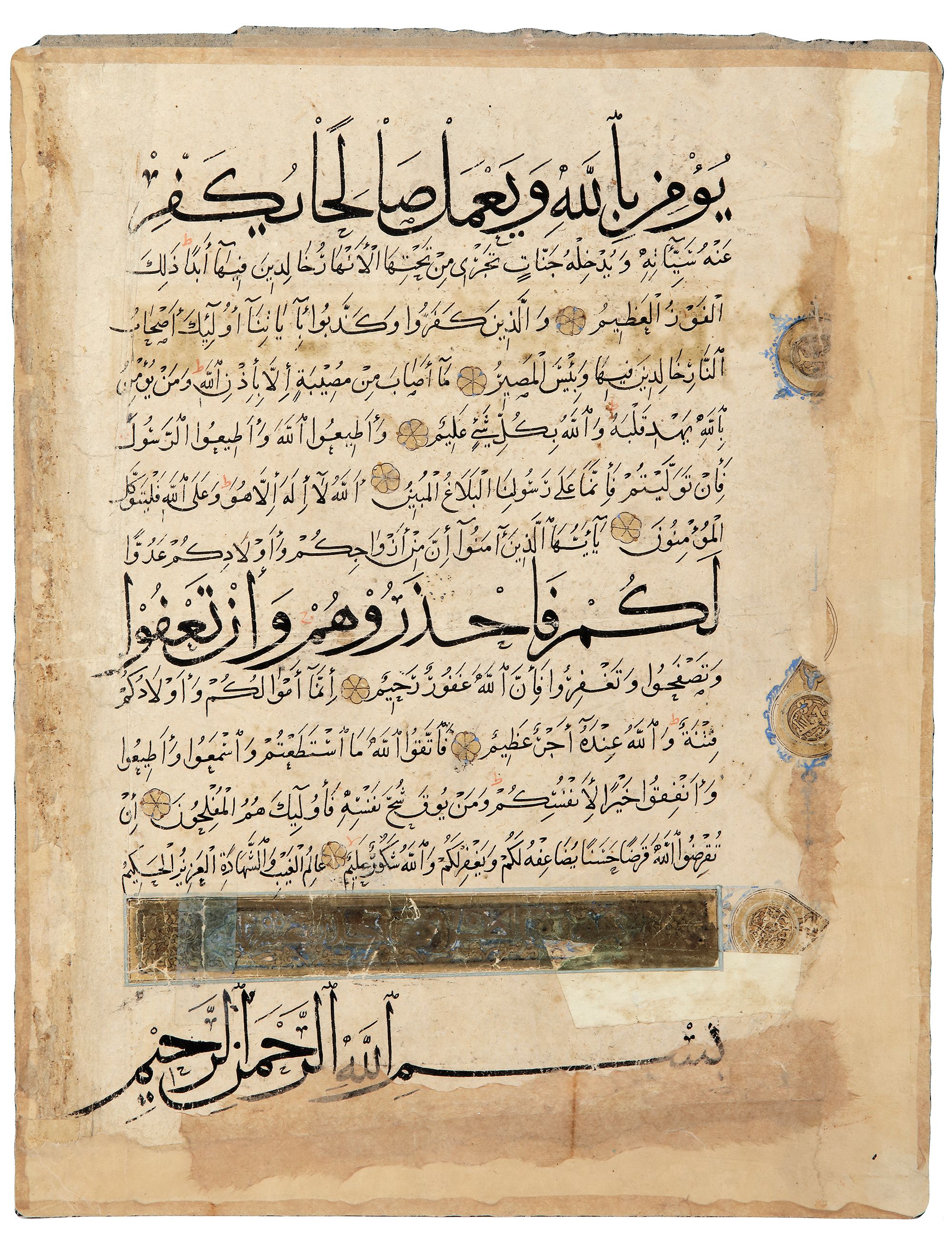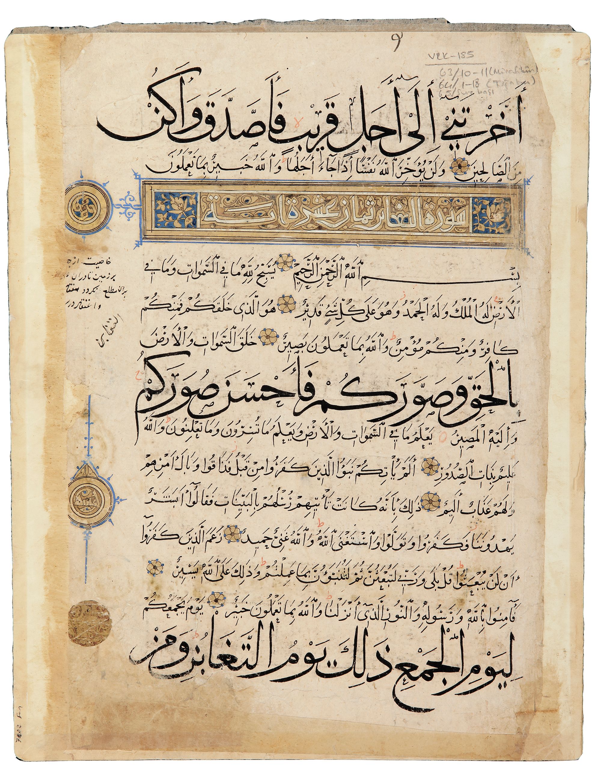 An Arabic manuscript on paper, recto and verso with 13 lines to each page written in black naskh script with gold rosette markers pointed by blue dots. The first, middle and the last line in very strong black ink. Each folio with surah heading composed of white thuluth script outlined in black within a panel set off by squares of gold interlace at each end on an illuminated and extensively gilt ground. Large rosettes indicate each verse within the text, while a gold, pear-shaped device in the margin marks each 5th and 10th verse. Each oneverse is identified in the margin with the word arshar (‘ten’) or khums (‘five’) inside a gold circle with blue border and radiating hair strokes. Surah Al-Munafiqun vv. 11-10, surah Al-Taghabun, and the letterhead of surah Al-Talaq. folio: 38 by 29.5 cm.
