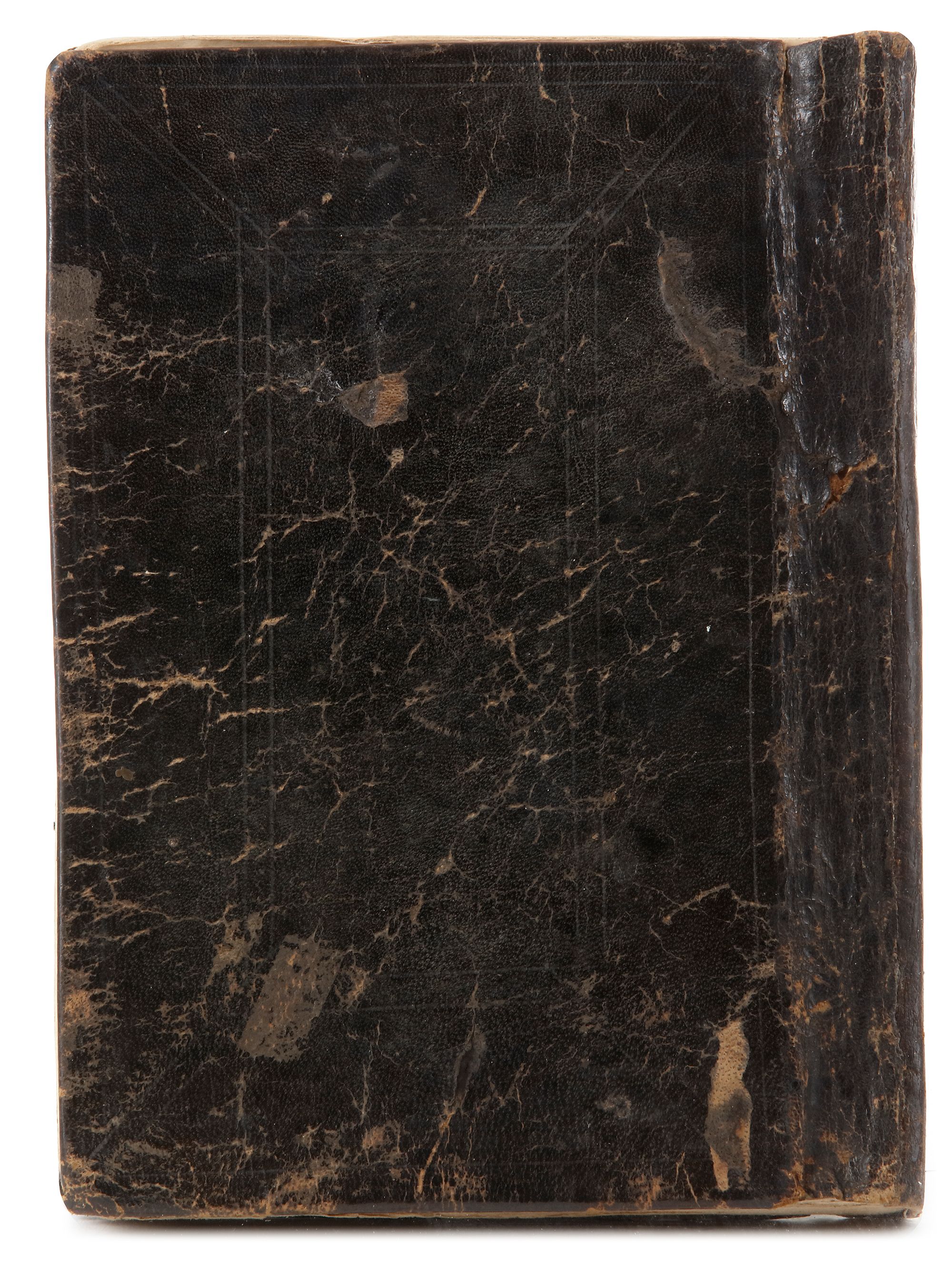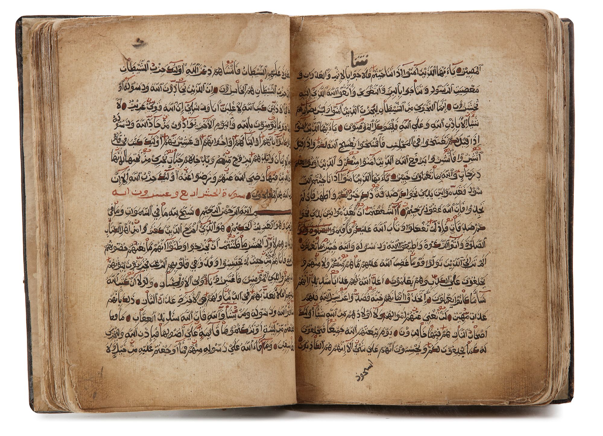 A Sub-Saharan Quran, in a bound format, in Arabic, decorated manuscript on paper, 112 leaves (plus 2 fly-leaves), apparently lacking 2 singletons in the text, single column, 16 lines black sudani script, some diacritics in red, opening 2 verses of the Quran with red and black geometric decorated borders, verses marked with red roundels throughout, surah headings also in red, catch-words throughout, first and last 2 leaves with du'a and contemporary annotations, a few scuff marks and some leaves a little darkened (as common), some outer edges repaired, not affecting text, 218 x 160 mm.; contemporary leather over pasteboards, ruled in blind, rubbed and scuffed An attractive Sub-Saharan Quran, uncommonly seen in this bound format. Manuscripts from this region are often unbound and presented in boxes, whereas the present copy was clearly copied and collated into gatherings with the clear intention of binding in traditional book format.
