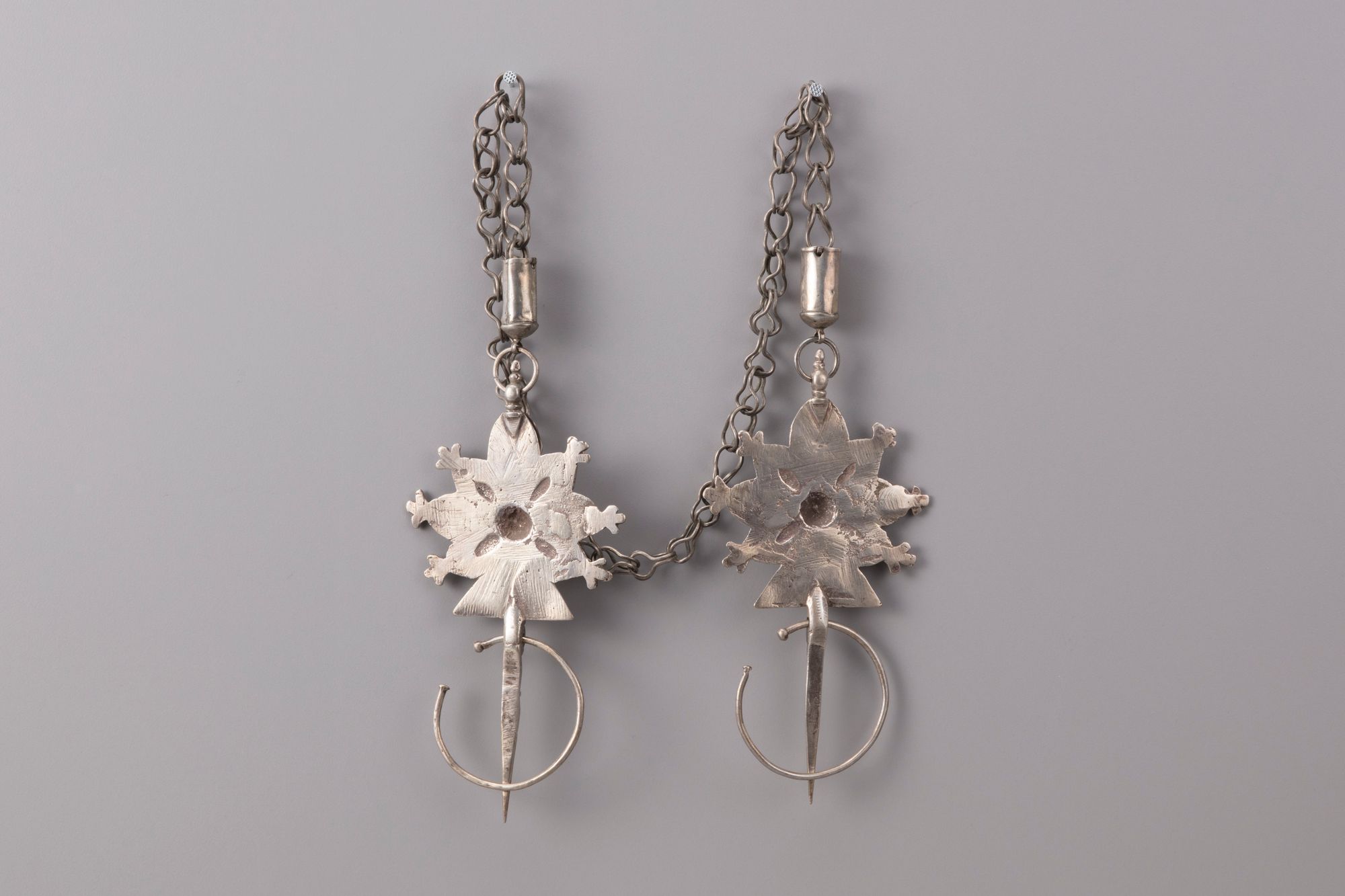 Cast and engraved silver and shaped like a Tuareg cross, with long needle and movable ring which helps secure the fibula to the textile, both fibula connected by a chain.