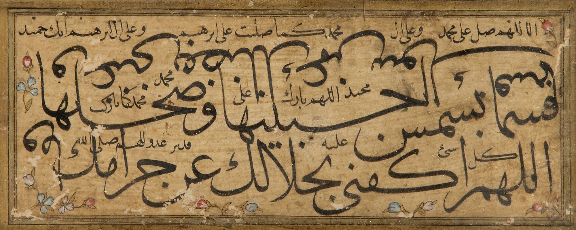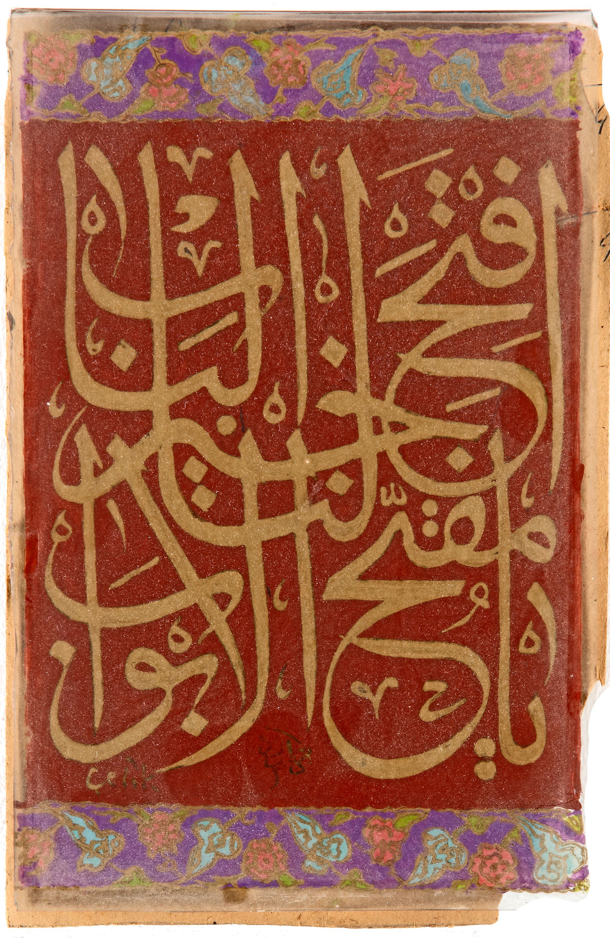 Two panel or Mashq with dense thuluth and naskh script, laid down on card, with floral sprays and gold decoration. A calligraphic panel with Arabic inscription in elegant gilt thuluth script on glass with floral decorated bands. All with gilt wooden frame. 7 by 17 cm. 21 by 13.5 cm. 22 by 14 cm.