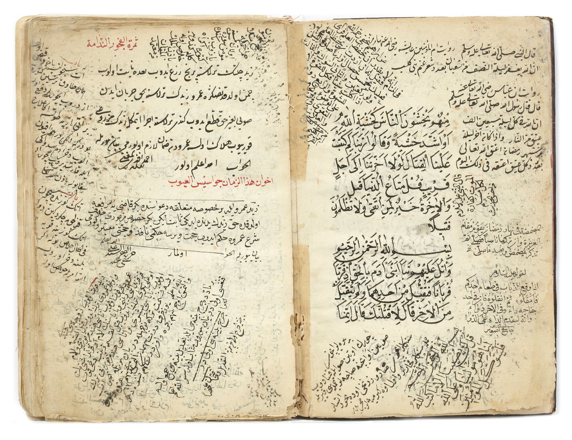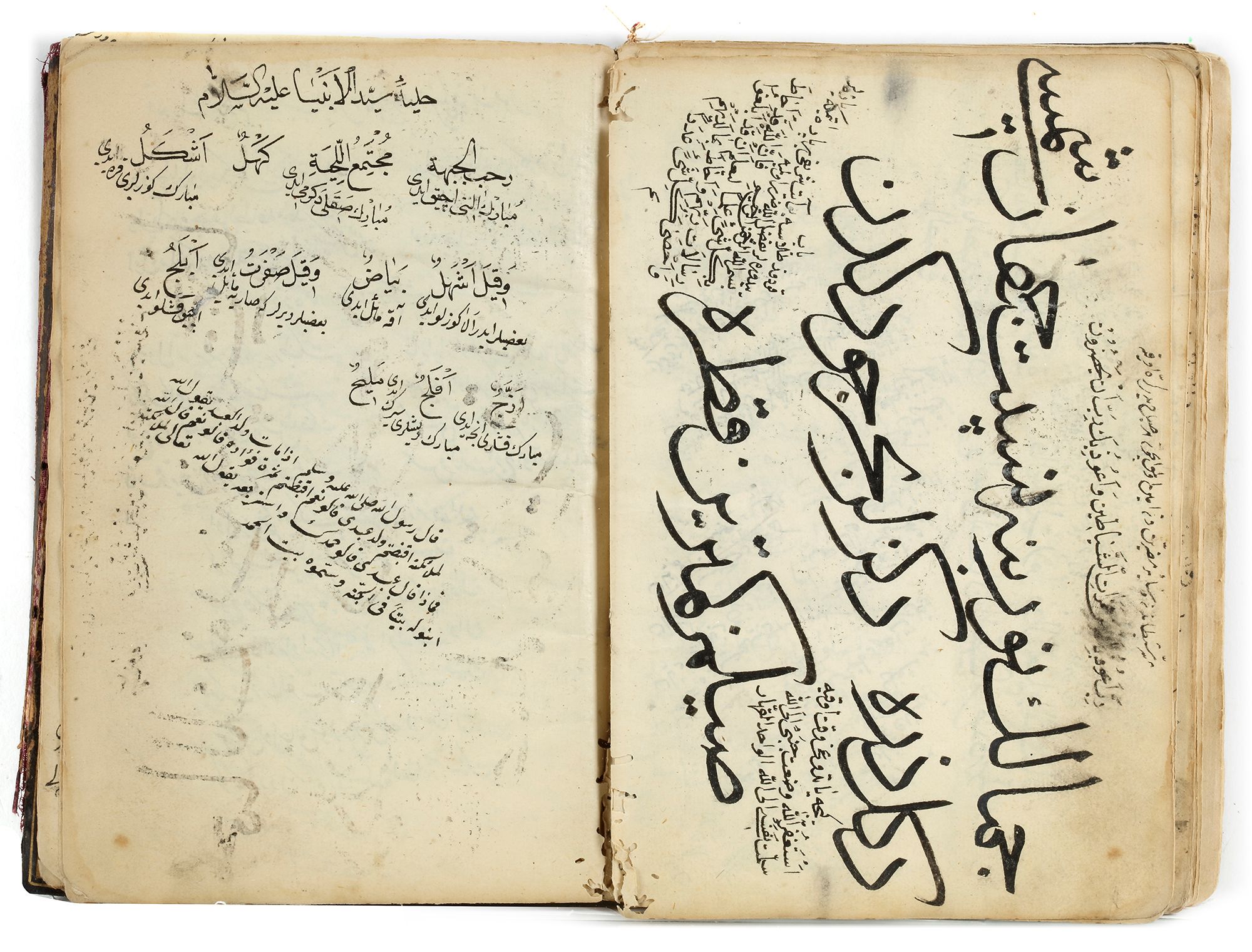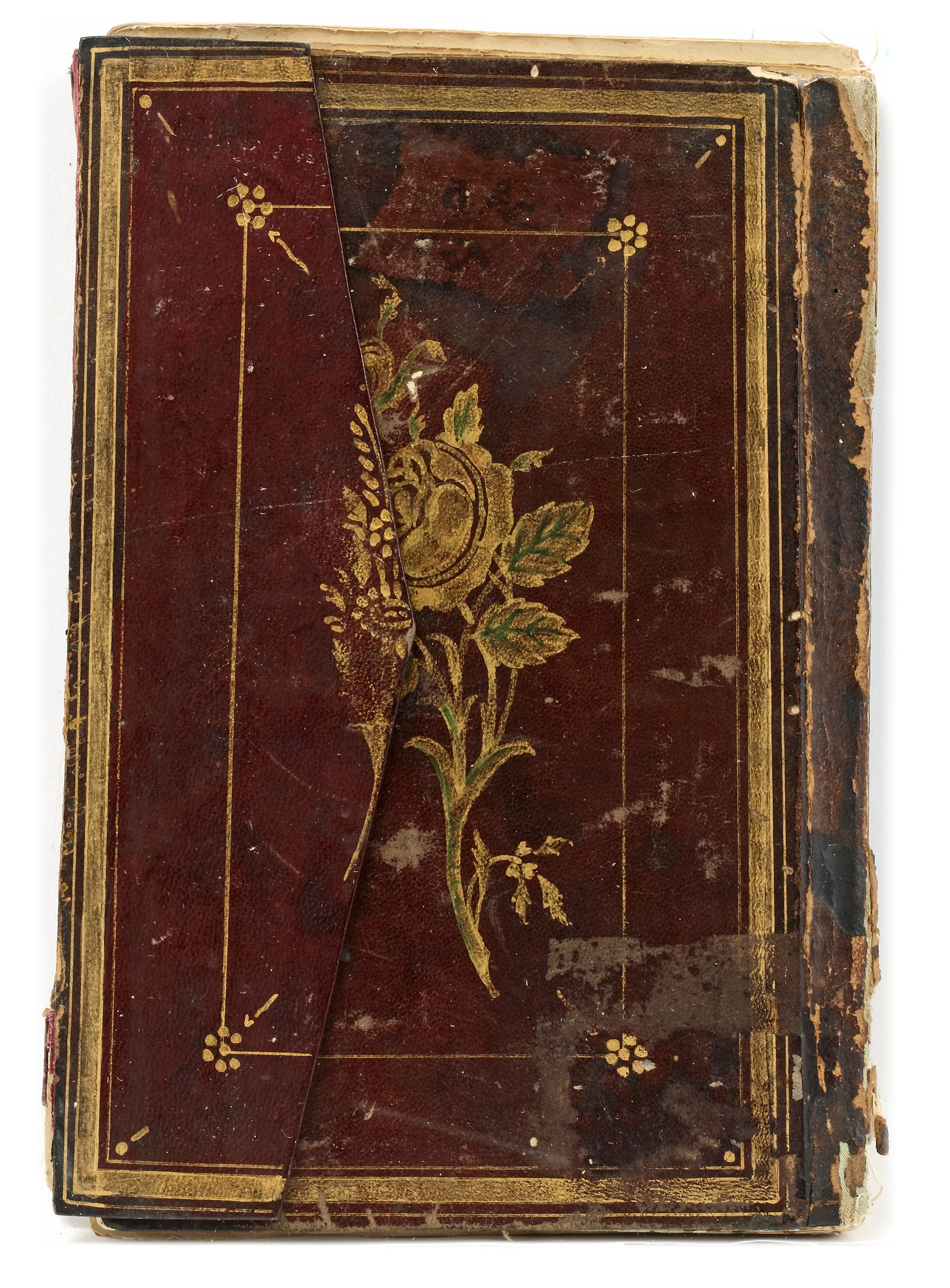 Arabic and Ottoman Turkish manuscript on European watermarked paper, 91 leaves, various texts (maktubat) written horizontally and diagonally in large and small scripts including naskhi, thuluth, nastaliq and divani in black, red and some gold, some folios detached or loose, discoloration, edges frayed, brown morocco, covers with wild roses painted in gold, inner and outer borders ruled in gold, with flap, of marbled paper, worn, spine damaged. 20 cm by 13 cm.