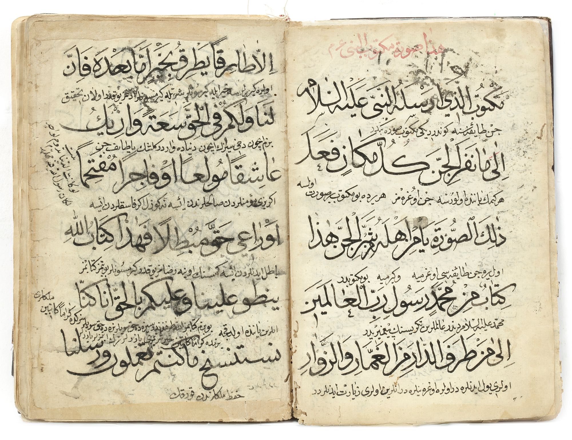 The wide range of texts includes: the Prophet's letter to the Jinn with an interlinear Turkish translation, numerous prayers, the Qasida (elegy) of Ahmad bin 'Abd al-Razzaq al-Tantarani, prophetic hadith in calligraphic form, pious poems, the Forty Hadith (along with a Turkish translation), excerpts from exegesis of the Quran, copies of letters of famous people (including many of the poet Nabi (d. 1712), described as deceased), witty compositions by Nabi, poems with abjad chronograms marking various occasions such as the births and deaths of high ranking personages, exchanges in the form of poems between the Khan of the Crimea and Sultan Ahmed, a treatise on the Beautiful Names of God, a Turkish translation of a qasida of Sa'di, pious poems explaining how to perform the ritual prayers, biographies of prophets and the imams of the Sunni legal schools, descriptions of Mecca and Medina, explanations of the months, and talismanic material.