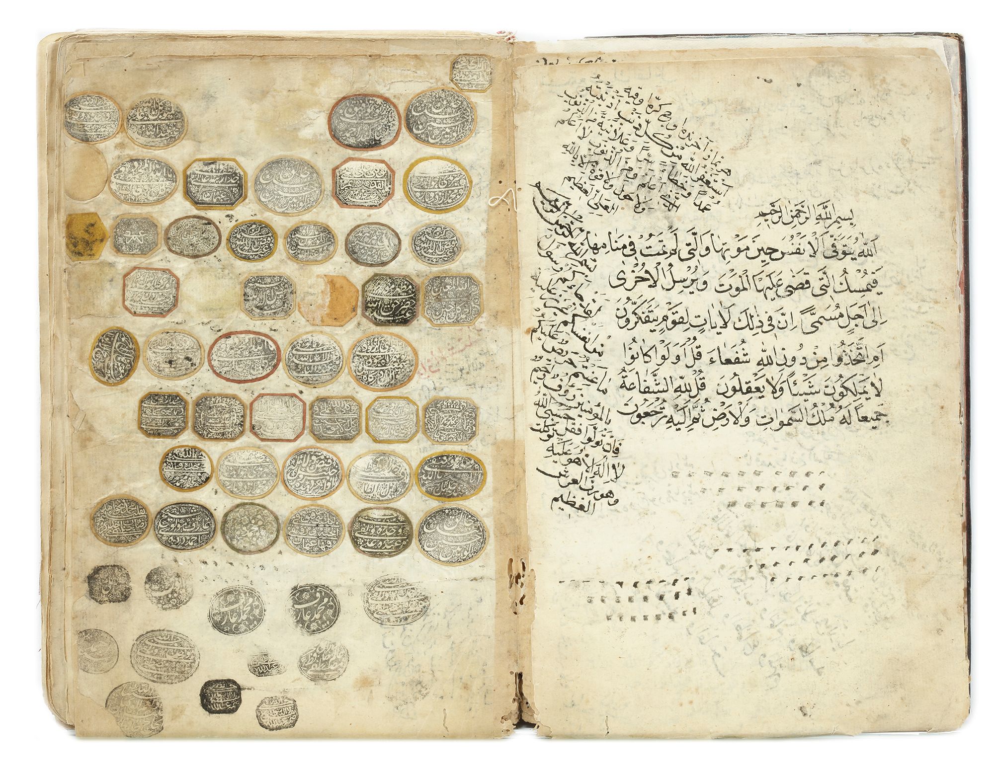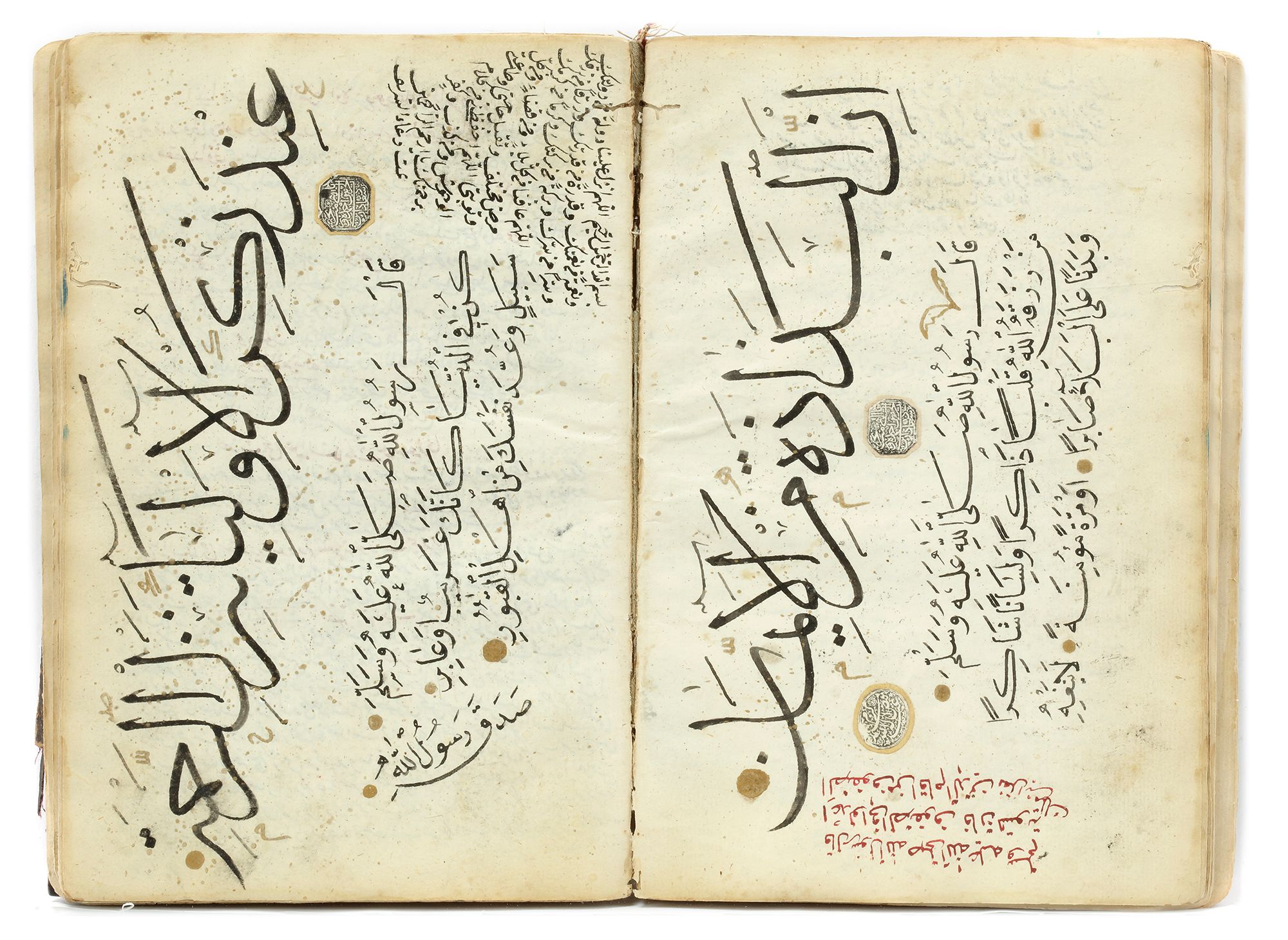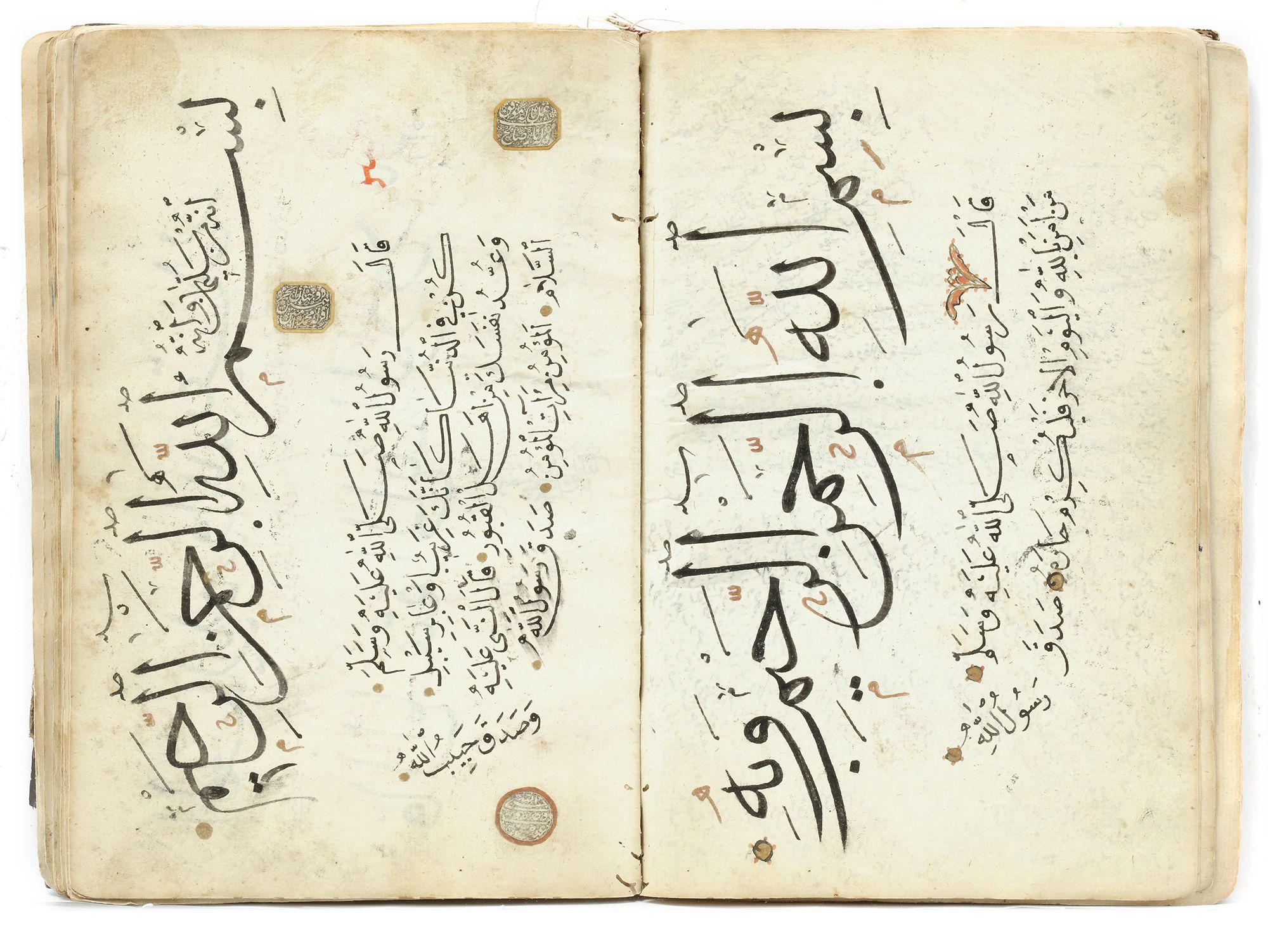The texts are in different hands, but were probably all copied around the middle of the 18th Century. There is a page of seal impressions including many with 18th Century dates, including some ranging between AH 1113/AD 1701-02 and AH 1149/AD 1736-37. One of the hadith is dated AH 1164/AD 1750-1751. The last page has a colophon mentioning the scribe Muhammad, better known as Nazir-zadeh, with the date AH 1124/AD 1712-13. He may be responsible for the leaves, of which there are several, written in large thuluth.