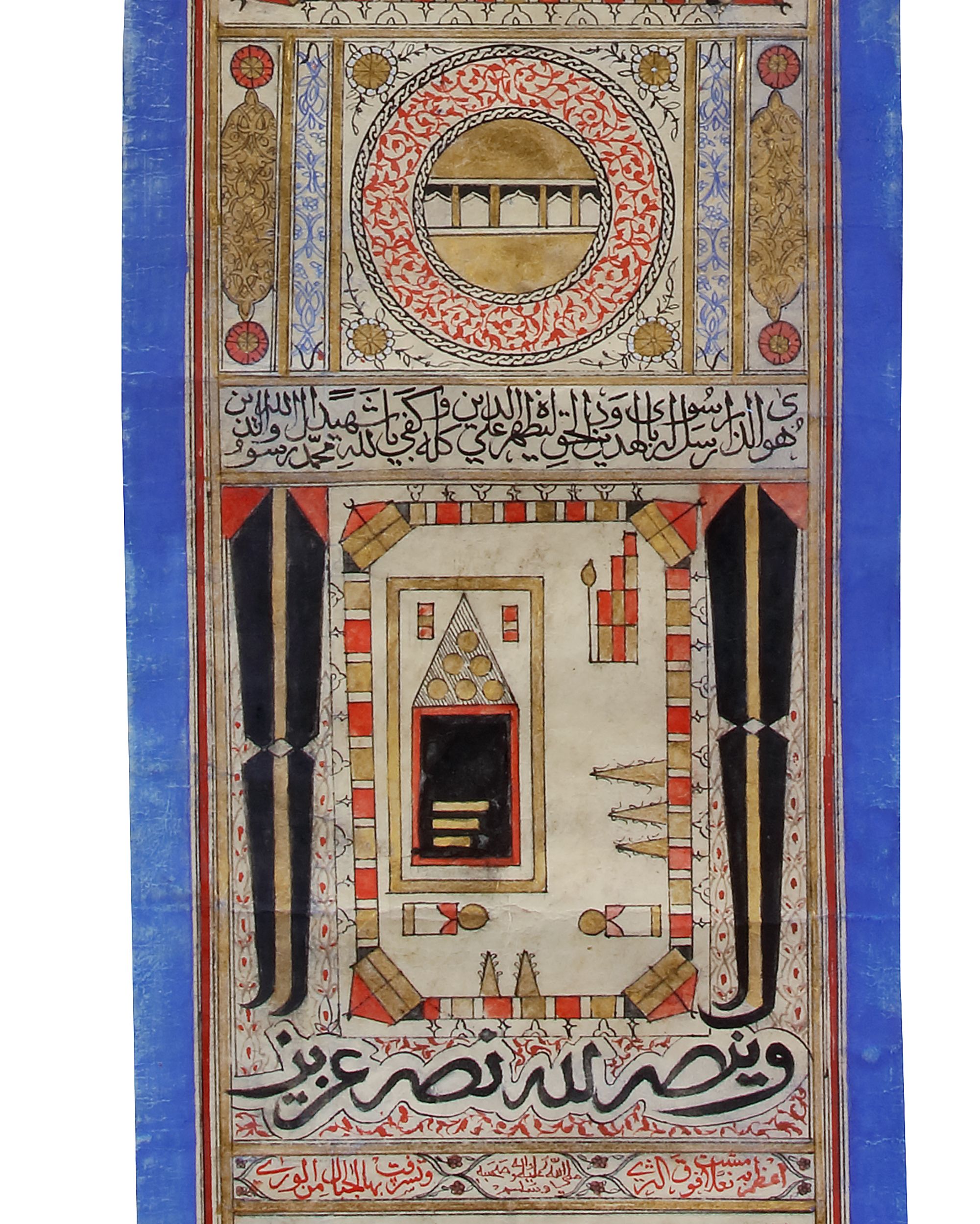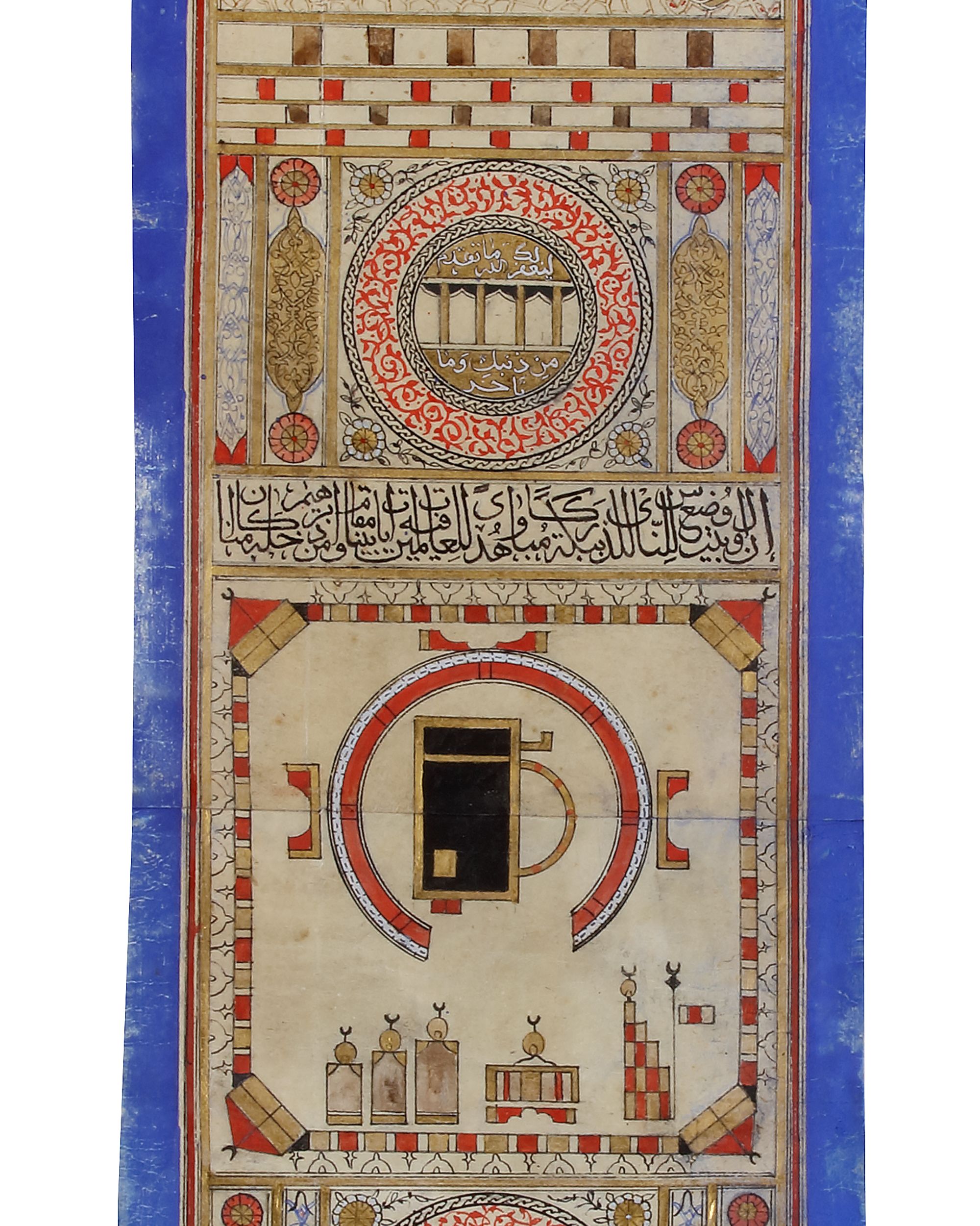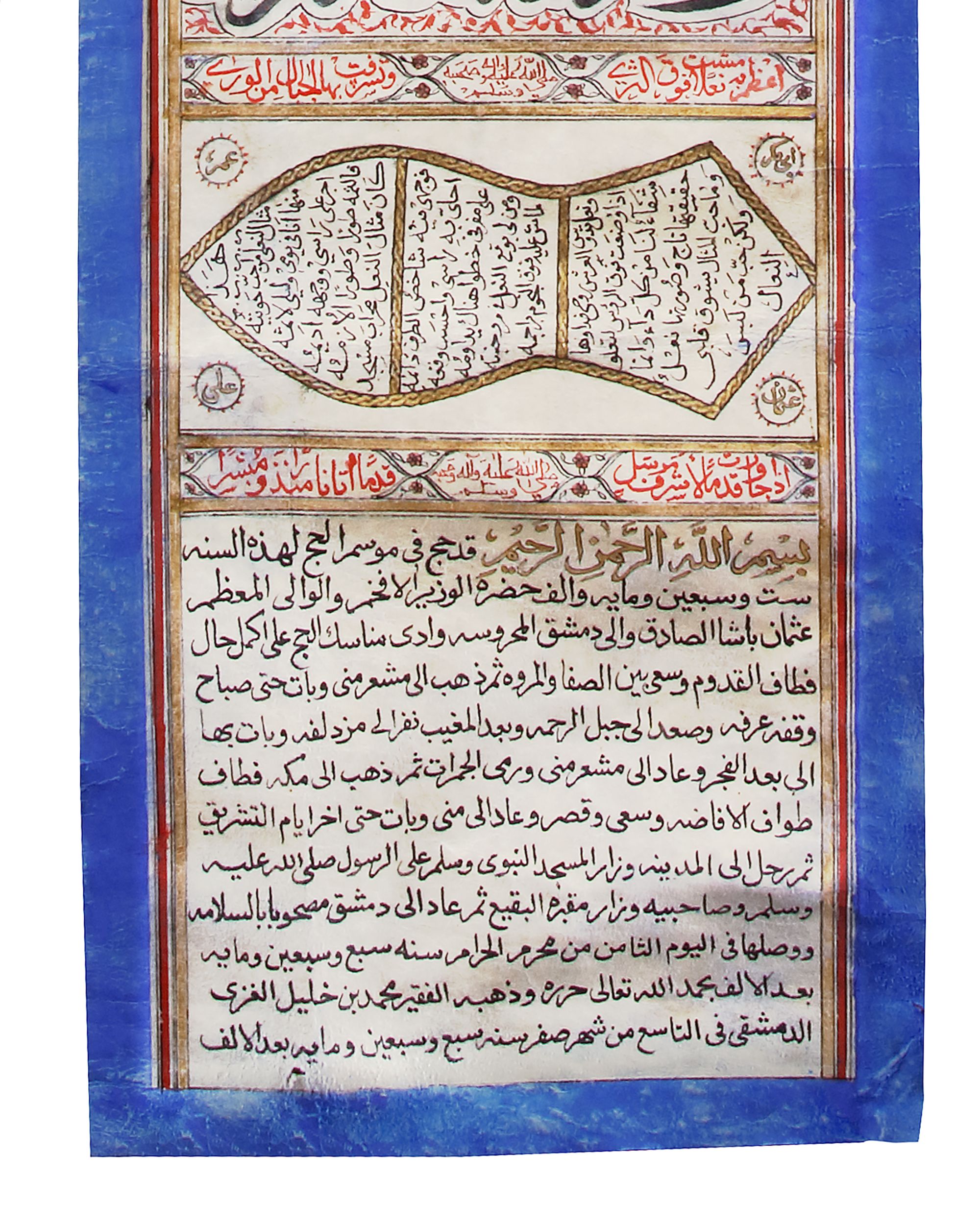 The Hajj scroll, depicting Mecca and Medina, was presented to Othman Pasha Al-Sadig, the governor of Damascus. Single scroll formed of 2 membranes, divided into 8 main divisions, comprising: (i) 'Bismillah' opening, formed of large stylised calligraphic script in gold and outlined in black, (ii) another stylised calligraphic section of du'a in gold, with decorations in blue surrounded by red and black flowers, (iii) a decorative section containing text describing the parts of Ka'aba with a panel of text below in thuluth (iv) an illustration of the holy Ka'aba (v) a decorative section containing text describing the sections of Ka'aba with a panel of text below in thuluth, (vi) a detailed illustration of Medina, (vii) the prophet's footprint in outline surrounded by prayers in black naskh, (viii) the colophon and final section naming the pilgrim and dating the document, all outlined in royal blue, some slight surface soiling; with parchment wraparound and leather strap, housed in late nineteenth/century leather tube-case with lid.