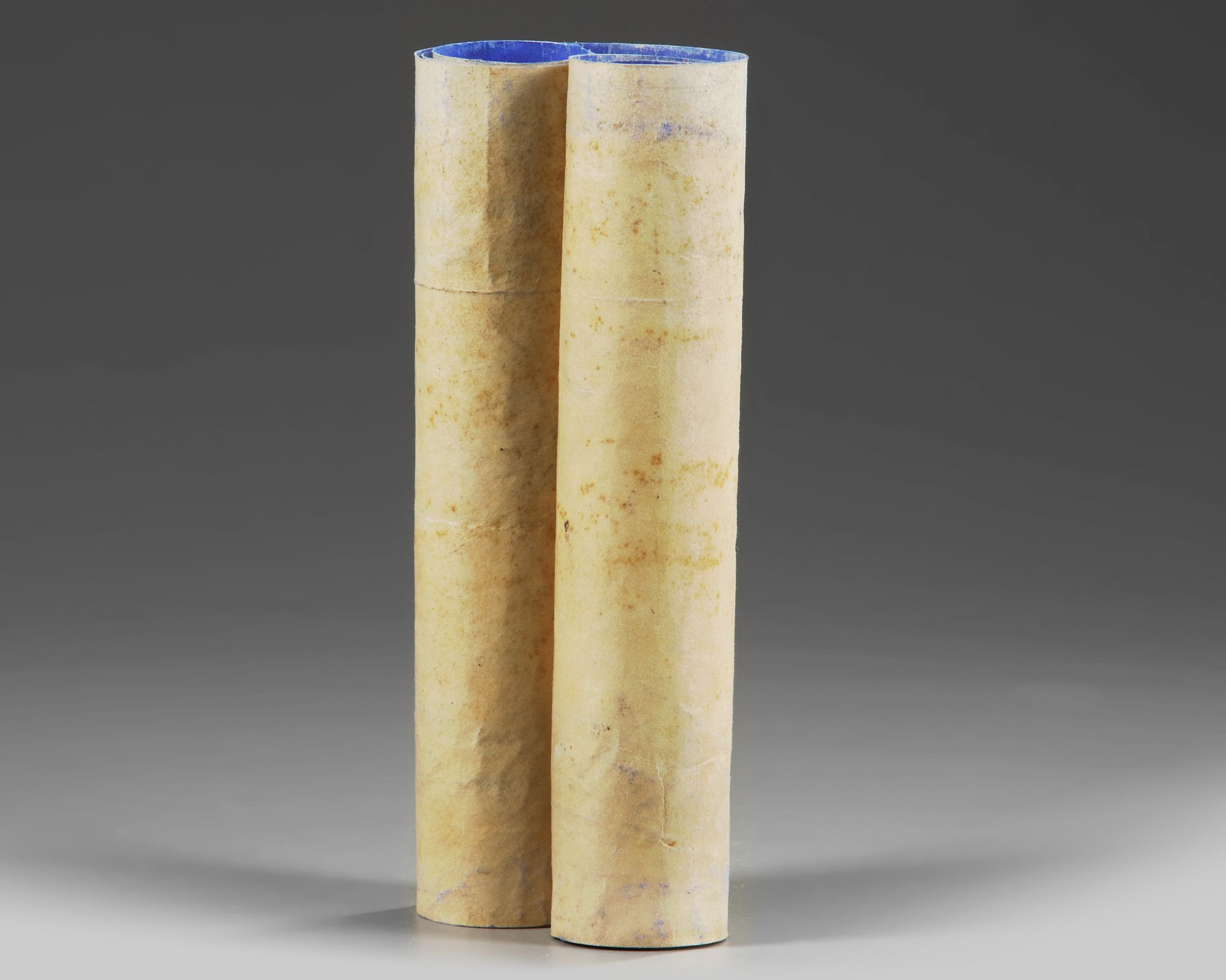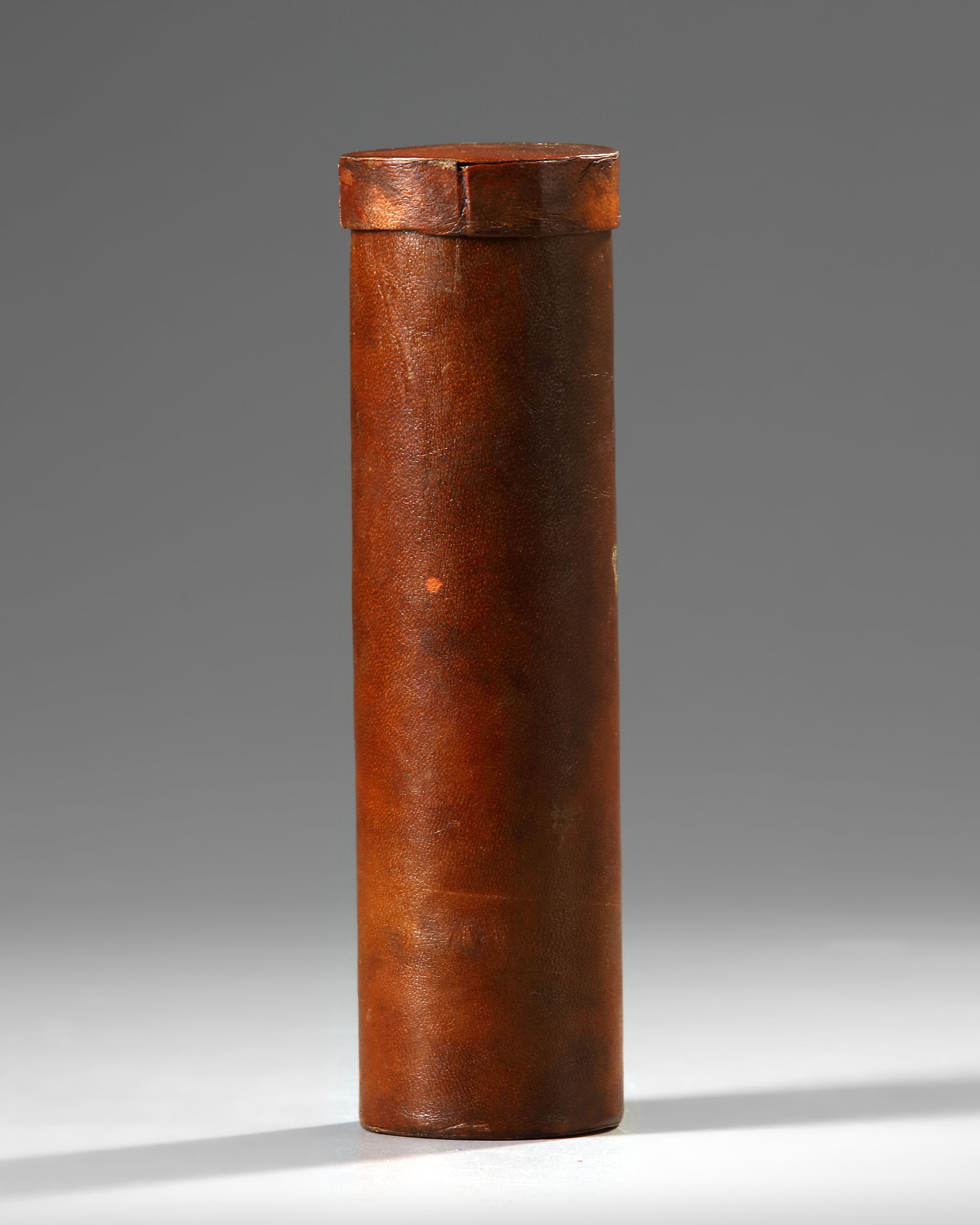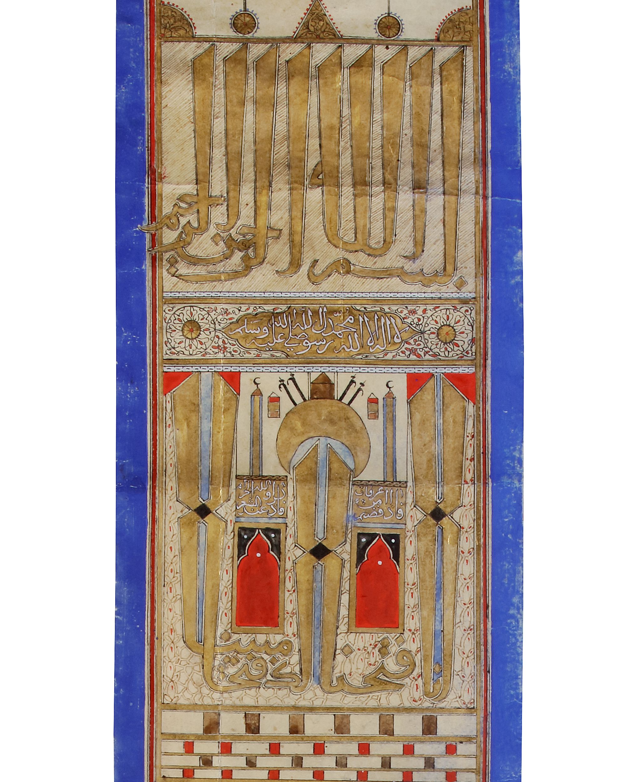 The Hajj scroll, depicting Mecca and Medina, was presented to Othman Pasha Al-Sadig, the governor of Damascus. Single scroll formed of 2 membranes, divided into 8 main divisions, comprising: (i) 'Bismillah' opening, formed of large stylised calligraphic script in gold and outlined in black, (ii) another stylised calligraphic section of du'a in gold, with decorations in blue surrounded by red and black flowers, (iii) a decorative section containing text describing the parts of Ka'aba with a panel of text below in thuluth (iv) an illustration of the holy Ka'aba (v) a decorative section containing text describing the sections of Ka'aba with a panel of text below in thuluth, (vi) a detailed illustration of Medina, (vii) the prophet's footprint in outline surrounded by prayers in black naskh, (viii) the colophon and final section naming the pilgrim and dating the document, all outlined in royal blue, some slight surface soiling; with parchment wraparound and leather strap, housed in late nineteenth/century leather tube-case with lid.