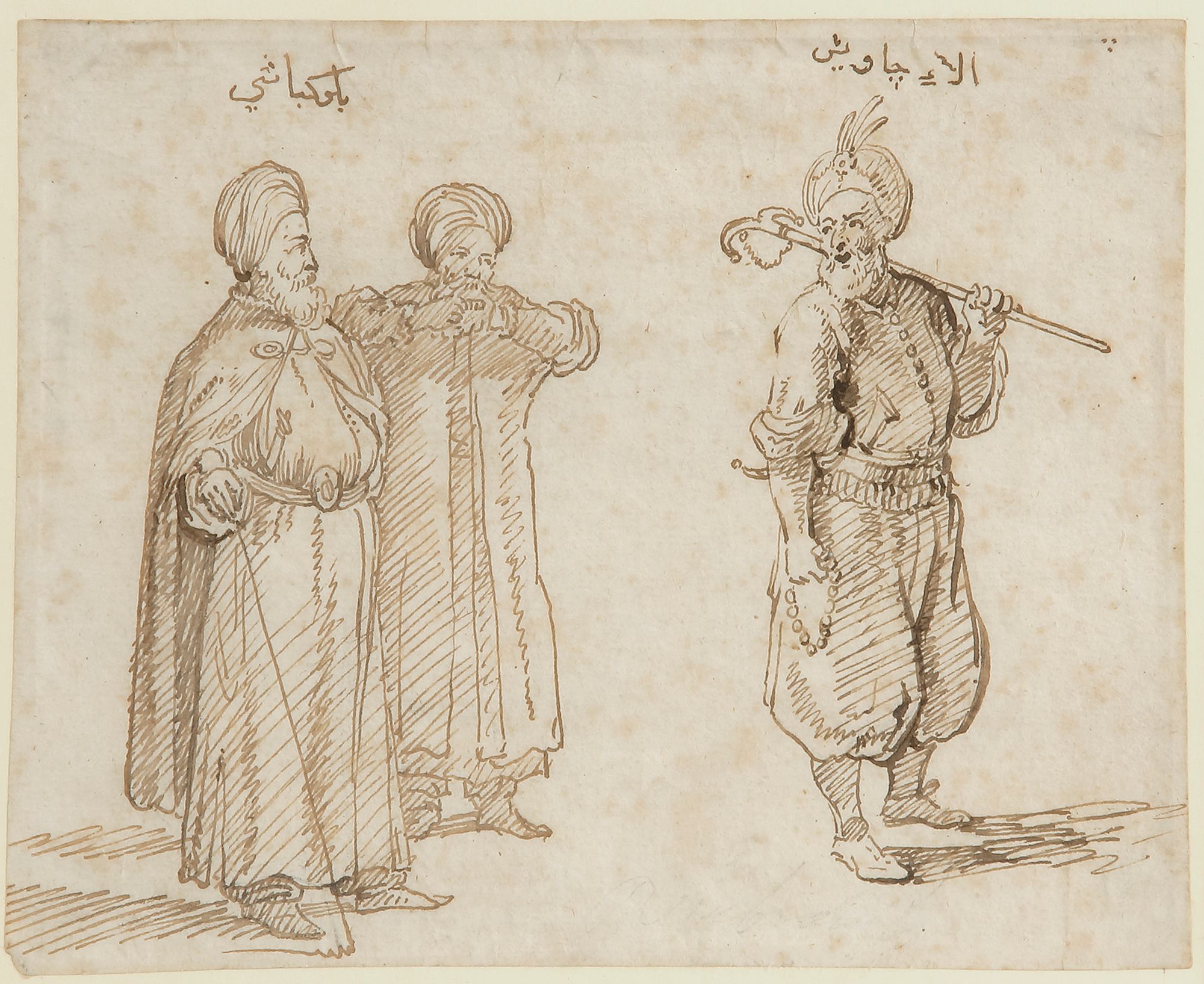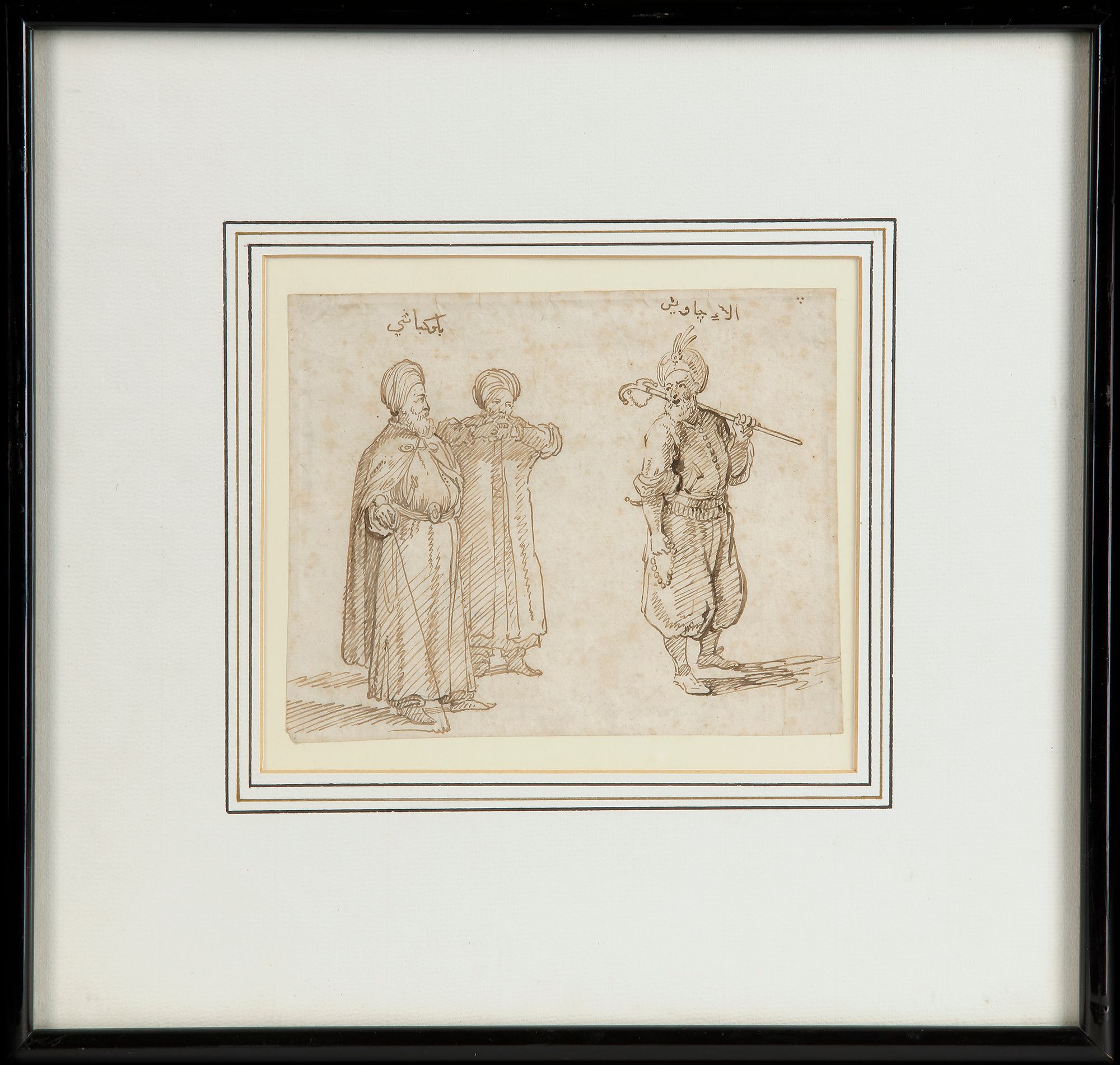 Pen drawing on paper representing three characters in discussion. Arabic writing above their heads. Above the figure on the right, an inscription in Arabic: Al-Ajâwish and above the figure on the far left: Bûluk Bâshi. 16 by 19 cm framed under glass.