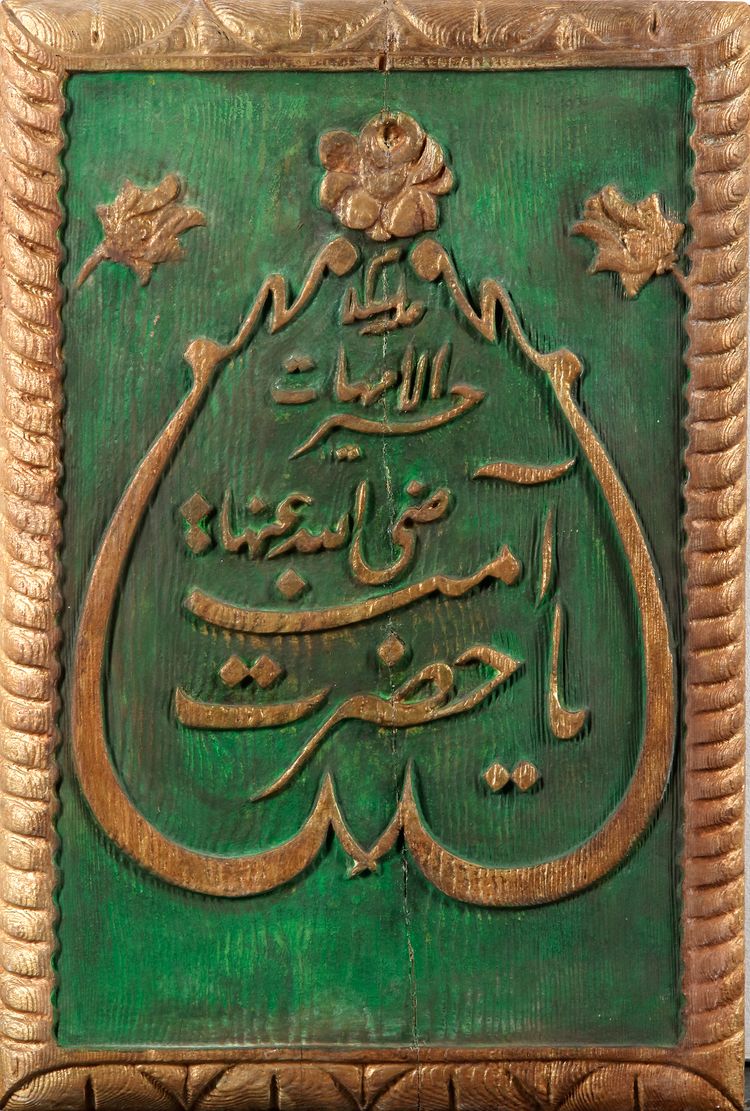 An Ottoman wooden panel engraved with Arabic and Turkish inscription: 'peace be upon Aminah, the mother of the Prophet'. 40 by 60 cm.