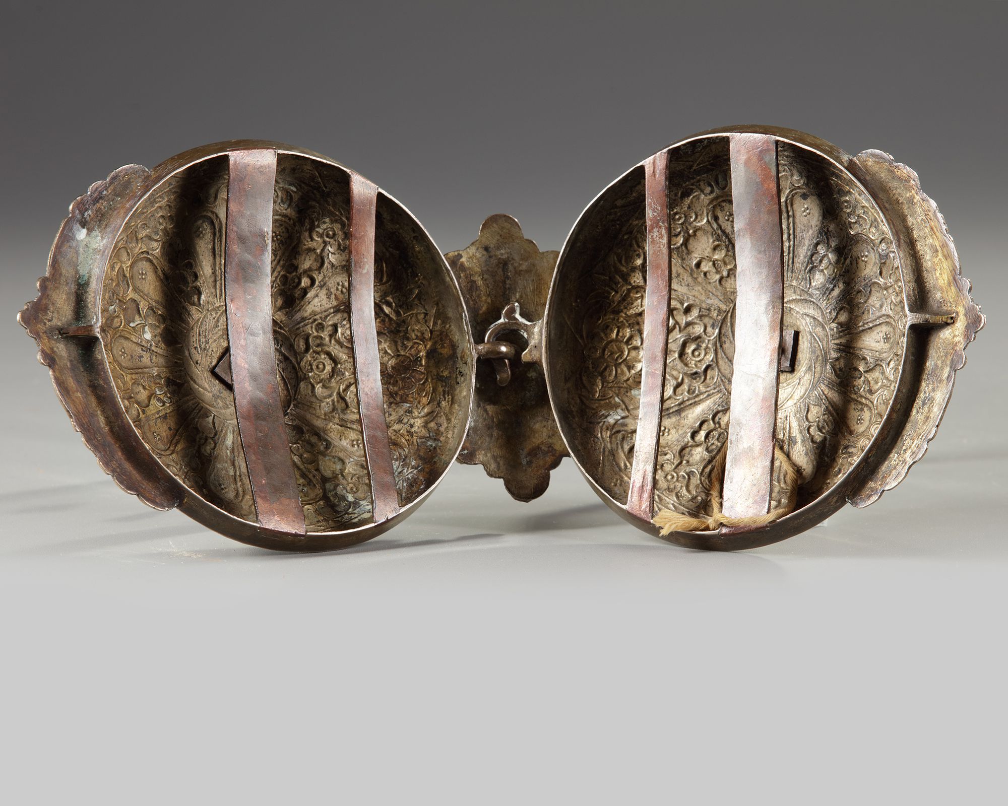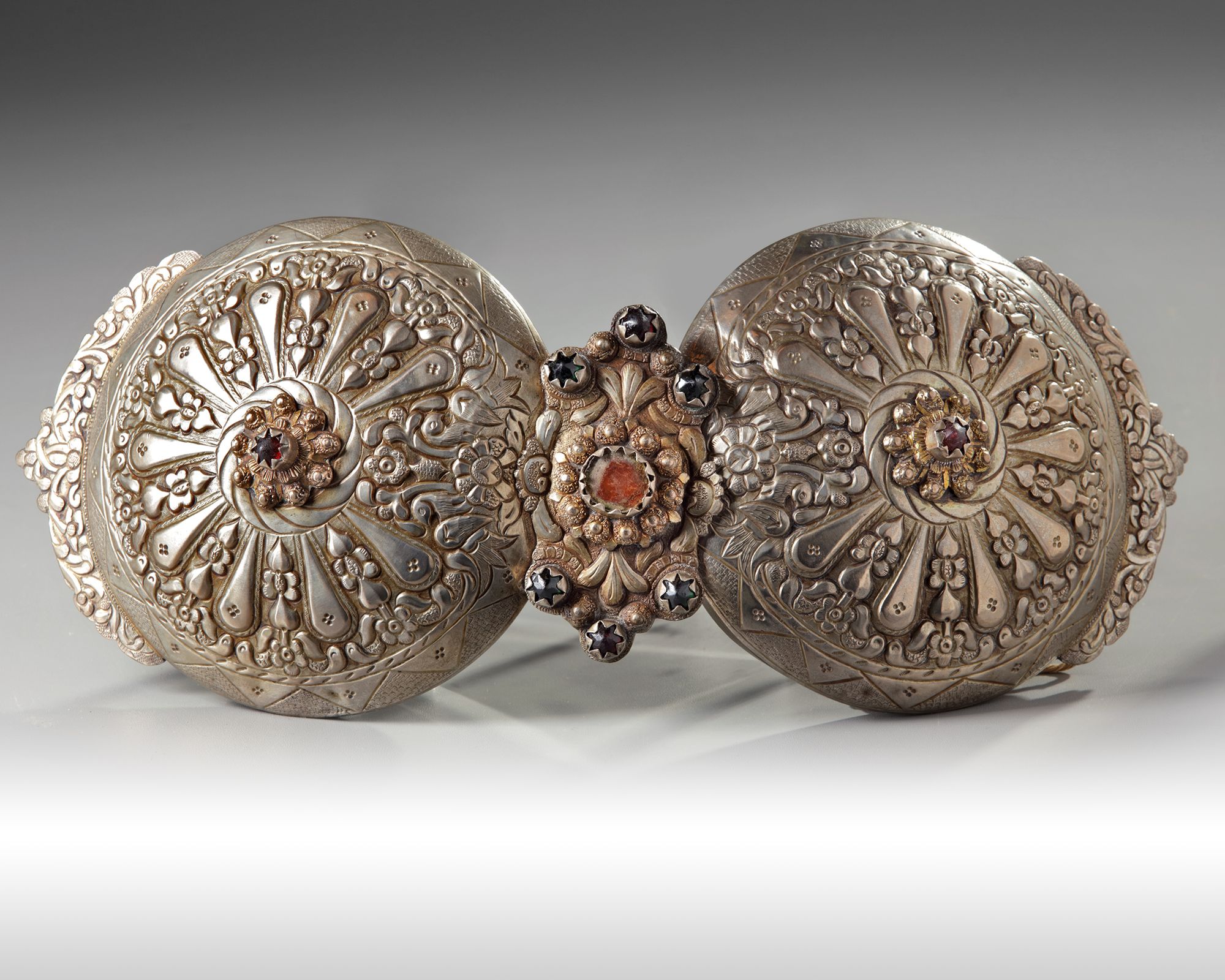 Formed as two circular bosses of plain silver decorated in low relief with foliage work, each half of the buckle is further decorated with a raised central floral gilt roundel set with a stone. A central component of lozenge form is similarly decorated, set with gem-stones and a gilt central part. It is this part which hides the clasp on the reverse. Each side of the main component bosses is extended with silver flanges decorated with foliage work