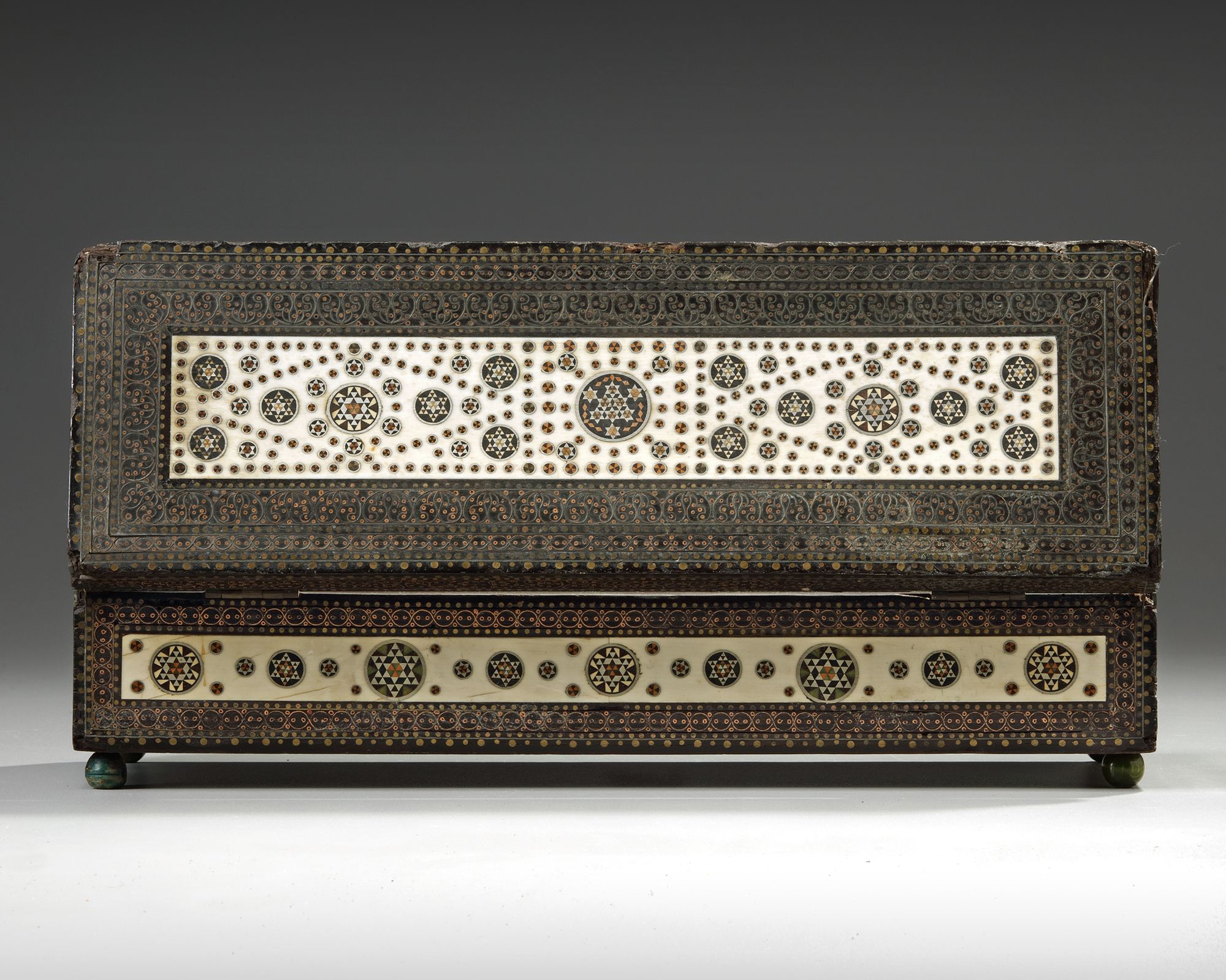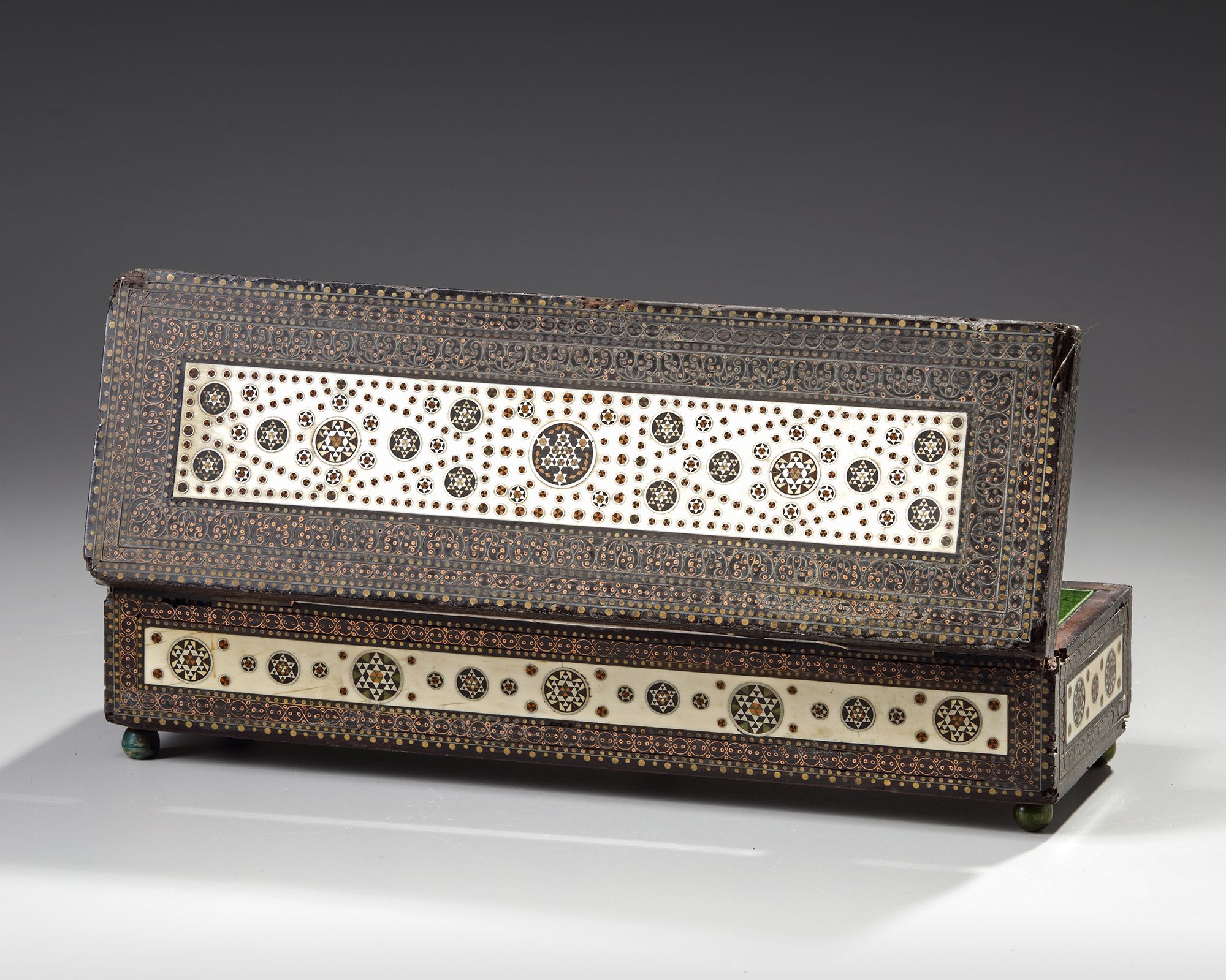 Of rectangular form on small feet, with large rectangular ivory inlay pierced with silver geometric designs.