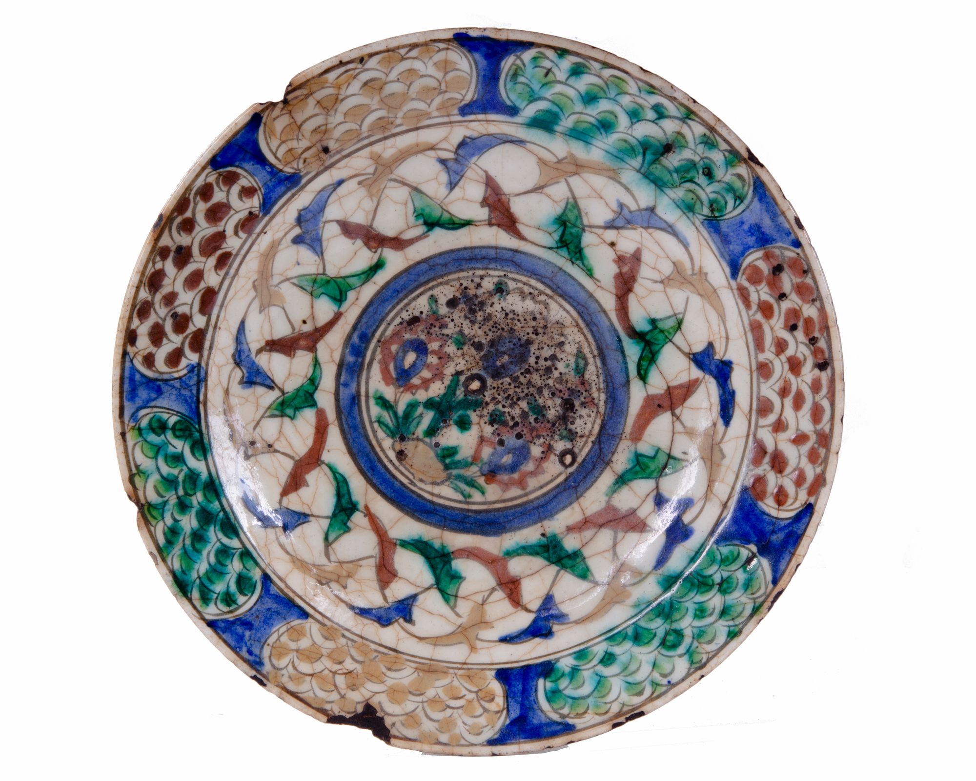 With sloping rim on short foot, the white interior with a central roundel within a bold blue, black outlined border, with floral spray comprising three main bulbs and small leaves and flowers between, the cavetto with red, green and ochre tendrils, the border in blue with oval cartouches containing fish-scale motifs with the same red, green or ochre highlights. 28 cm. diam.