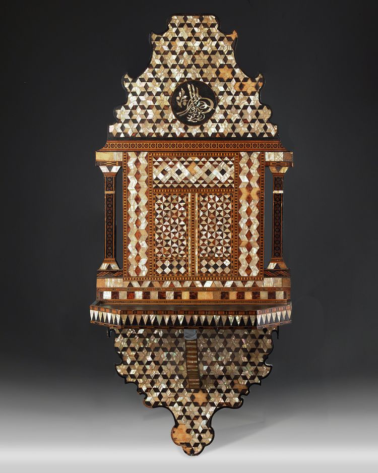 Of typical form with crescent shaped finial, the backboard decorated with mother-of-pearl square inlay, with tugra style mark. 90 by 36 cm.