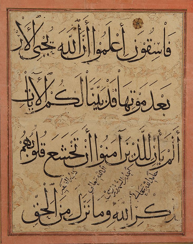Ink on paper, one with black Naskh script with gold and black roundels. Signed Ahmed bin Suhrawardi- (701 HJ-13th AD)