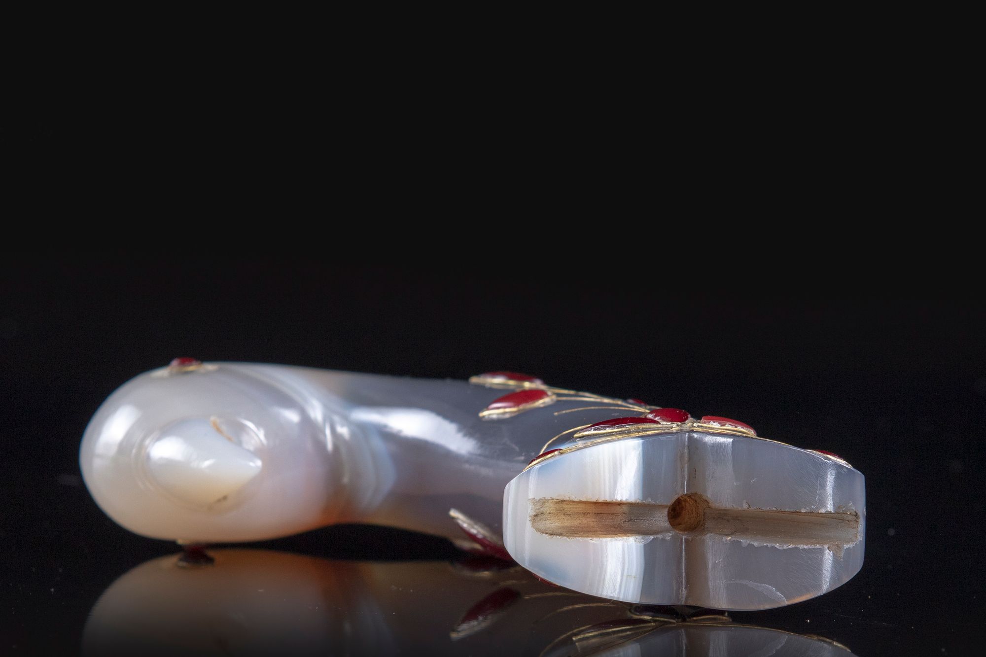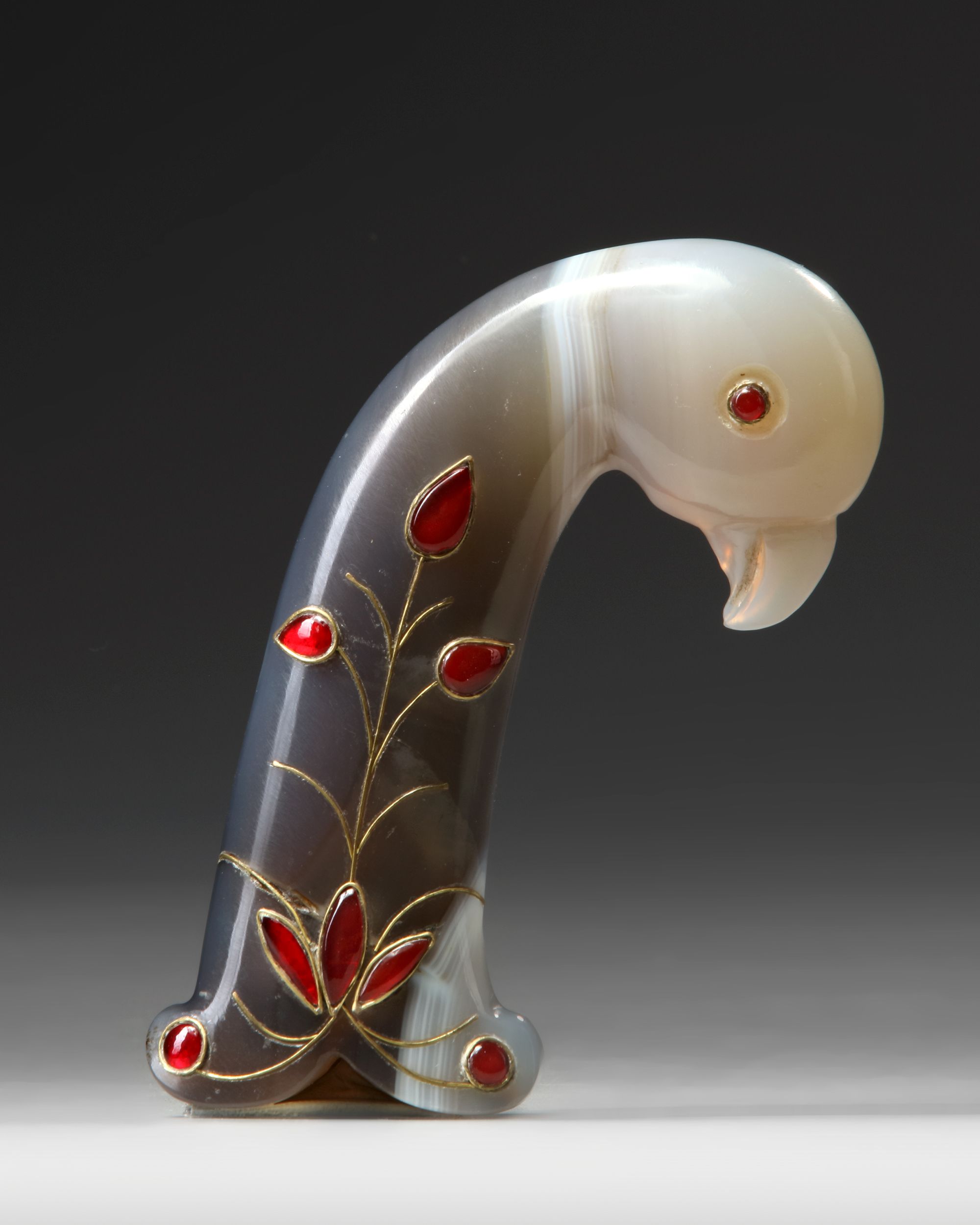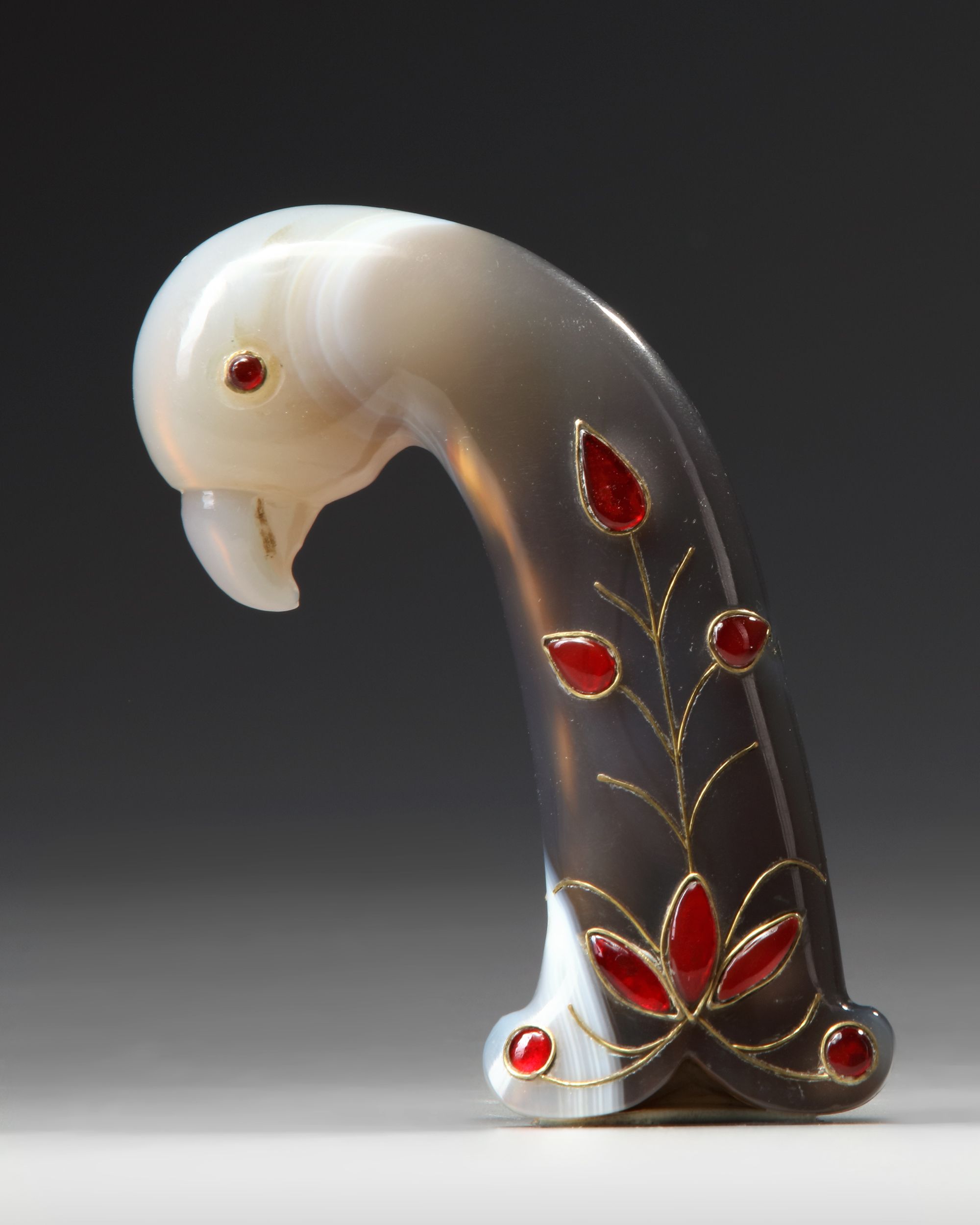 A Mughal agate dagger hilt with a bird head shaped pommel, glass and gold-inlay in an elegant design of floral stems.