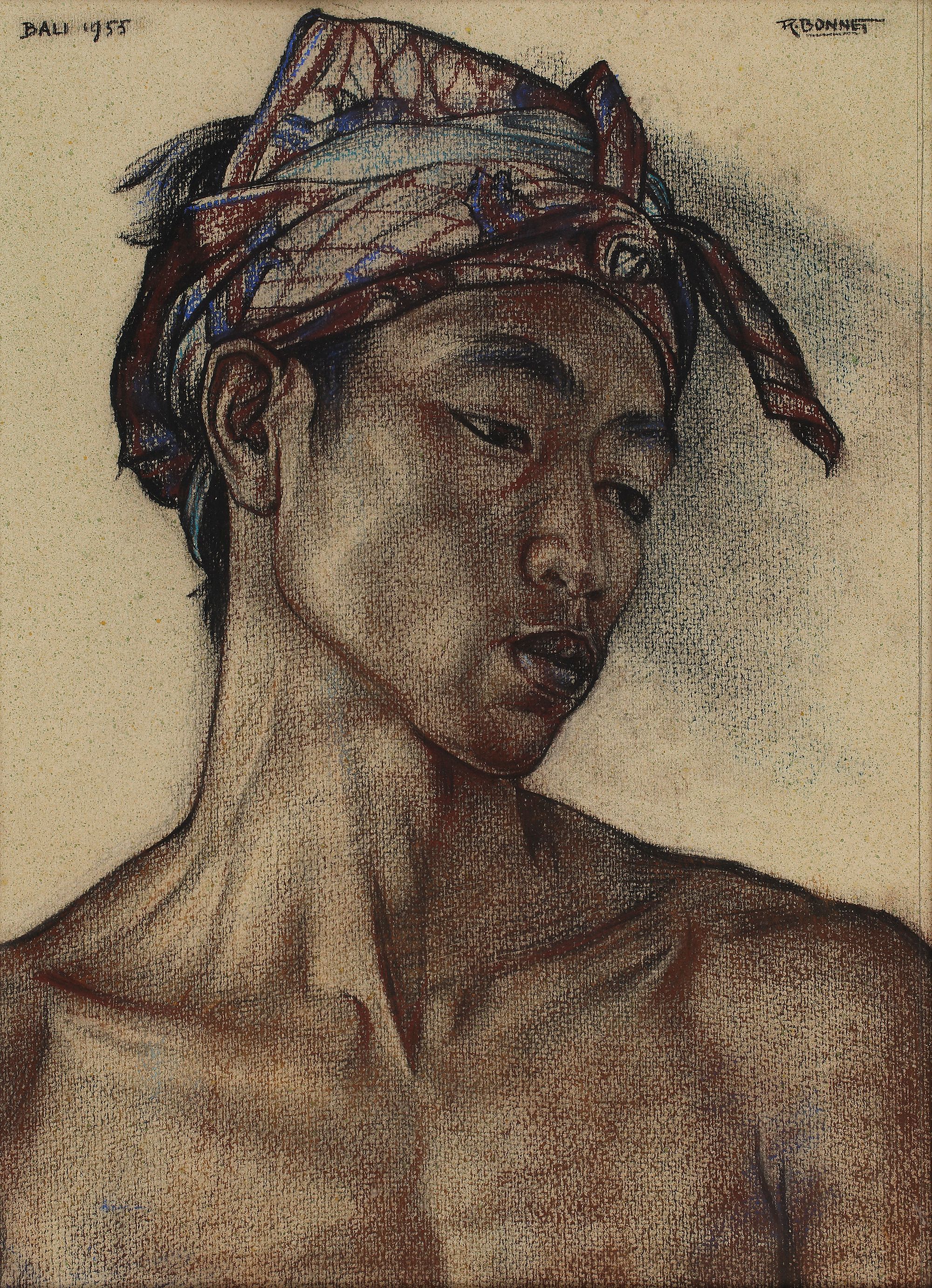 Johan Rudolf Bonnet (30 March 1895, Amsterdam - 18 April 1978, Laren) was a Dutch artist who lived much of his life in the town of Ubud on Bali, Indonesia. He was born into a Dutch Huguenot-descended family who had been bakers for many generations. He attended the Rijksakademie van Beeldende Kunsten in Amsterdam. He arrived in Bali in 1929 where he met the German artist Walter Spies and the Dutch musicologist Jaap Kunst. With Kunst, he made a trip to Nias, returning to Bali in 1930. He was invited to live in Ubud in by Cokorda Gde Raka Sukawati. Between 1929 and 1940 Bonnet stayed in Ubud. When Spies moved to Campuhan, Bonnet took over Spies' water palace in Ubud and set up his studio. He became involved in community issues including healthcare and education. He was also very involved in the Pita Maha movement, which encouraged local artists to raise their artistic standards. After the Japanese arrived in Bali, Bonnet remained free until 1942 when he was ordered to be sent to Sulawesi. He spent the remainder of World War II in internment camps in Pare-Pare, Bolong and Makassar. In 1947 Bonett returned to Bali where he built his house and studio in Campuan. Despite the deteriorations in the relationship between The Republic of Indonesia and Holland Bonnet was able to stay due to his relationship with President Sukarno who had collected 14 of his works. He was expelled from Indonesia in 1957 after he refused to finish a portrait of President Soekarno; he was able to return 15 years later. Painting dated at 1955.