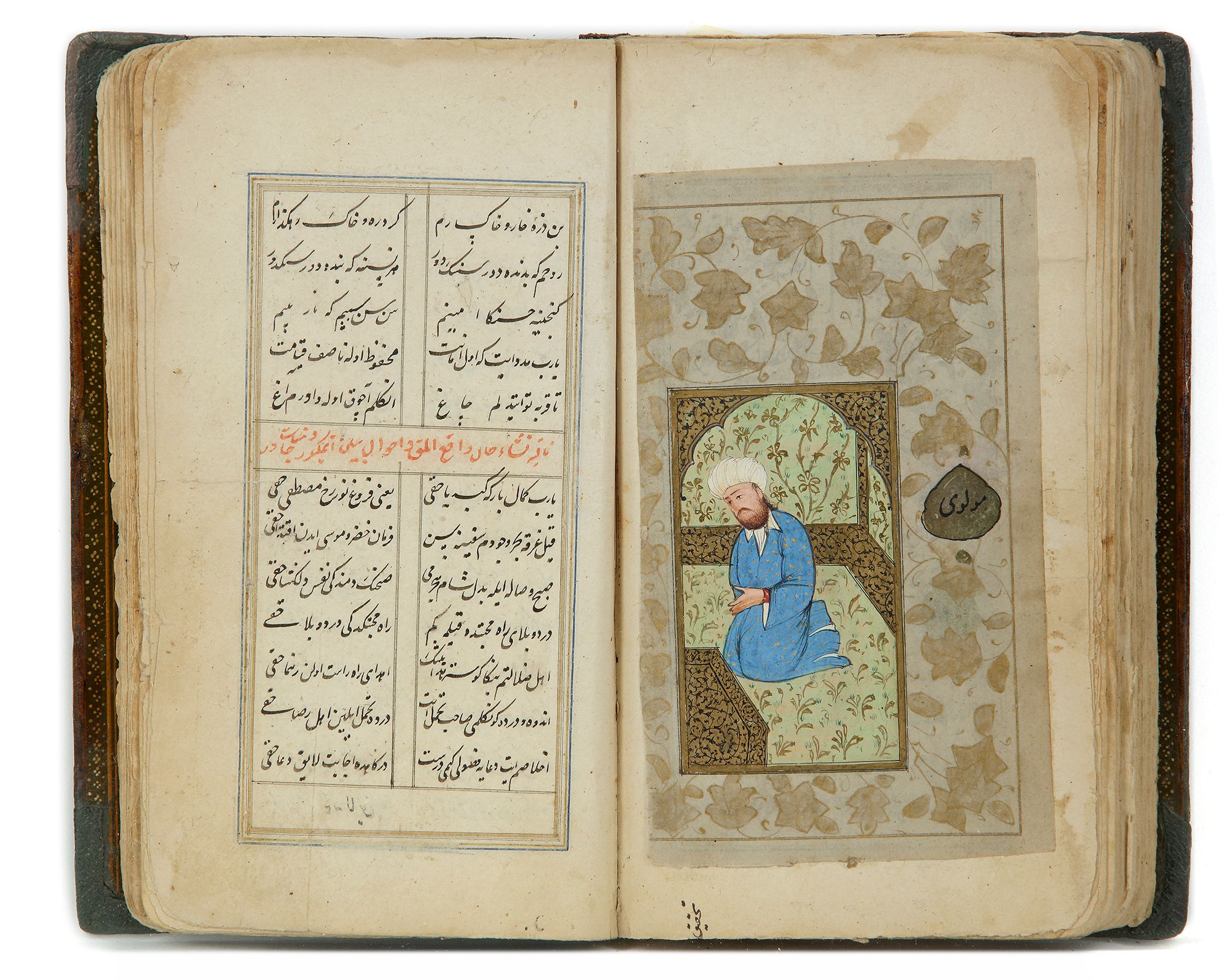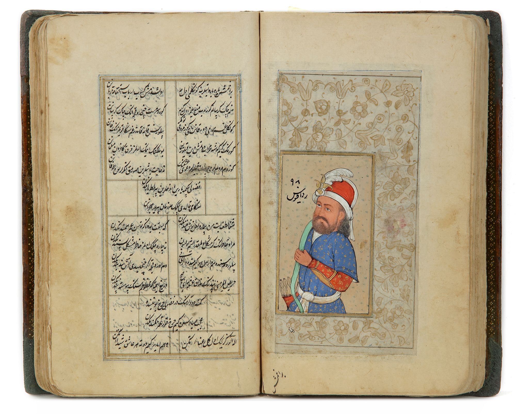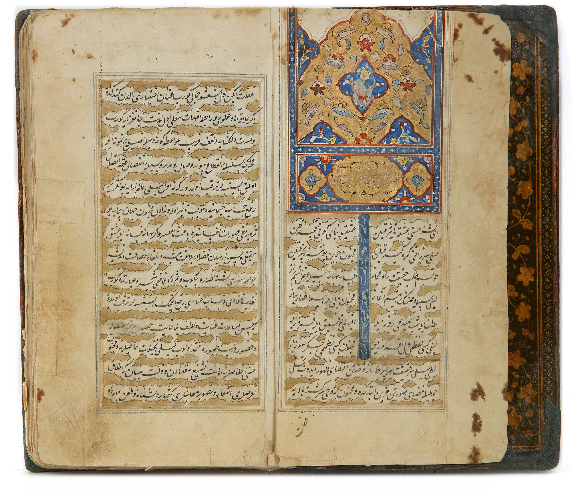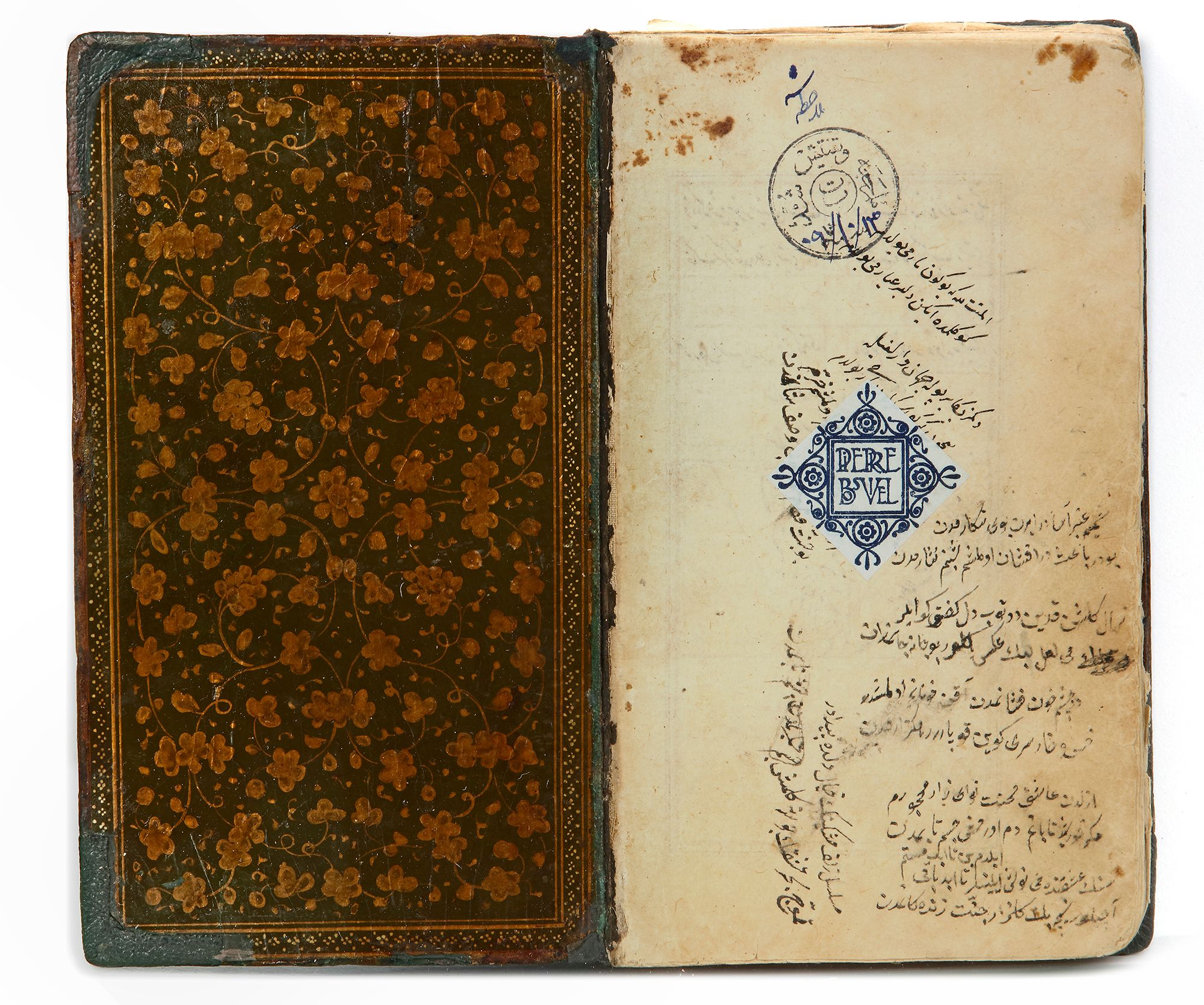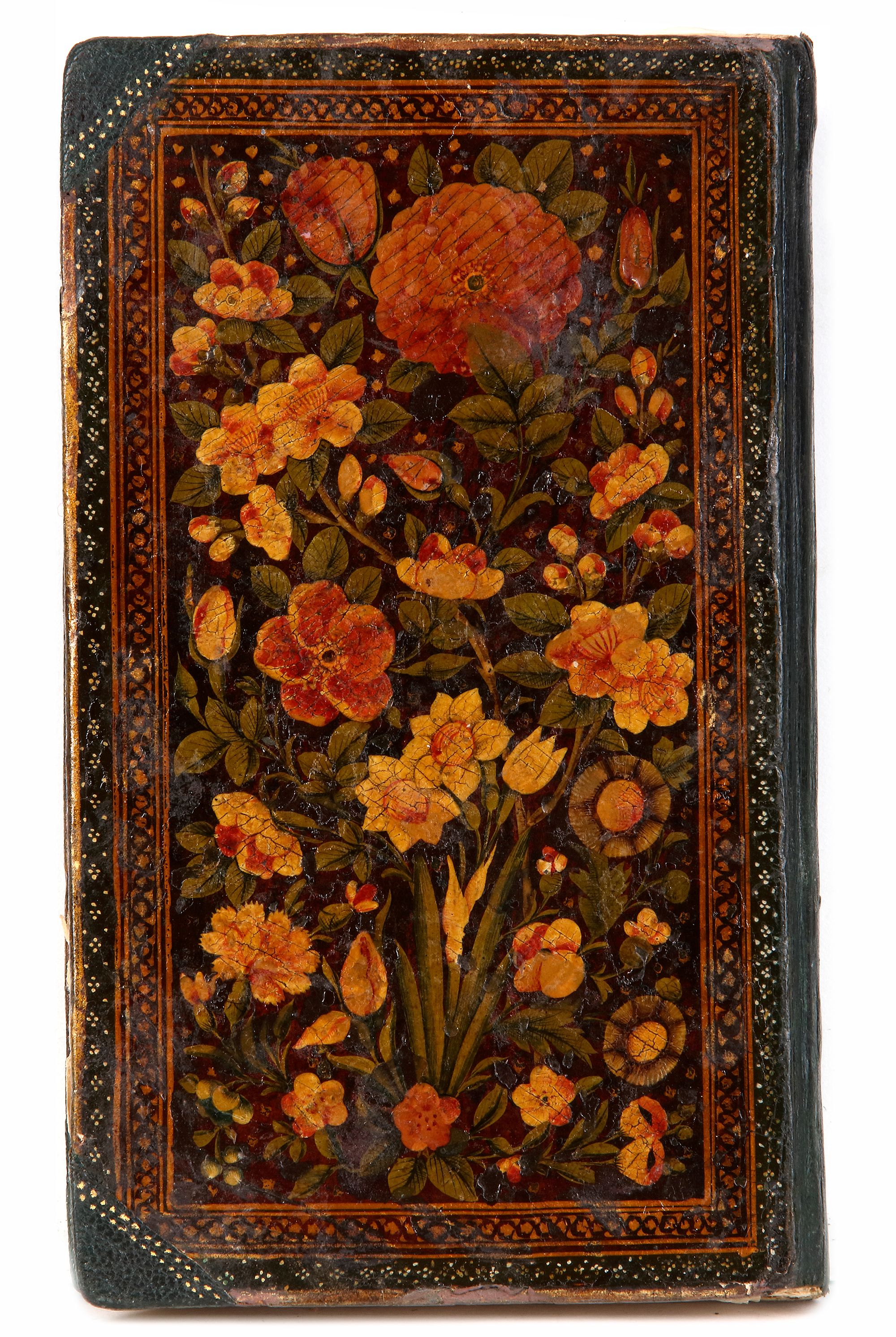 Persian poetic manuscript, calligraphed on black nastaliq, paper on two columns, opening with a beautiful illuminated unwan. The colophon is signed Salah b. Khwaja Abdul-Hussein in 1045 AH. Portraits of the ancient kings of Persia were added later. Readers' notes and stamp indicating the exit from Iran in 1313H. (= 1935 solar calendar). Beautiful binding without flap, papier-mâché painted and lacquered with floral decoration on the outside dish, and decorated with golden floral scrolls on the inside dish. 20 by 12 cm.