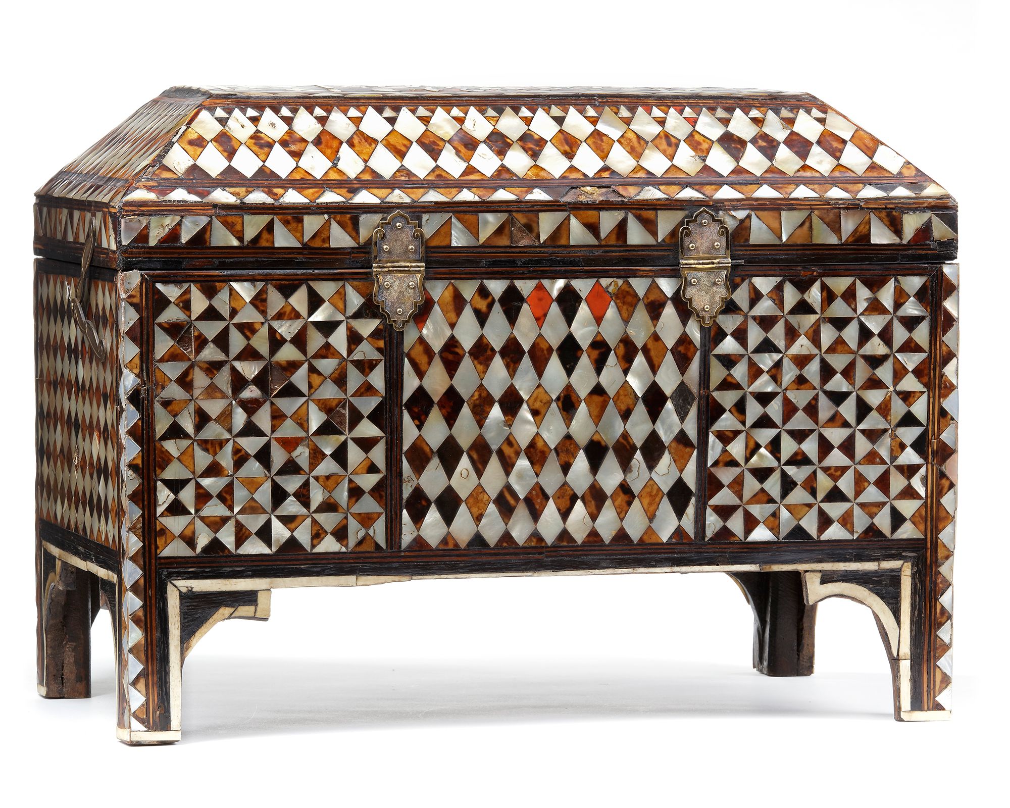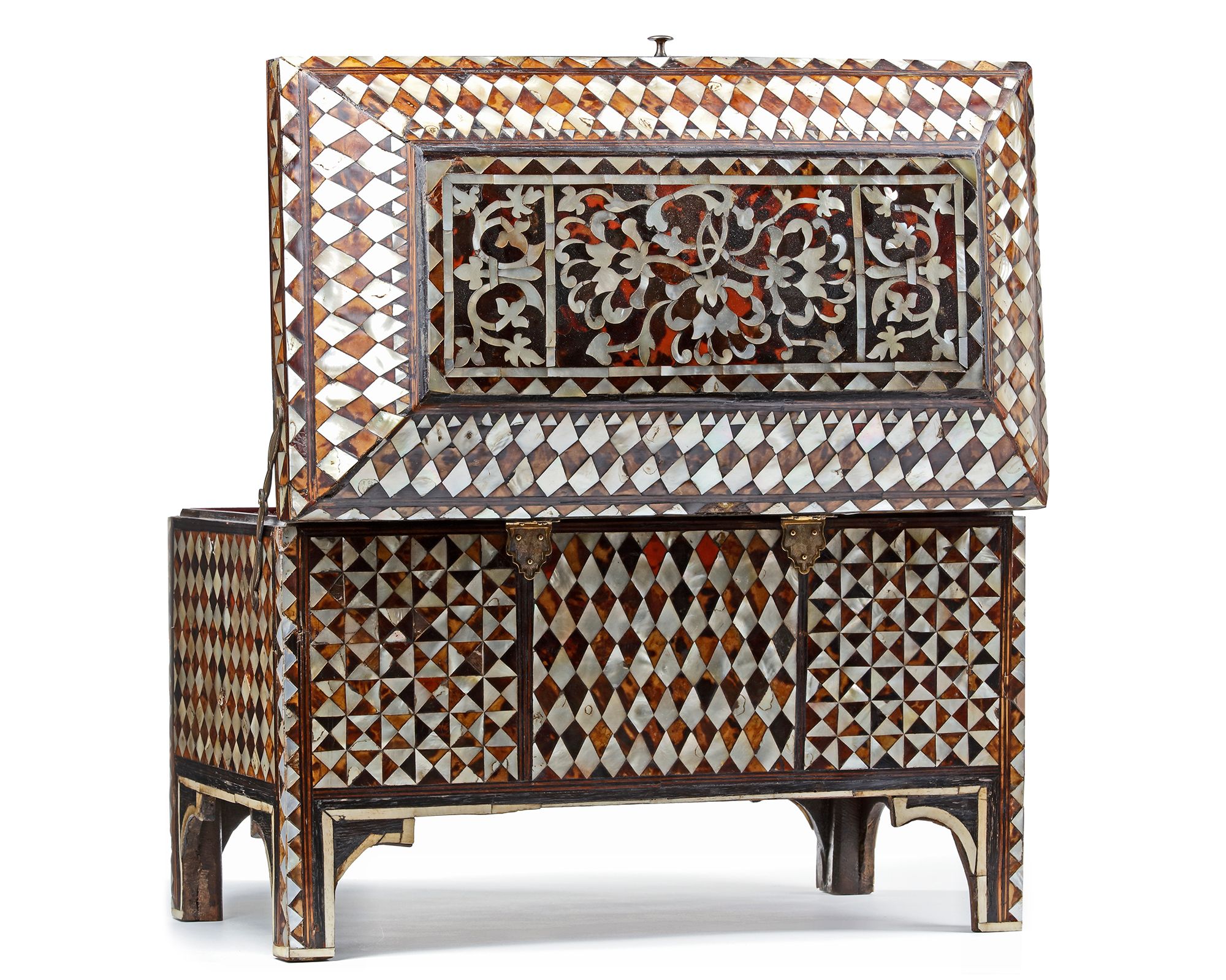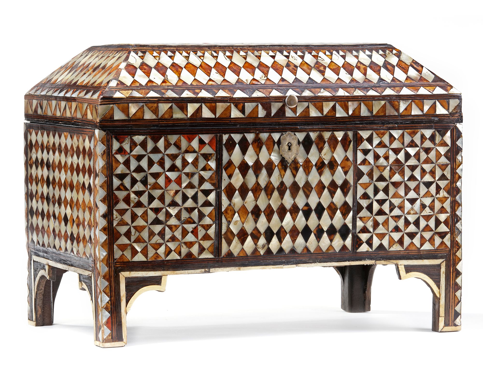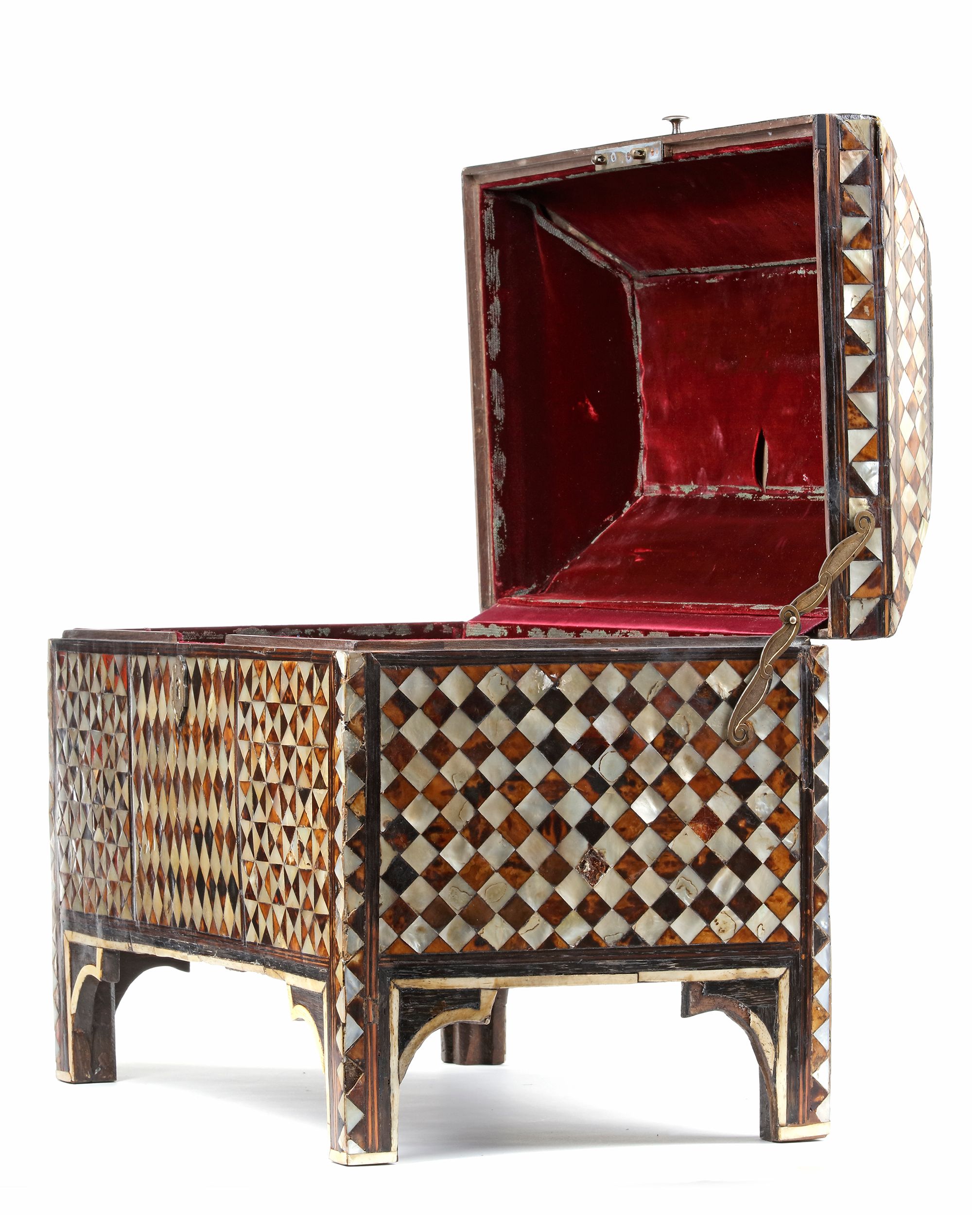 Of rectangular form on bracketed feet with a hinged bevelled lid, the sides and cover inlaid with tortoiseshell and mother-of-pearl, with panels of diamond, cube trellis and chequerboard patterning bordered by narrow bands of inlaid wood. The centre of the lid decorated with mother-of-pearl scrolling split and full palmettes on a tortoiseshell ground, legs inlaid with mother-of-pearl and tortoiseshell with diamond patterning, brass hinges and key, the interior lined with red silk.