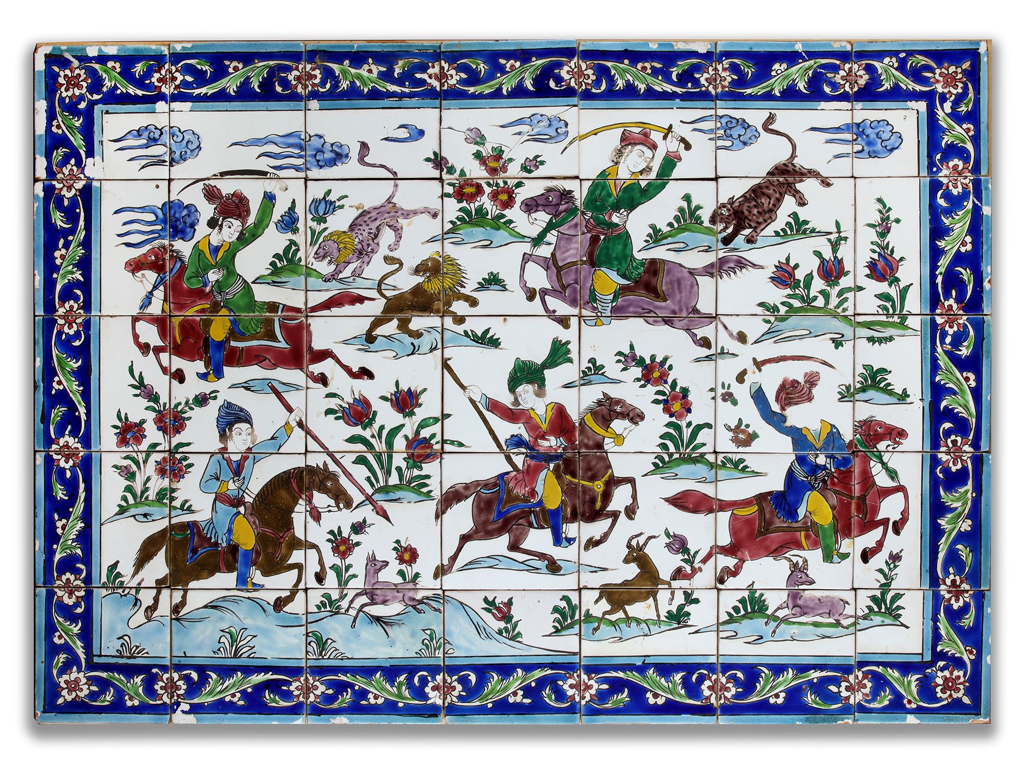 Very decorative pottery tiles, depicting a royal hunting scene, mounted on a wooden panel. 73.5 by 102 cm.