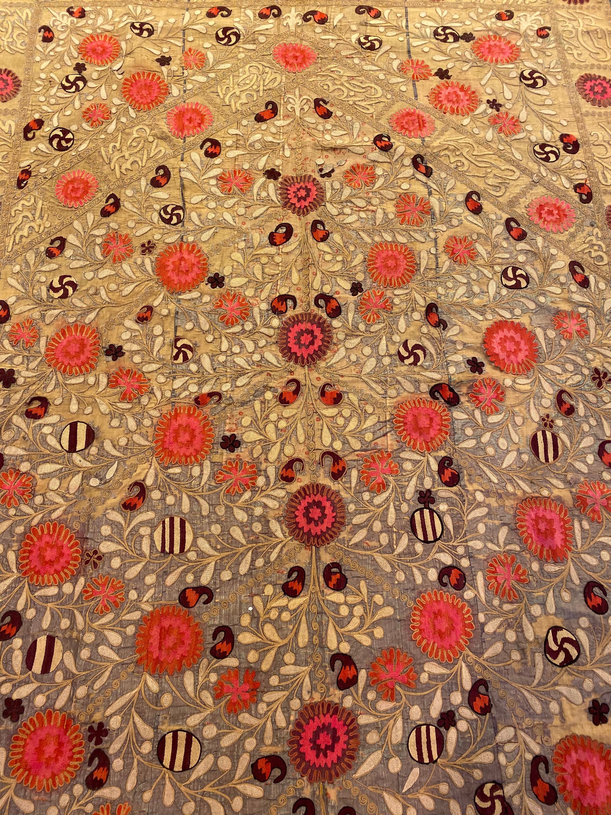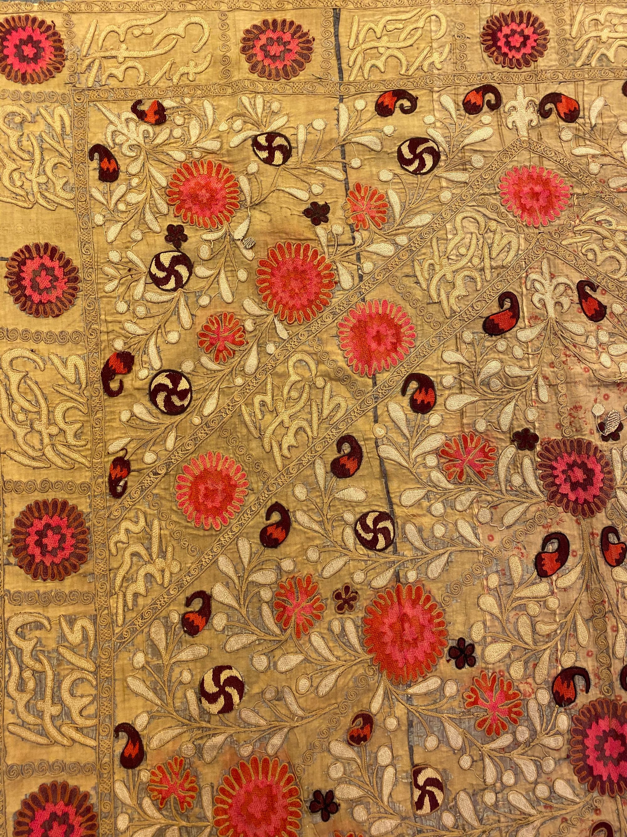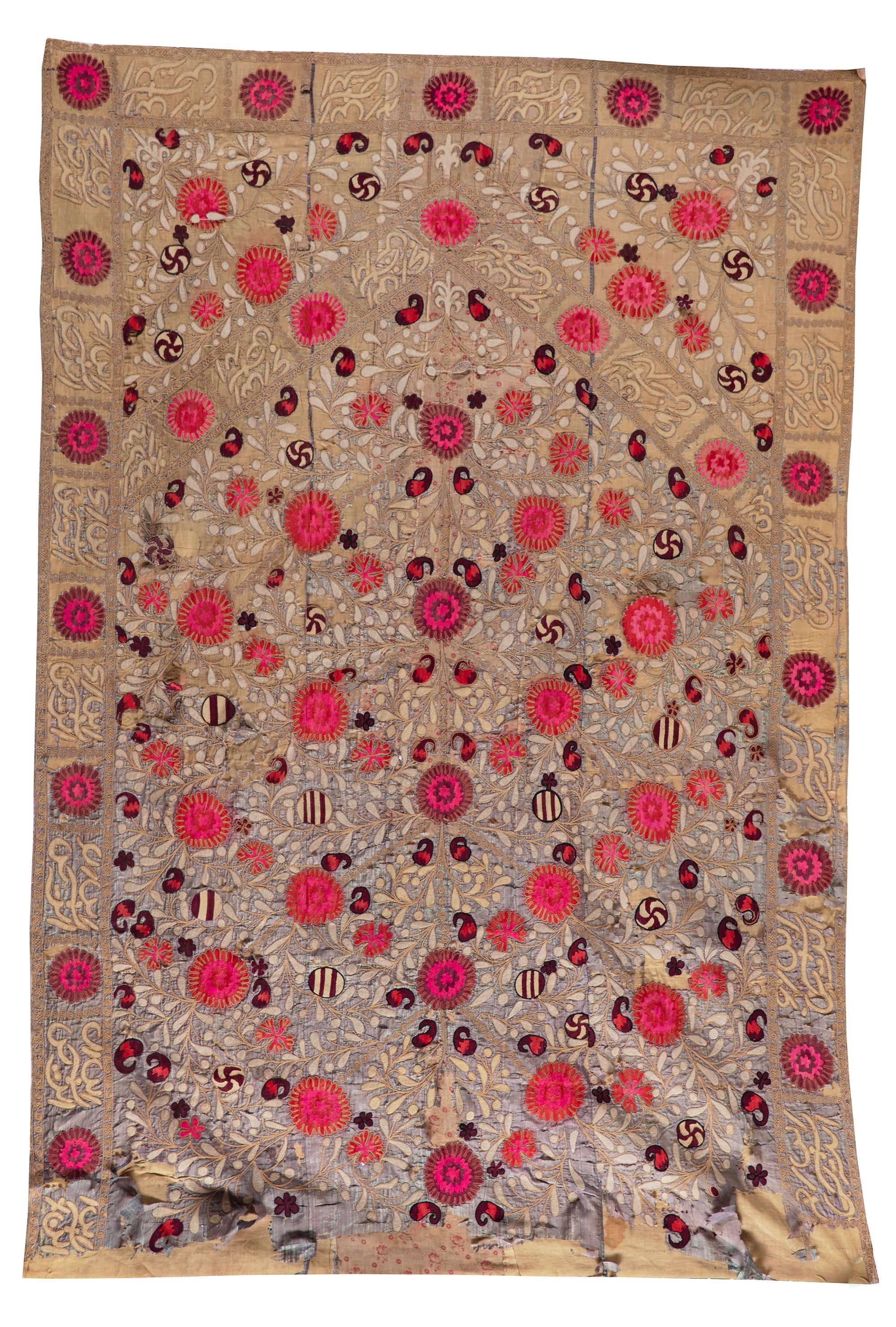 From the Farsi word for needle, “suzan,” Suzani is a type of embroidered and decorative tribal textiles, some of the most outstanding examples of which may be found in Central Asia. Suzani is designed for many different purposes, from apparel to decoration. Decorated with large flower heads with foliage and Arabic calligraphy.