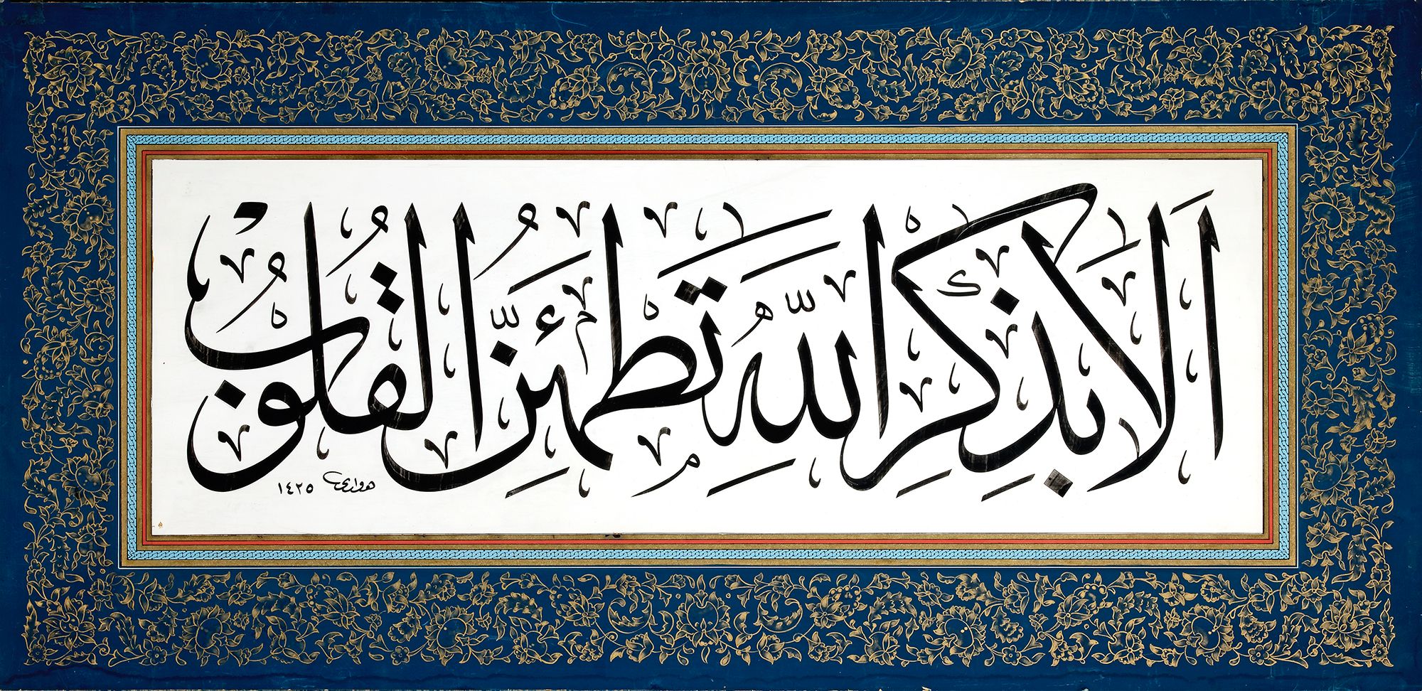 Arabic manuscript on paper, written in elegant large black thuluth script Quran 13 surah Al-Ra'd v.28. with gilt and polychrome borders, the outer border gilt with arabesque on a blue ground. Written by the calligrapher Mahmoud Hawary (1939-2010). 97 by 47 cm.