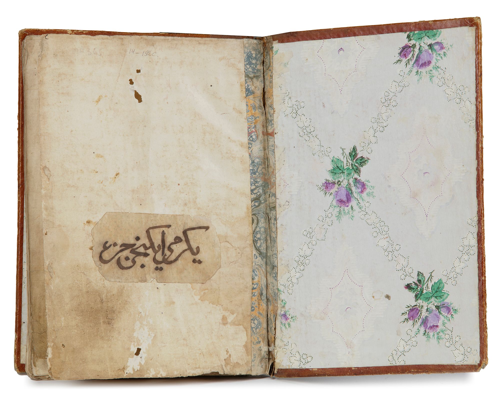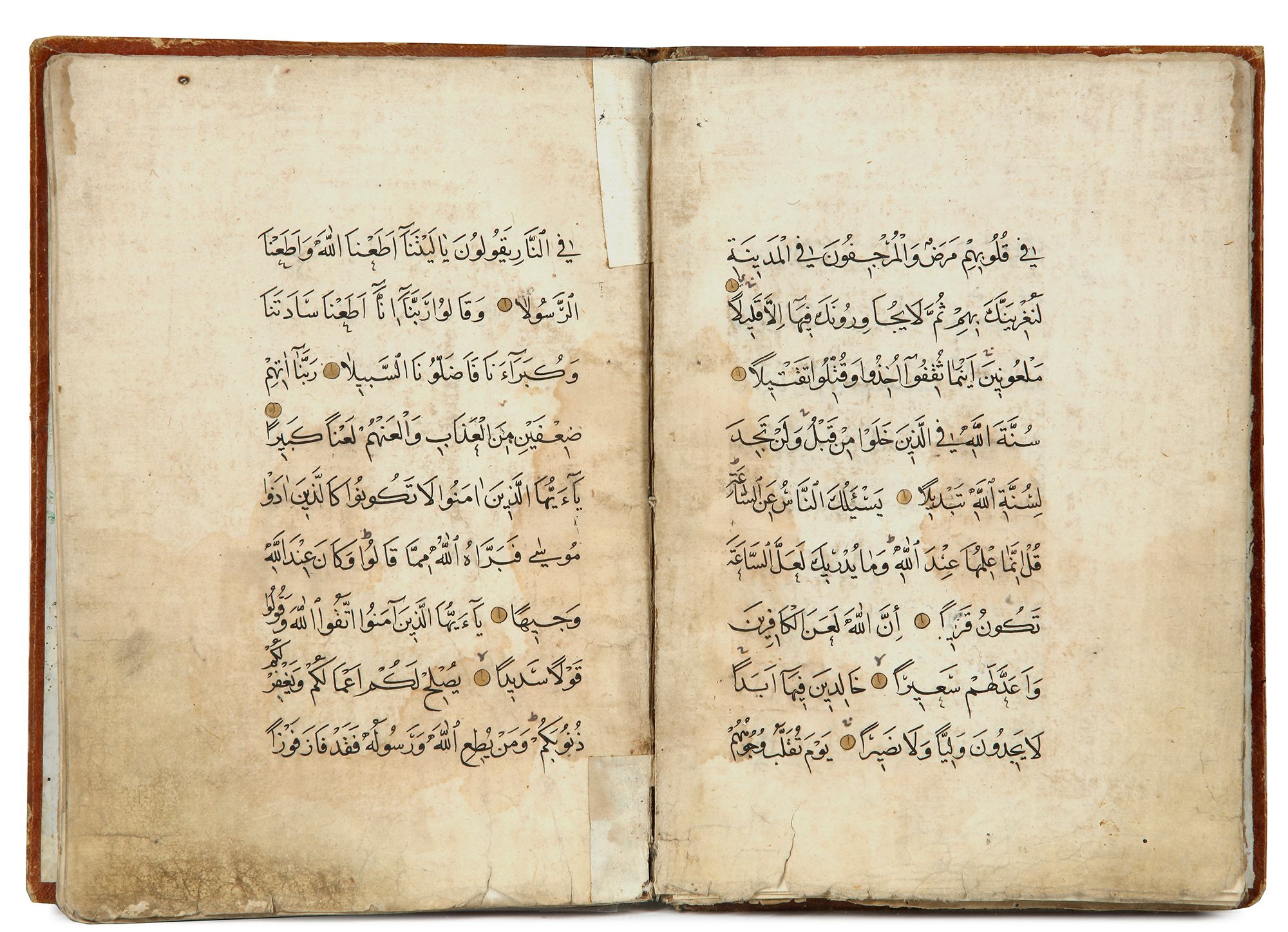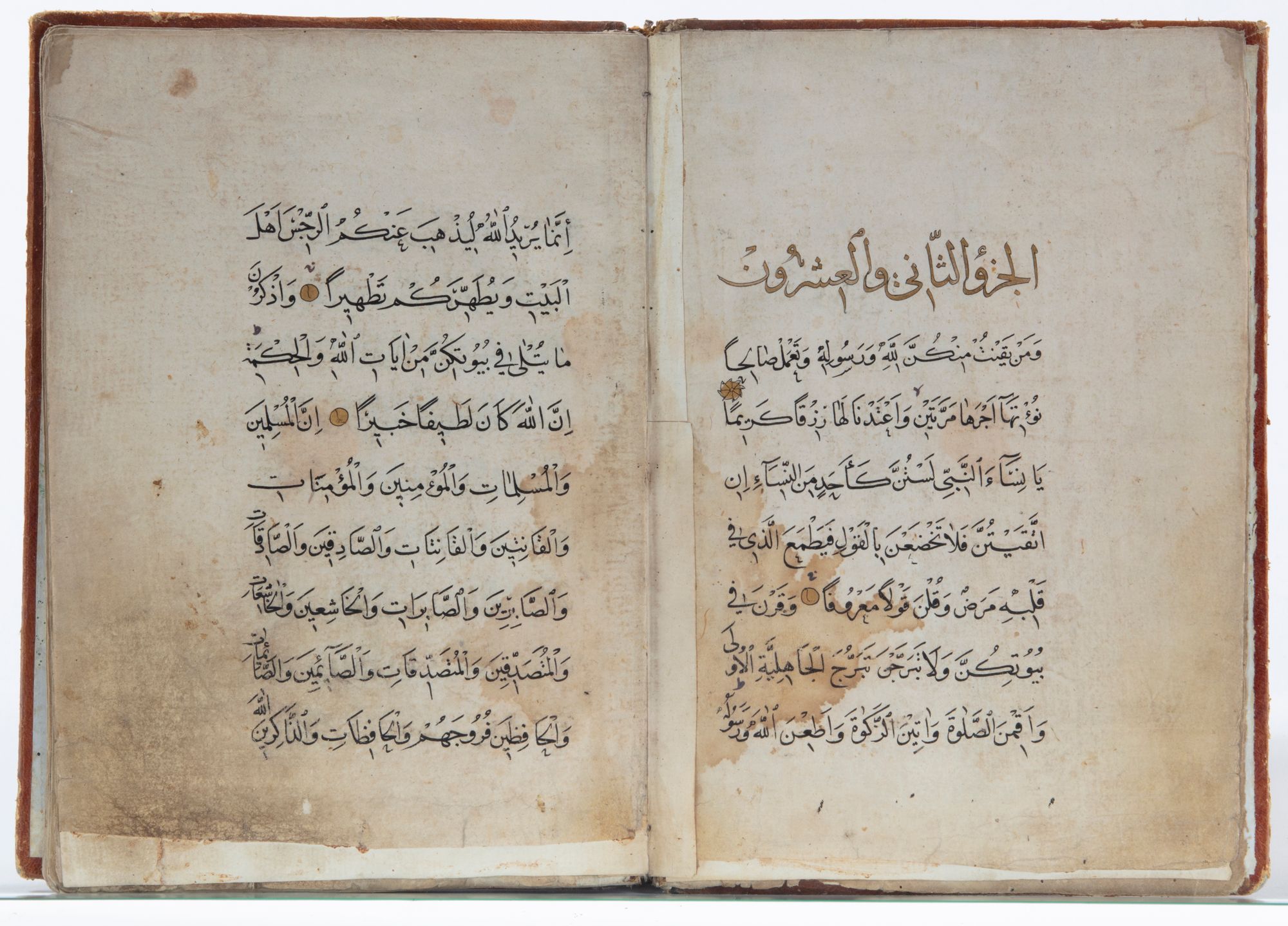 An Arabic manuscript on paper with 21 leaves and 2 fly leaves, 9 lines to each page in bold black naskh script. Comprising Quran juz or section 22, surah headings in gold naskh. Gold verse markers surrounded in black with gilt marginal markings of ‘hezb. Brown morocco binding. 18 by 25.5 cm.
