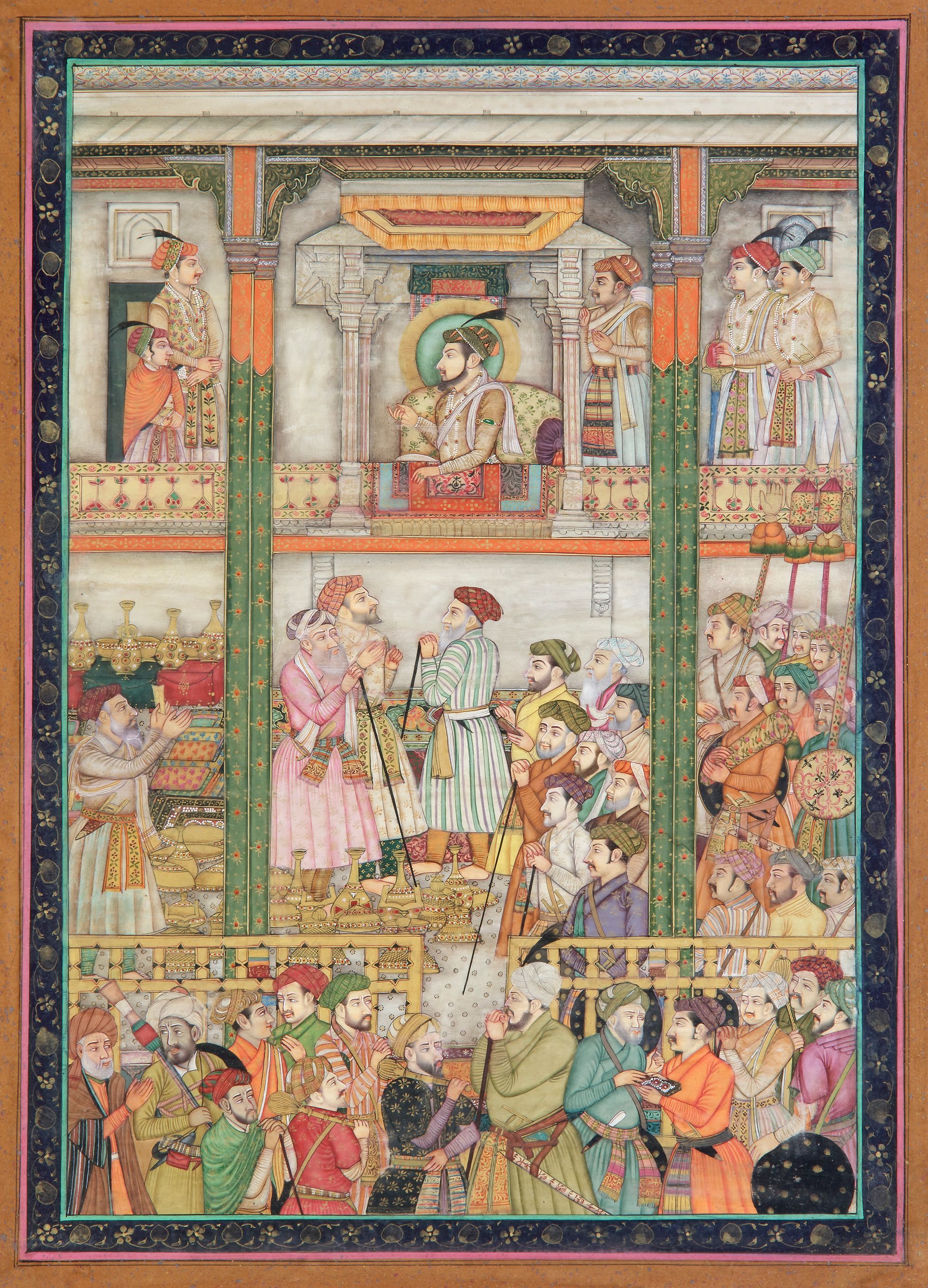 The scene shows the occasion on which Mughal Emperor Shah Jahan honors his son Aurangzeb in Agra before his wedding to Dilras Banu Begam. Aurangzeb had just returned from the Deccan, where he was stationed to oversee the Mughal conquest of that region of India.