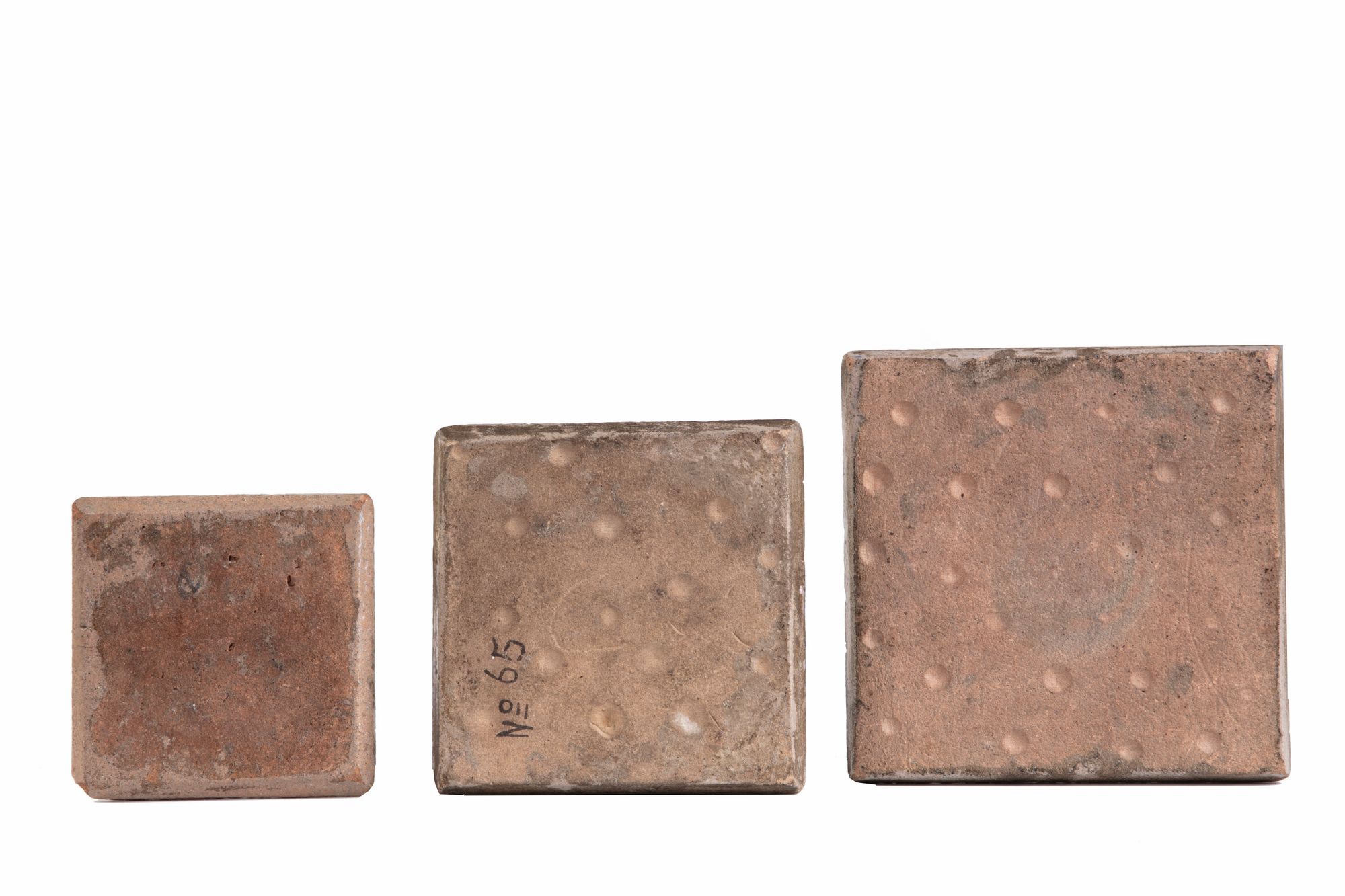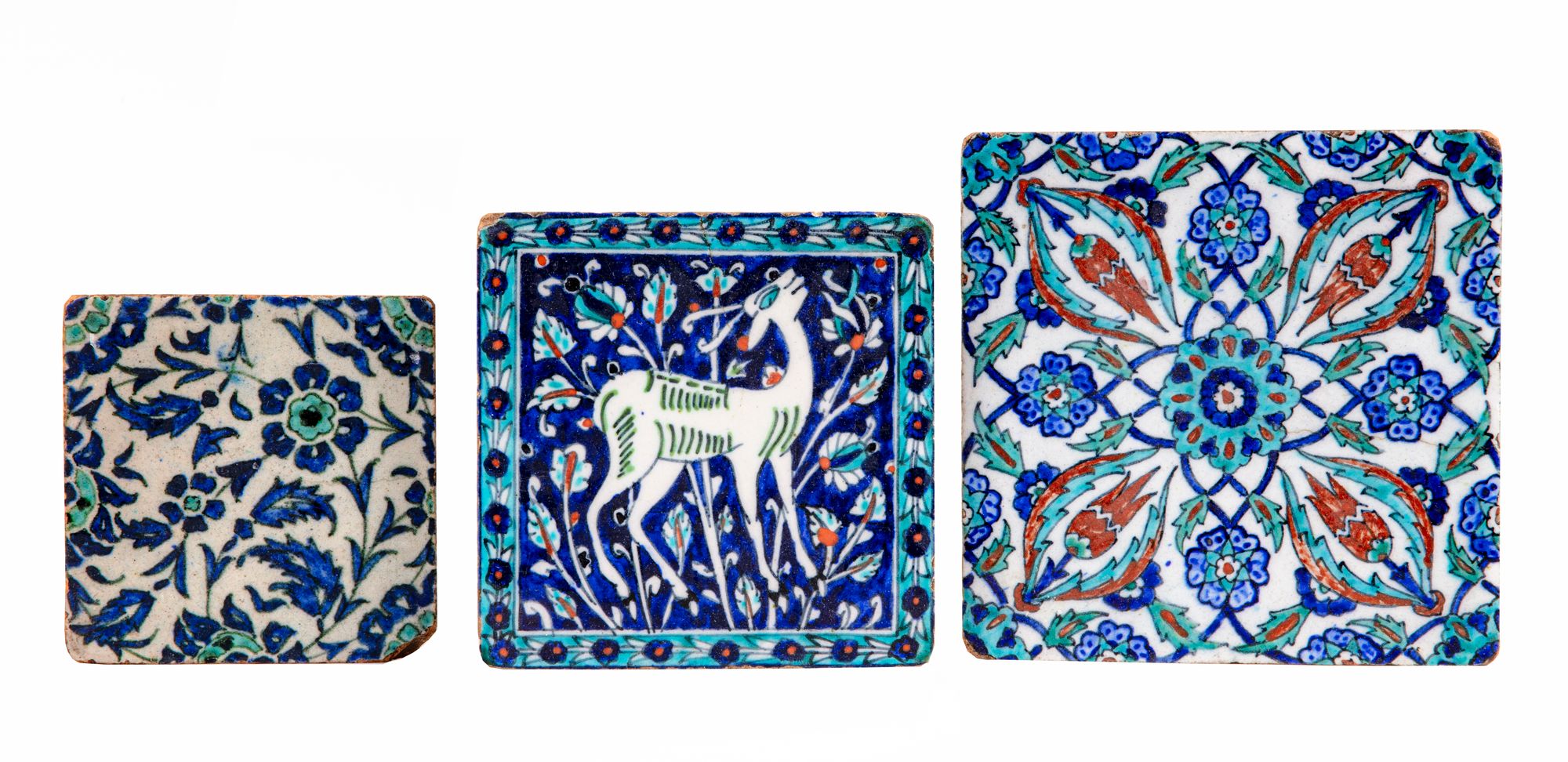 Each of square form, - Decorated on white ground with hyacinths surrounded by four tulips and smaller flower heads with scrolling vines, 18 by 18 cm. - Reverse decorated with a deer standing amongst flower with a floral border, 16 by 16 cm. - Decorated with hyacinths and chrysanthemums to the borders with saz leaves, 12.5 by 12.5 cm .
