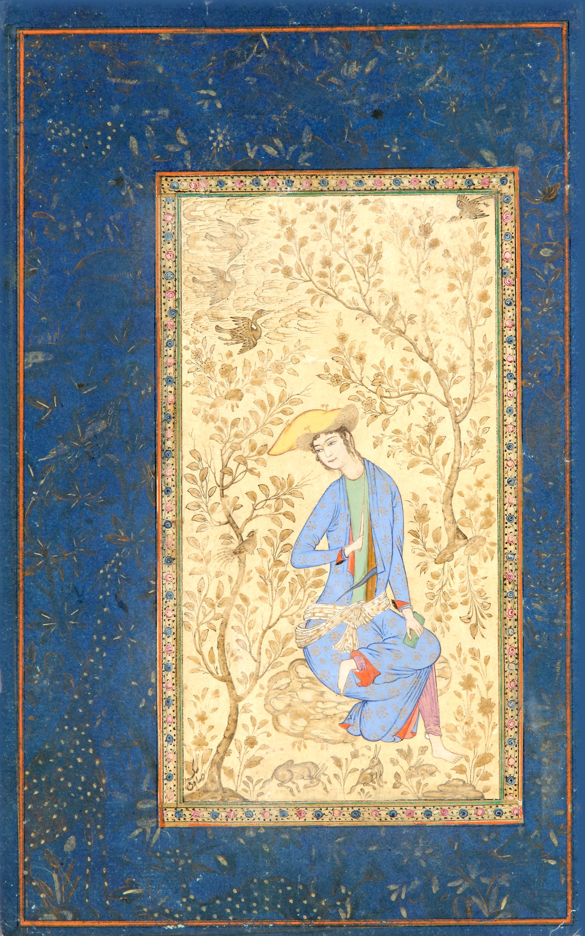 Pencil and ink on paper, heightened with gold, laid down on album page, depicting a seated youth amongst animals in a landscape. Ruled with a border of flower scrolls, the outer border with gilt flowers on a deep blue ground. Folio: 18.5 by 29 cm. Painting: 11 by 20 cm.