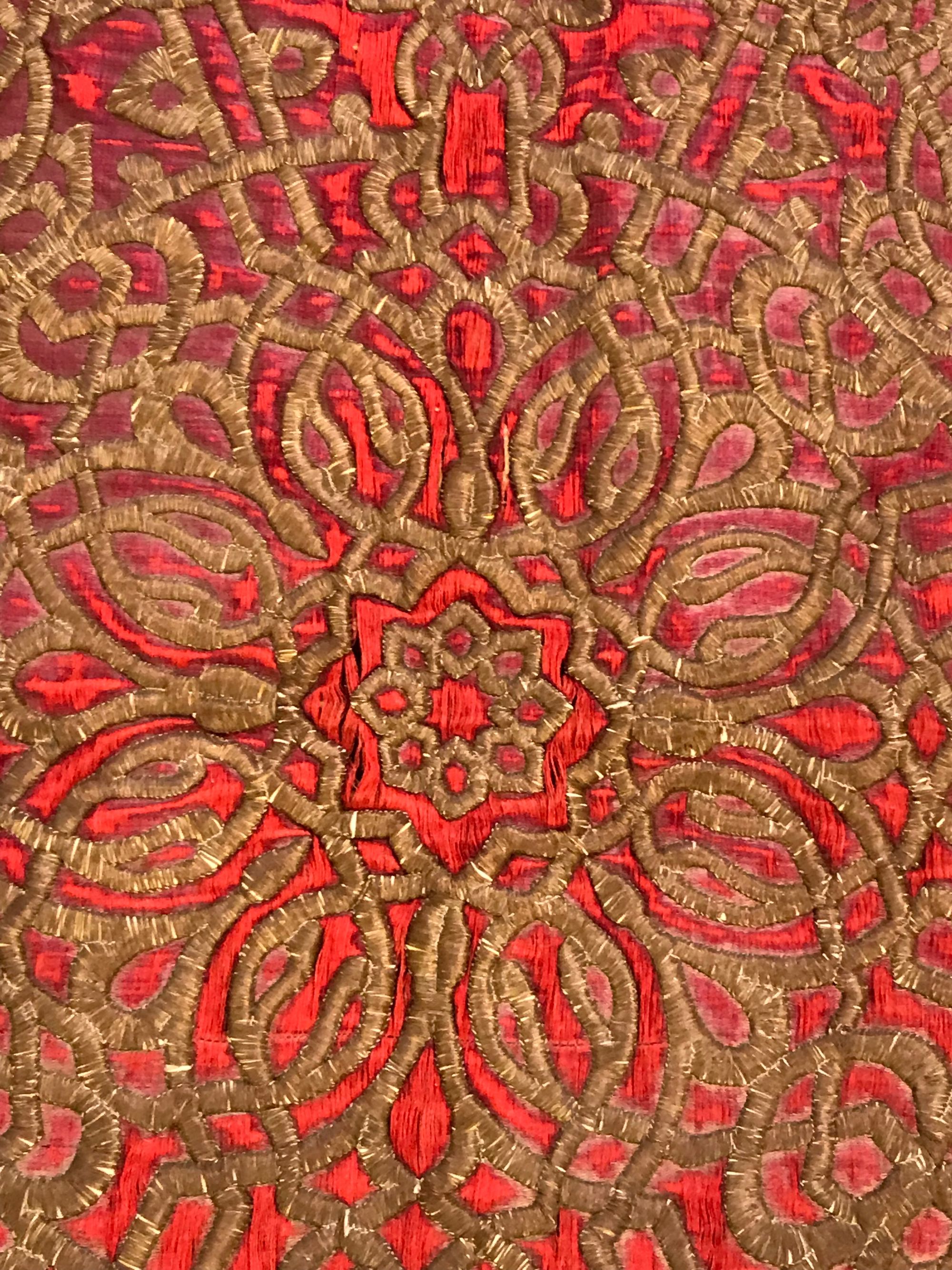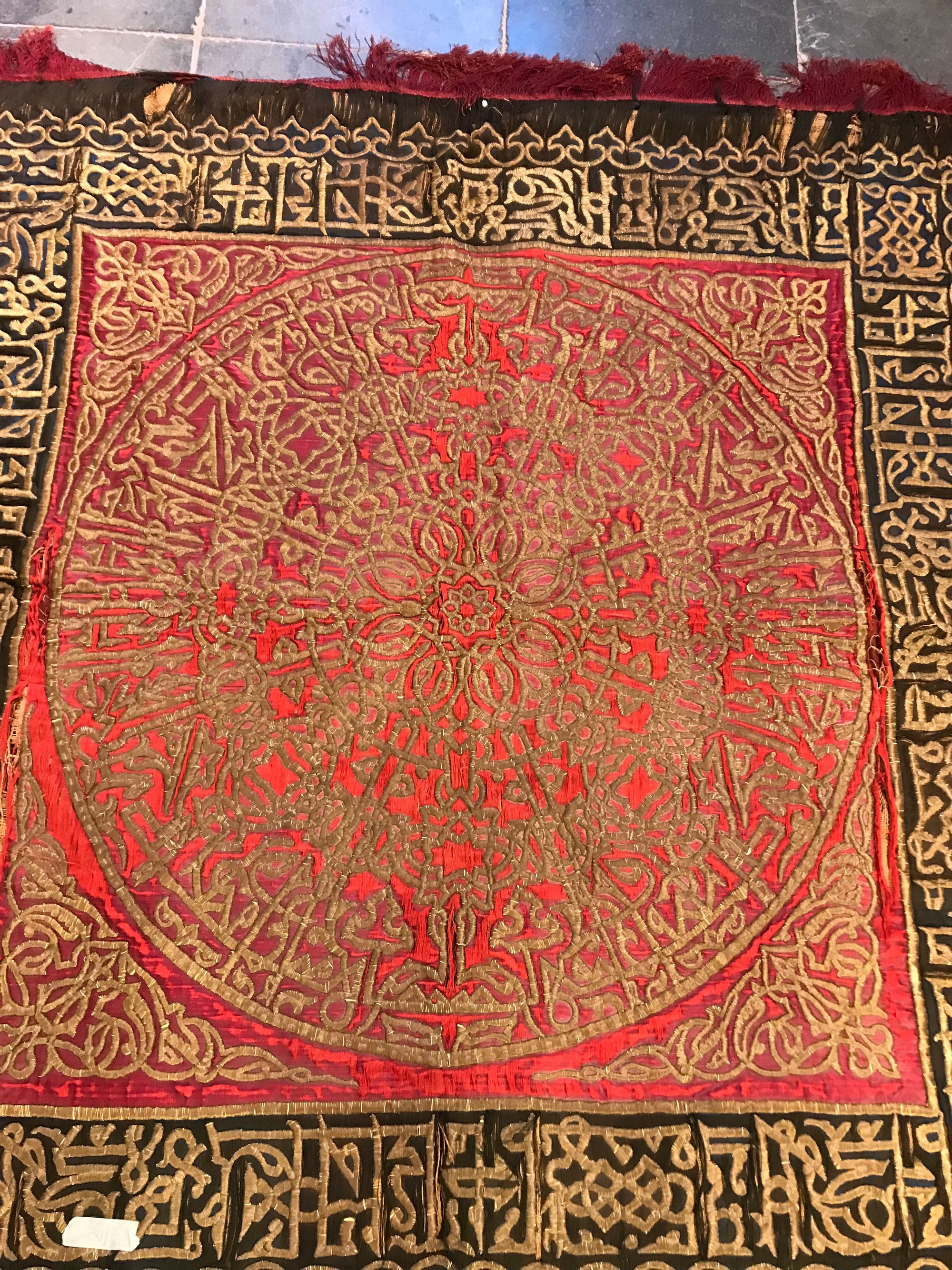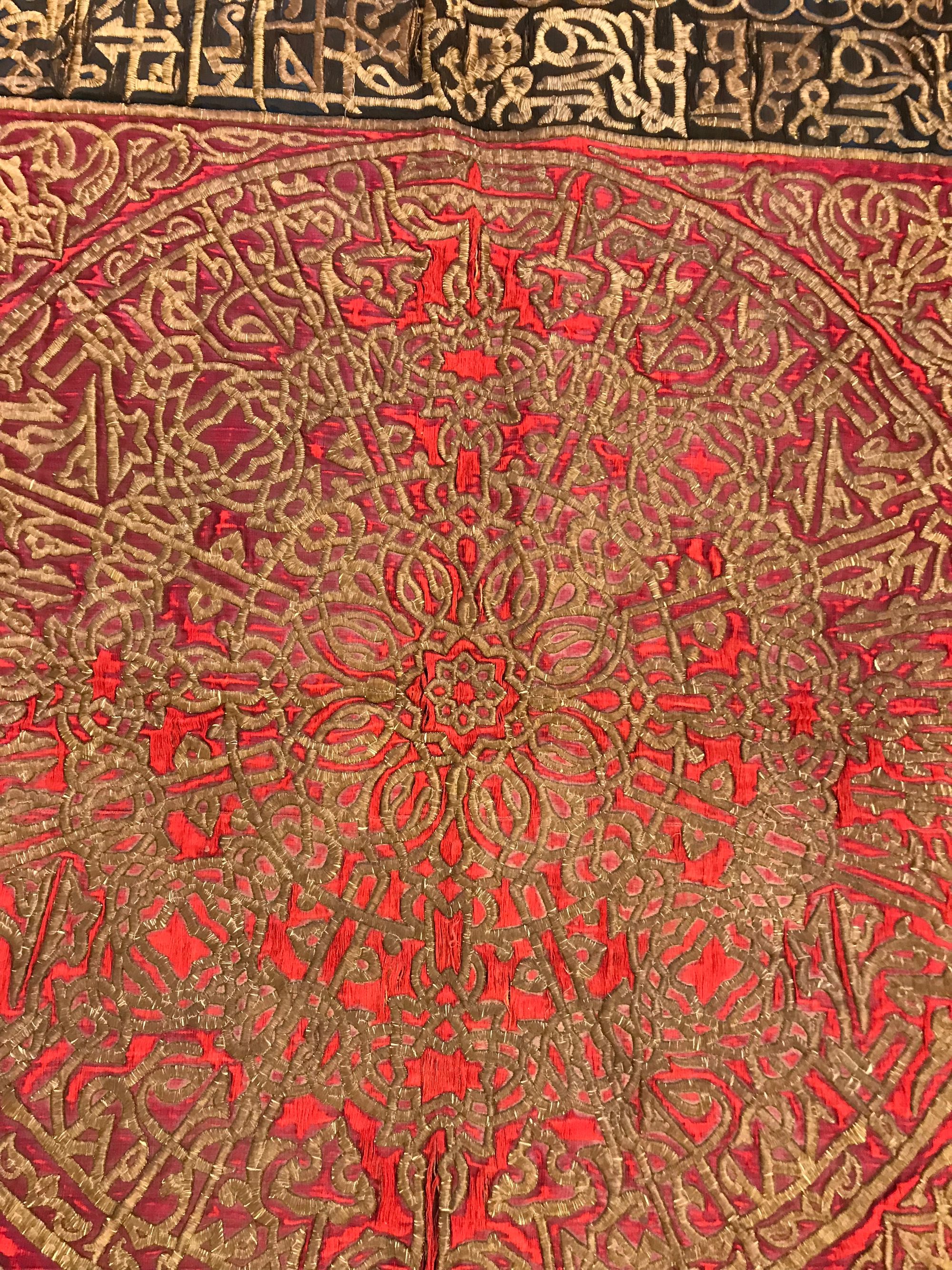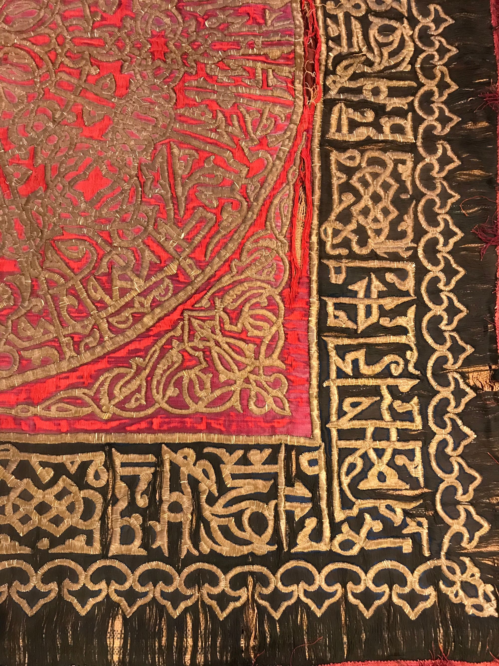An Ottoman embroidered hanging panel, embroidered in gilt threads with Arabic calligraphy and scrolls on a red and black ground. 150 by 155 cm.
