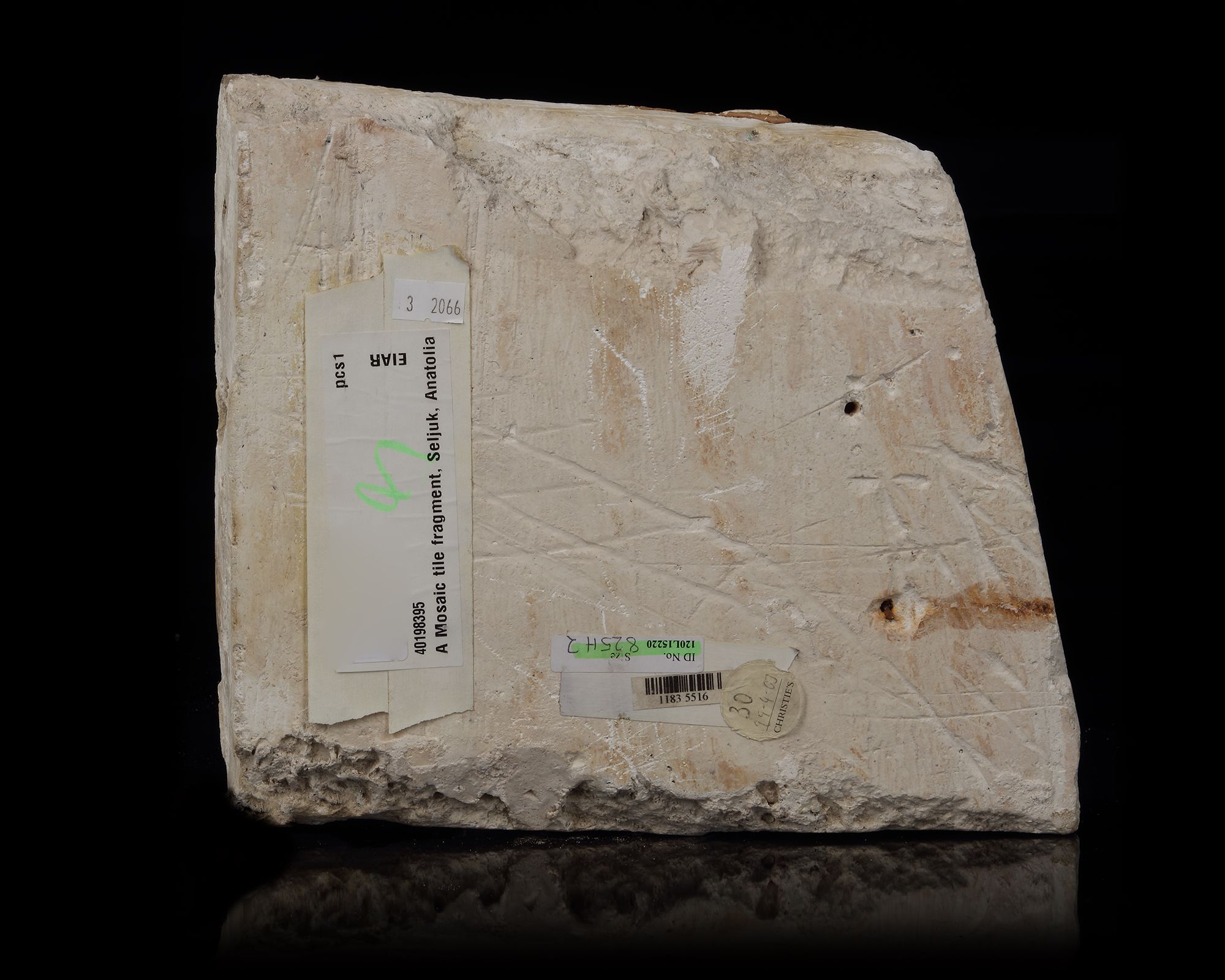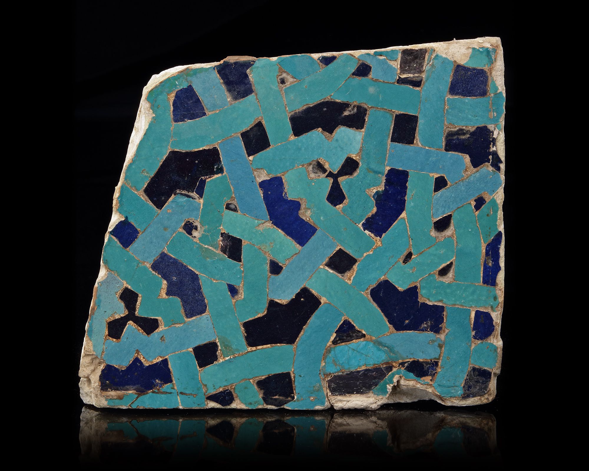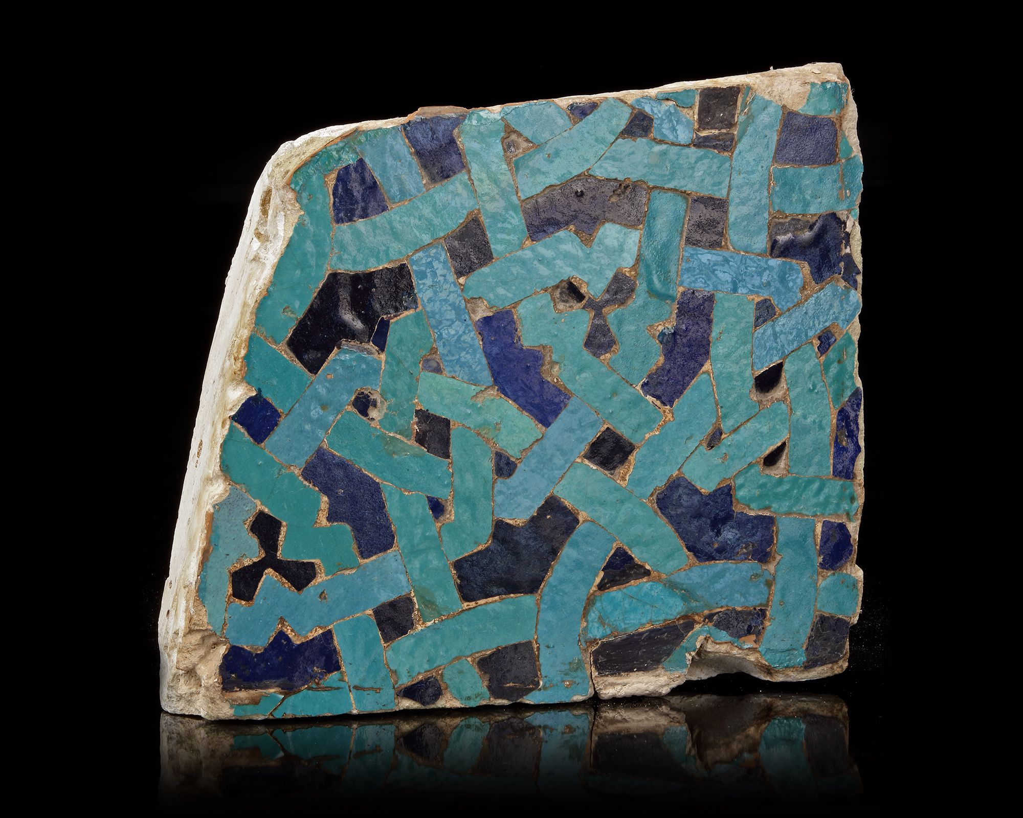 Decorated in the mosaic-tile technique with turquoise, cobalt blue and dark blue (or manganese) sections set in a complex geometric interwoven design.