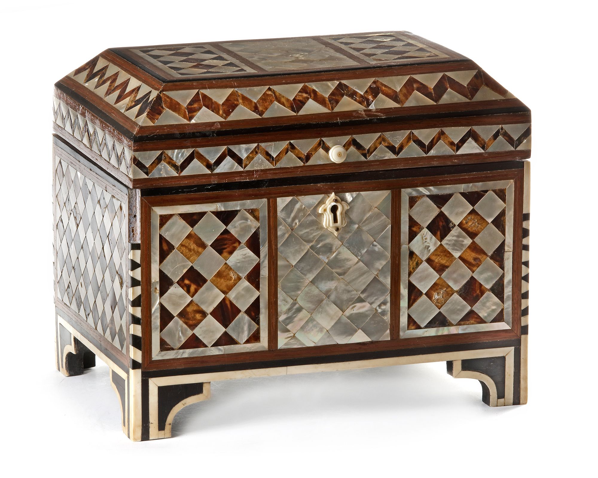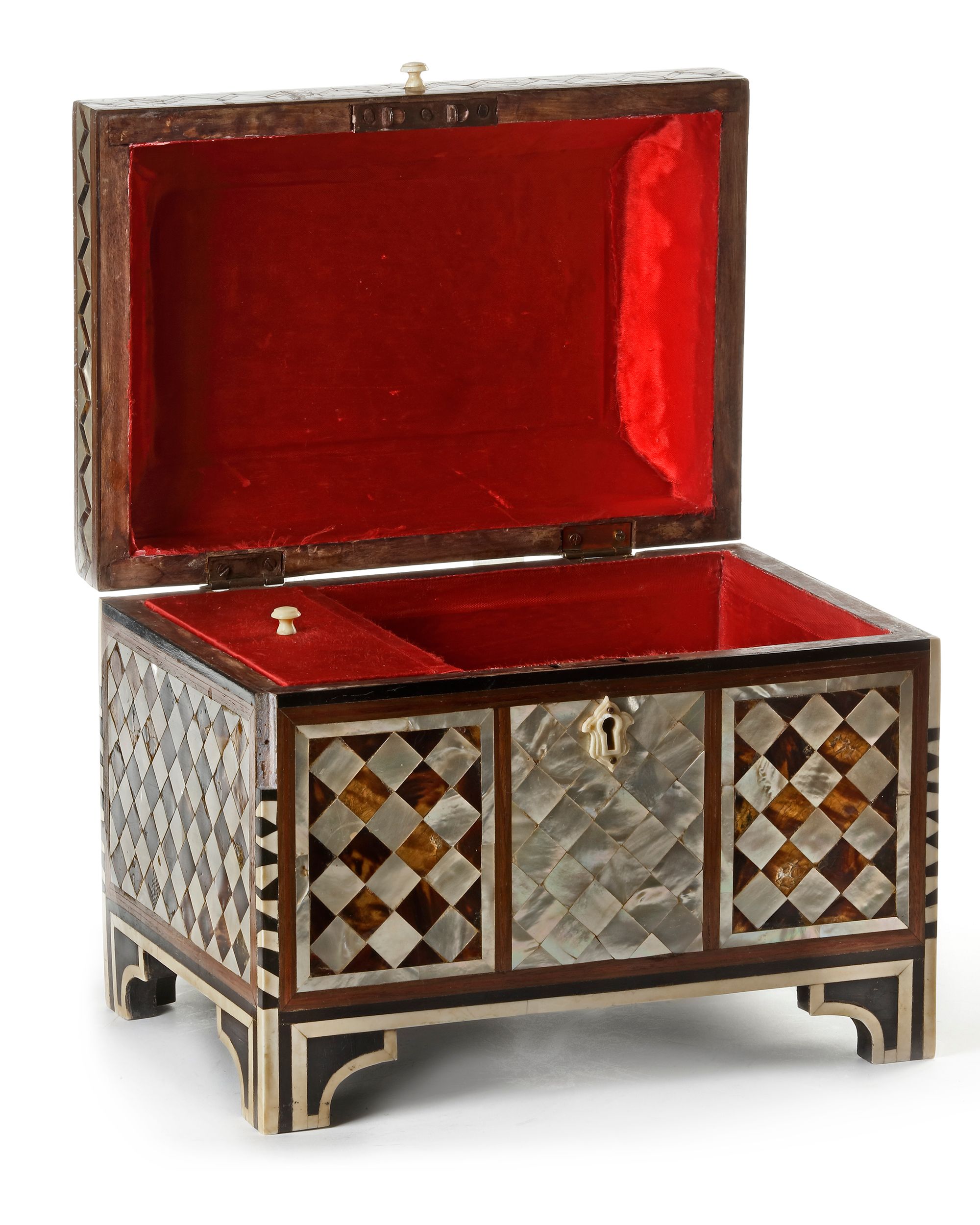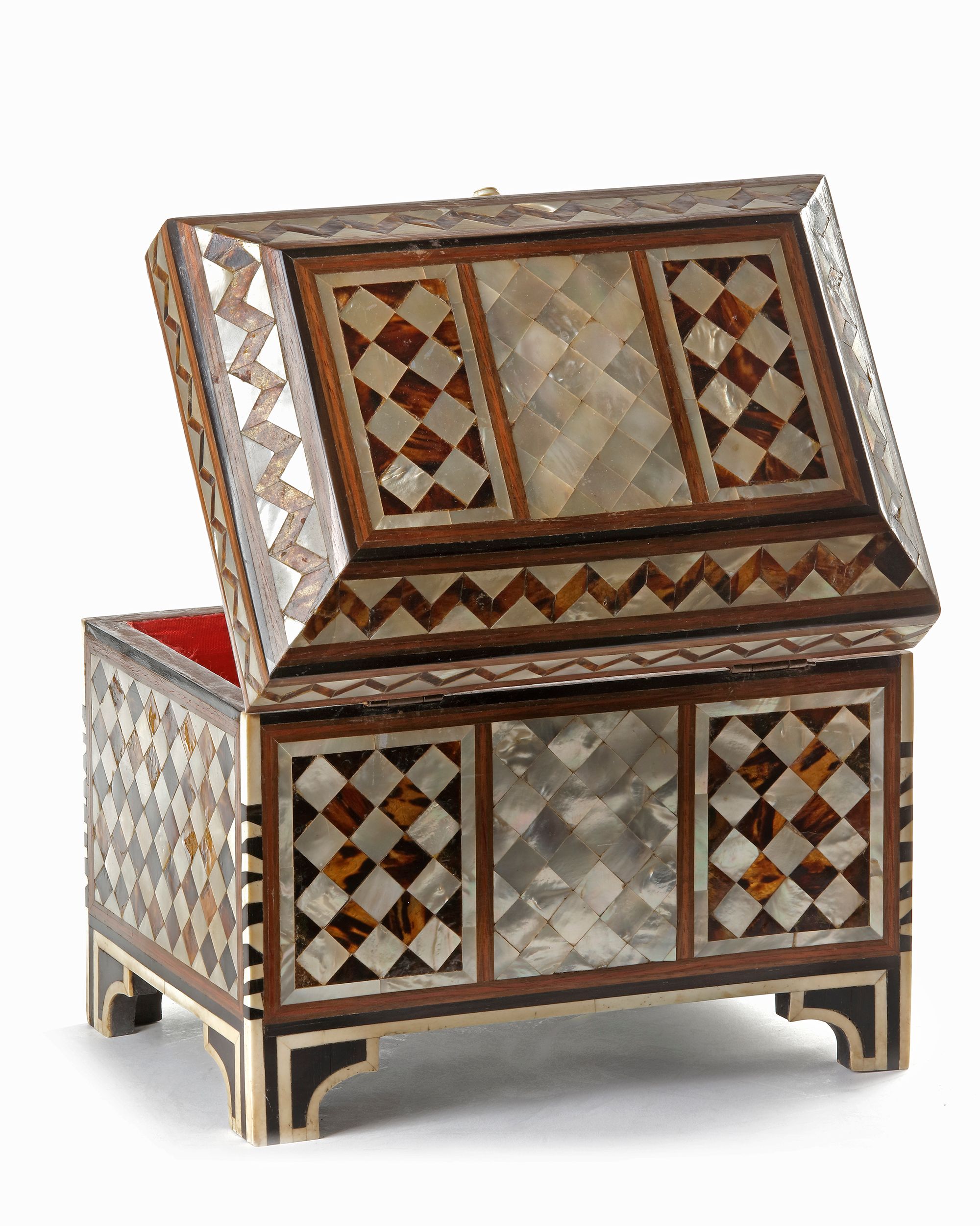 Of rectangular form on raised legs with curved spandrels and hinged coffered lid, the surface covered in inlaid mother-of-pearl and tortoiseshell panels in triangular geometric shapes, edges with band of bone inlays. 23 by 28 by 20 cm.