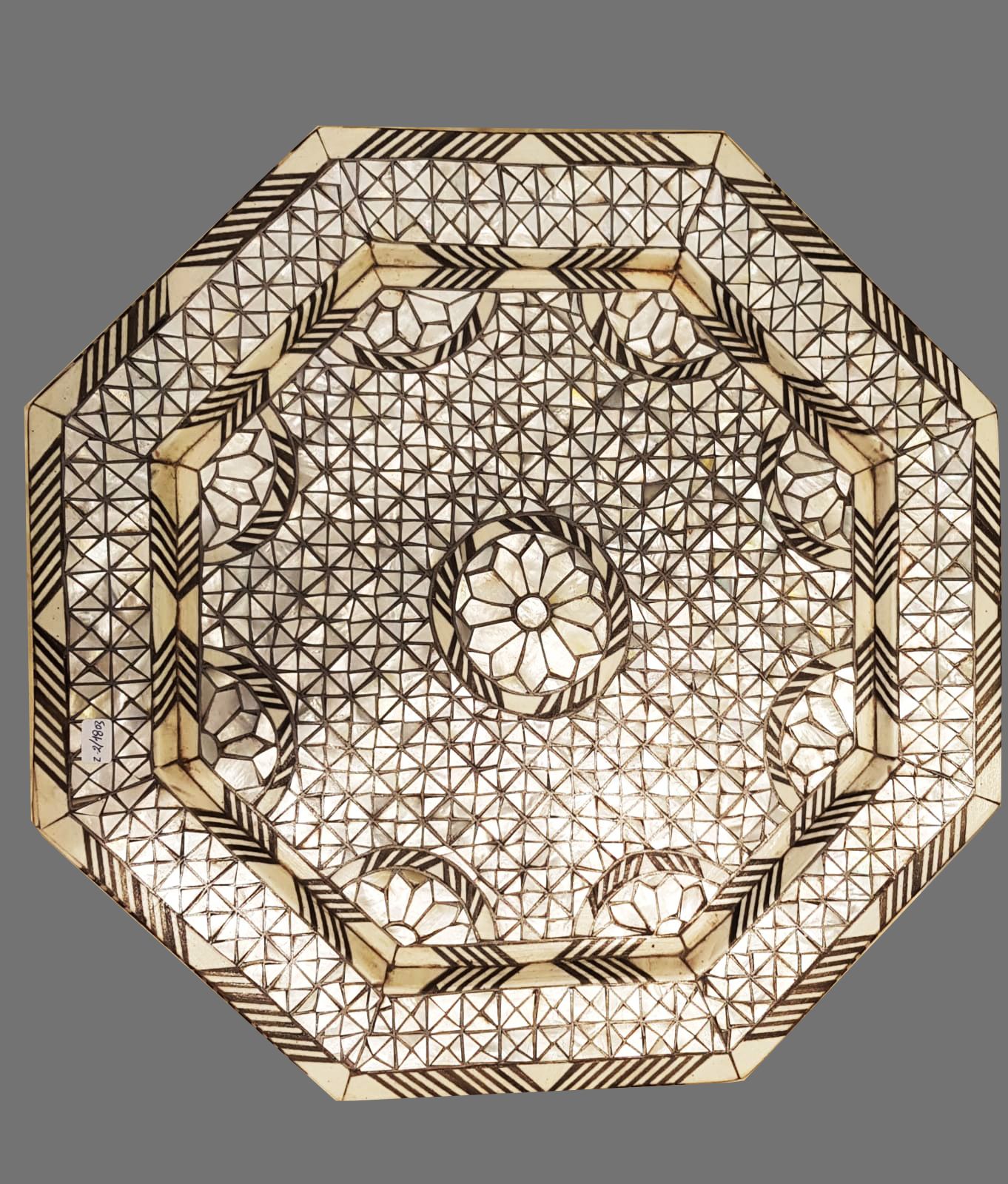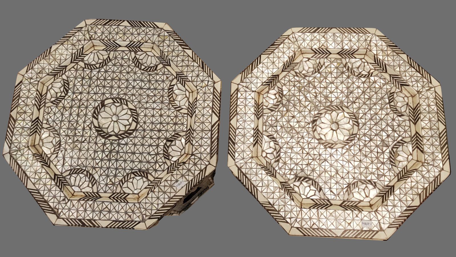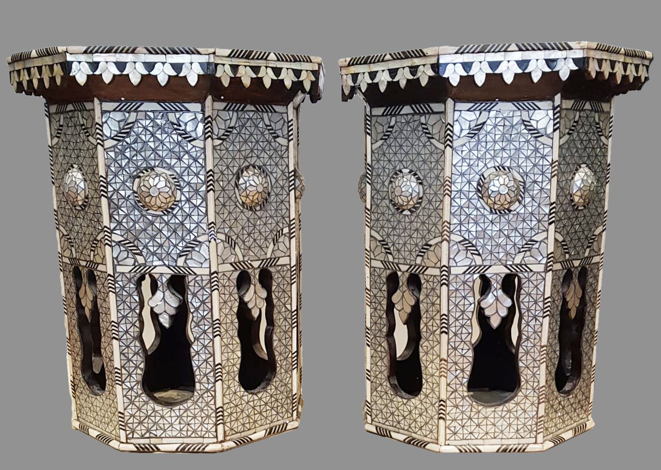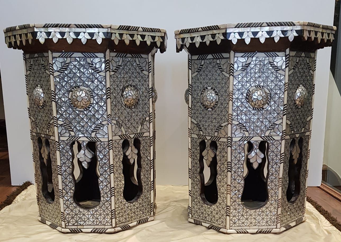 Two wooden octagonal tables, inlaid with mother of pearl .
