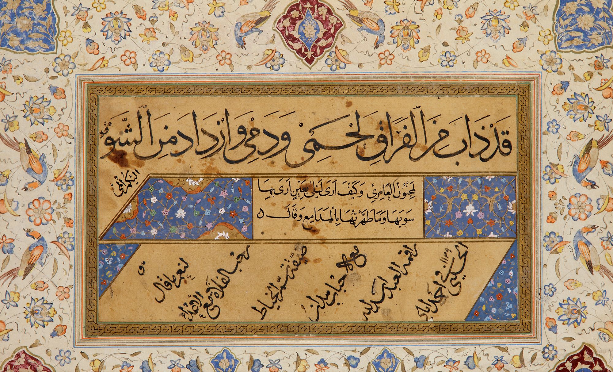 Ink, opaque pigments and gold on paper, Arabic manuscript on paper, laid down on album page. Heading in large thuluth script in black ink, the bottom line in black muhaqqaq script and middle section in naskh script, borders of scrolling leaves in blue and gold, margins ruled in colors and gold. The outer margin decorated with birds perched amongst floral scrolls. Text panel: 15 by 26 cm.
