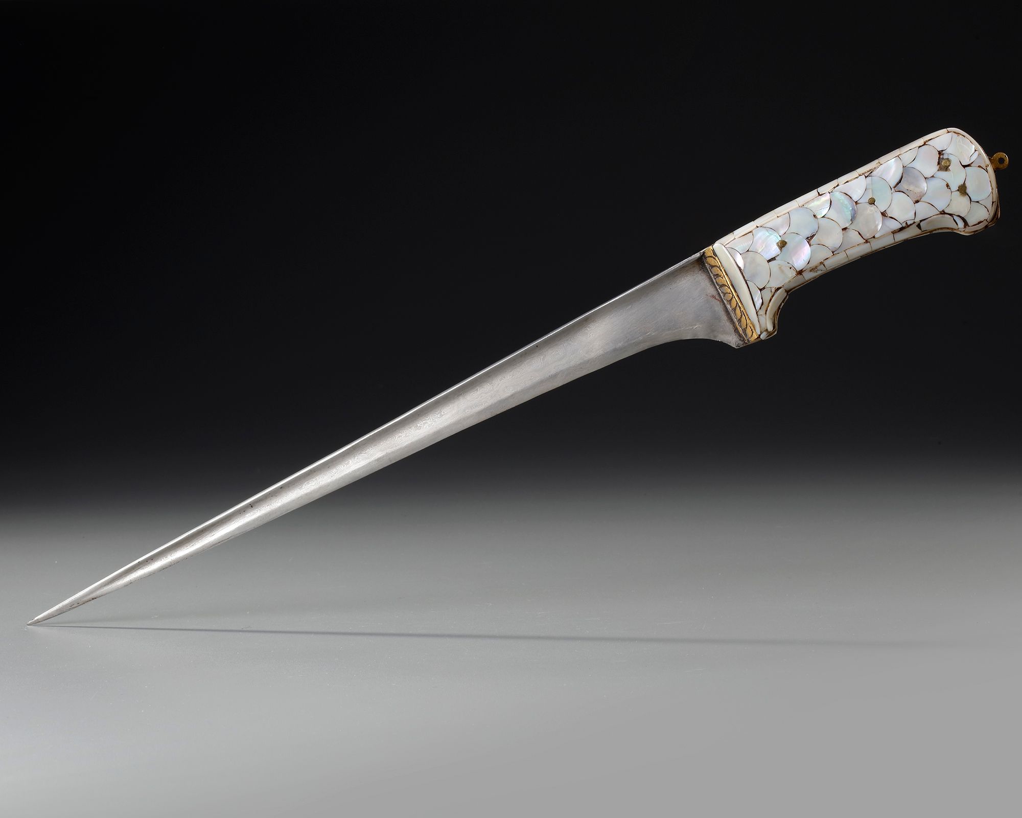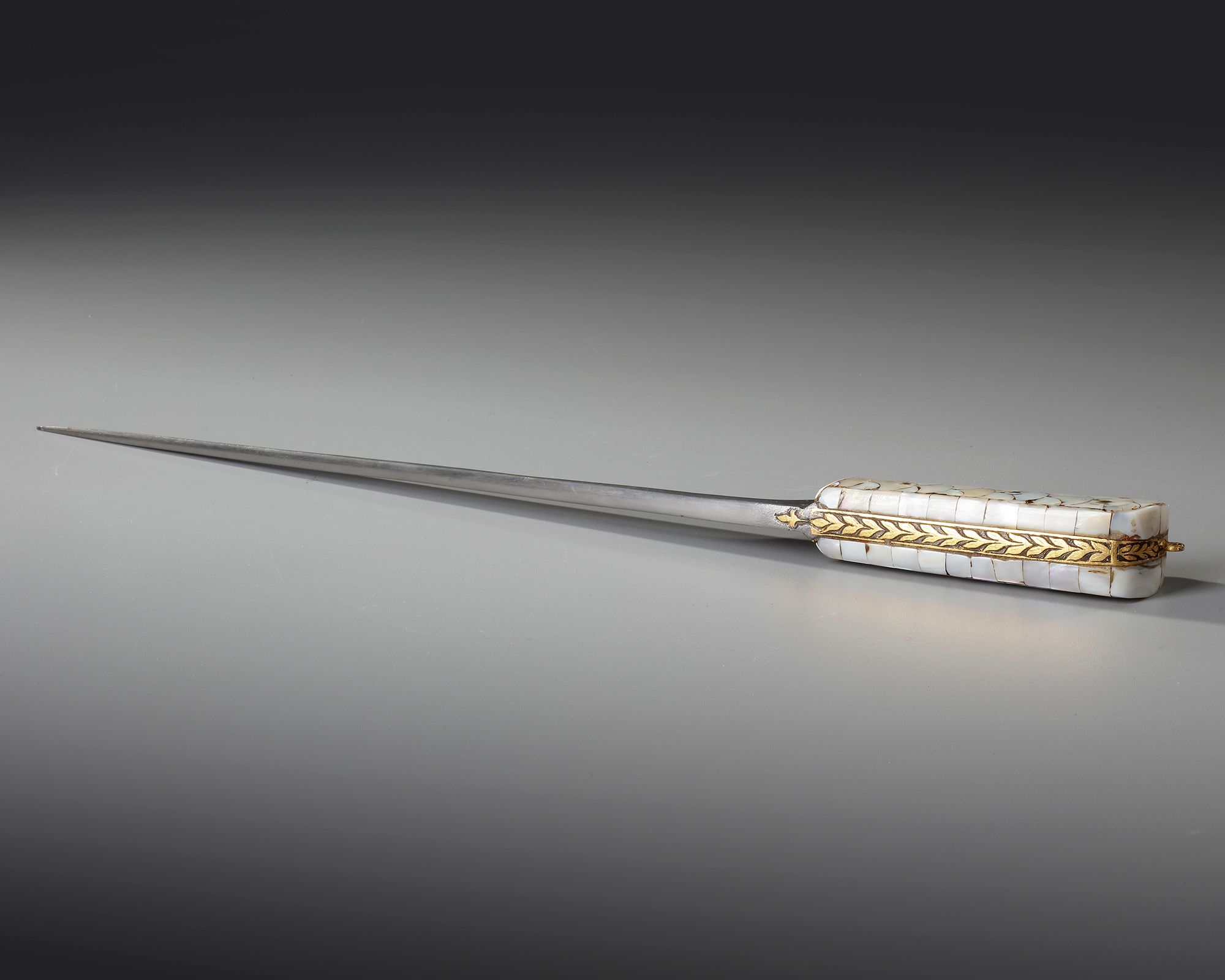 The single-edged watered steel blade of tapering form, the hilt clad entirely with mother-of-pearl plaques secured with pins, the spine with a palmette to the forte.