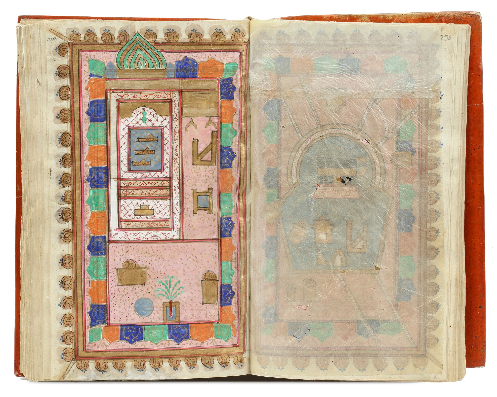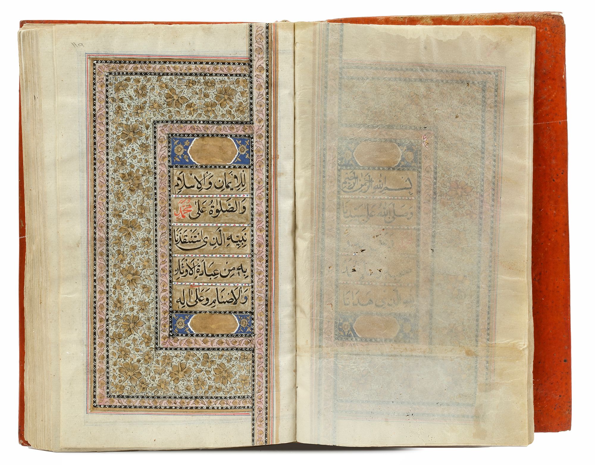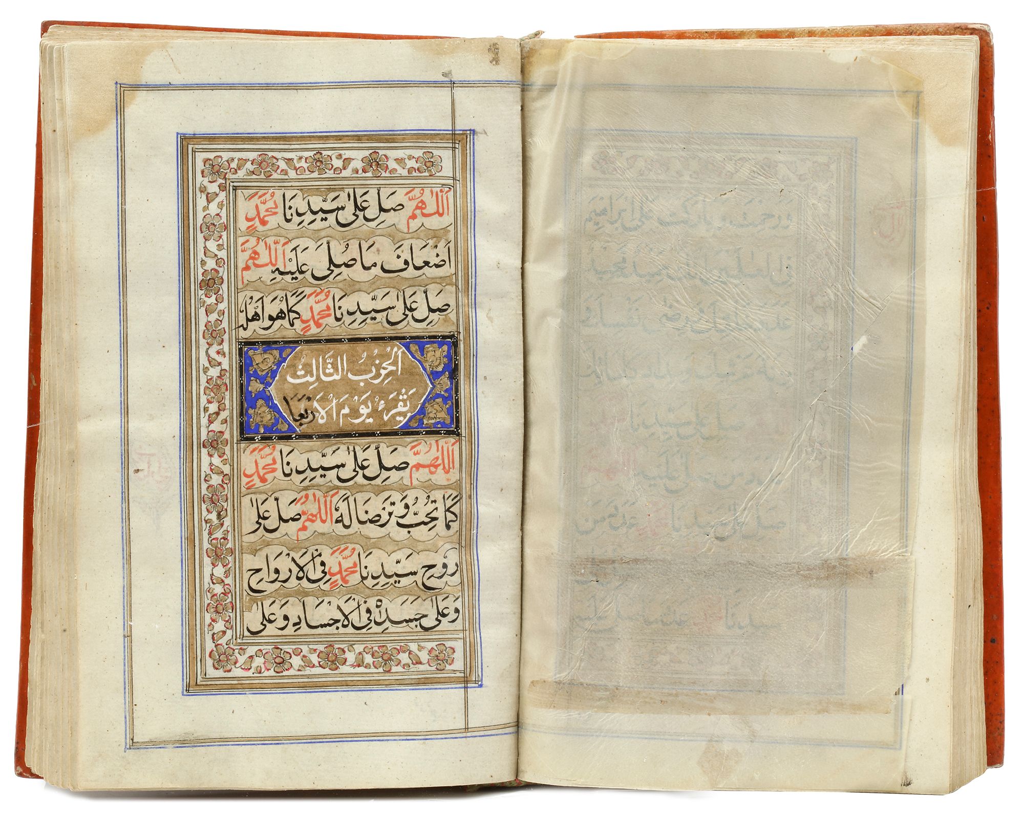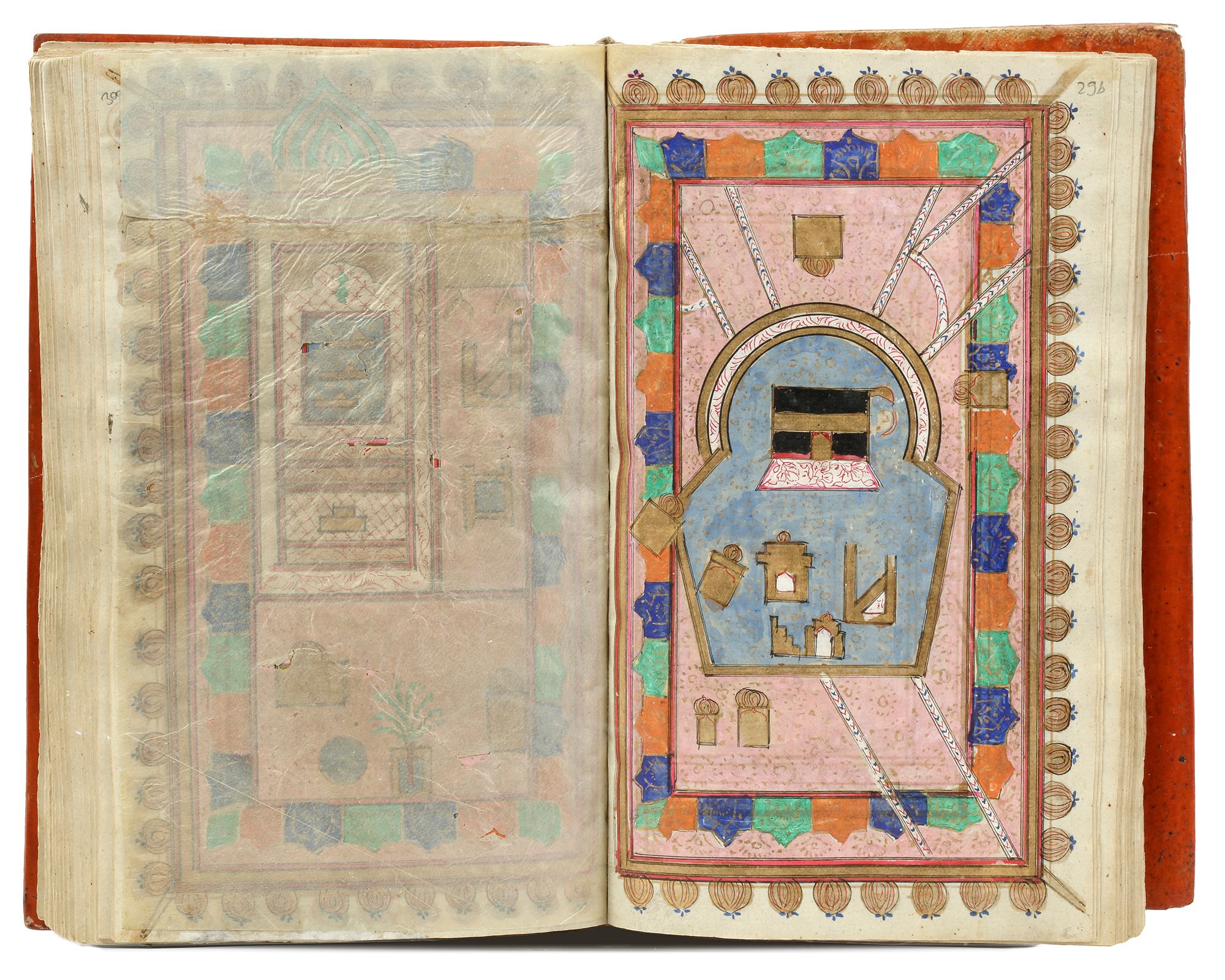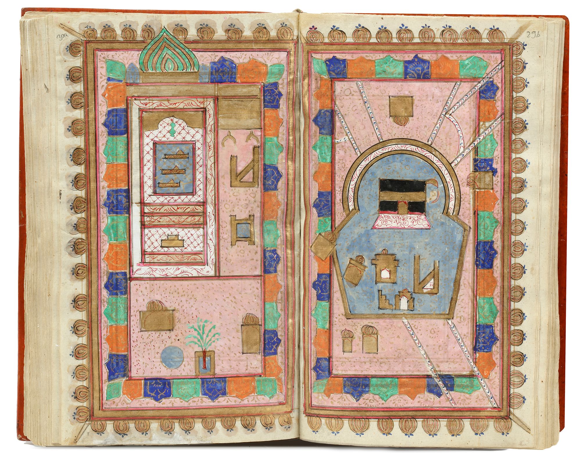 Arabic manuscript on paper, 149 leaves, 9 lines to the page written in naskhi script in black ink within stylized cloud bands on a gold ground, double inner margins ruled in blue and gold sandwiching floral motifs in gold, significant words picked out in red with further marginal commentaries in red within cloud bands, one double-page frontispiece (marking the opening of prayers preceding main text) in characteristic Kashmiri illumination in blue, gold and pink, with text on gold ground and margins filled with floral motifs in gold. A further headpiece in a similar style, several further illuminated headings throughout the text, two diagrams in colors and gold of the holy sanctuaries at Mecca and Medina, Kashmiri painted papier-mache binding in polychrome, doublures painted red, spine rebacked. 18.2 cm by 15 cm.